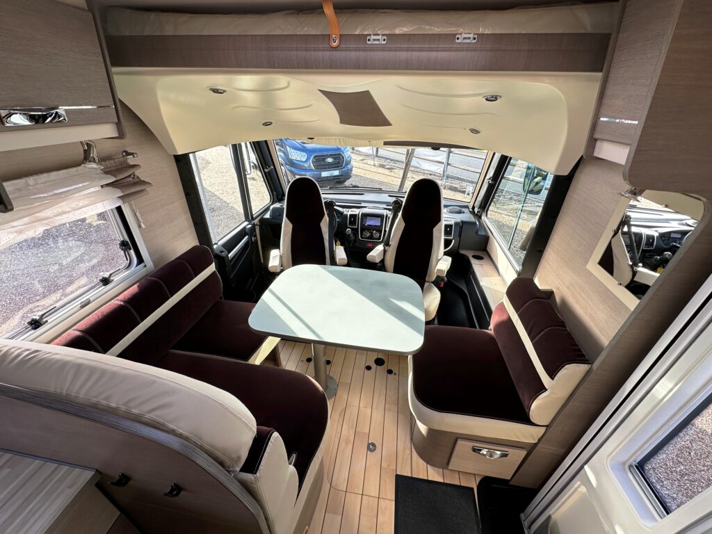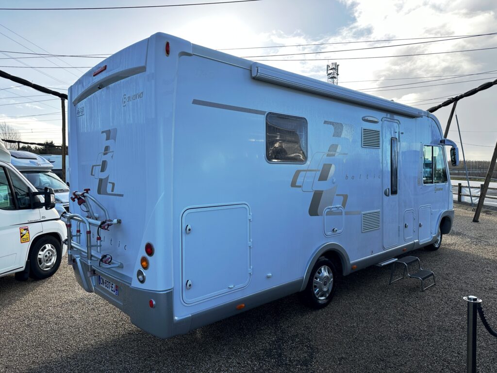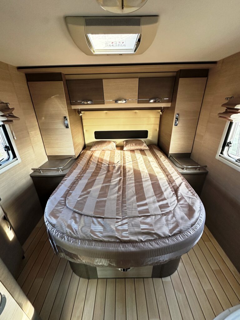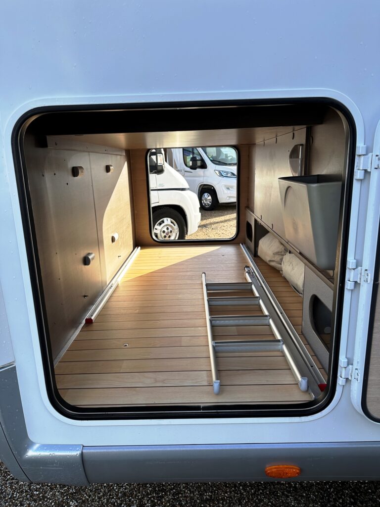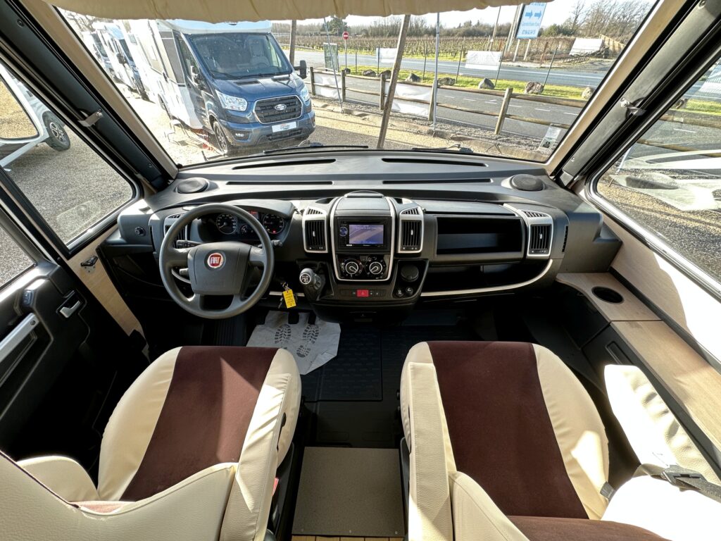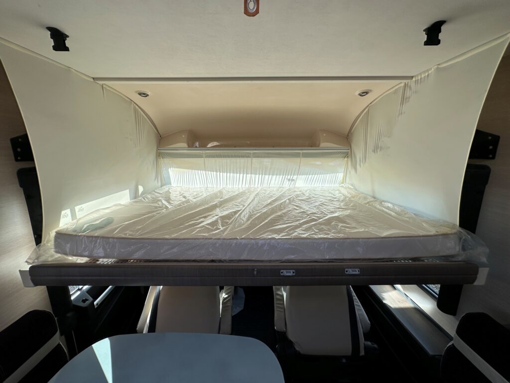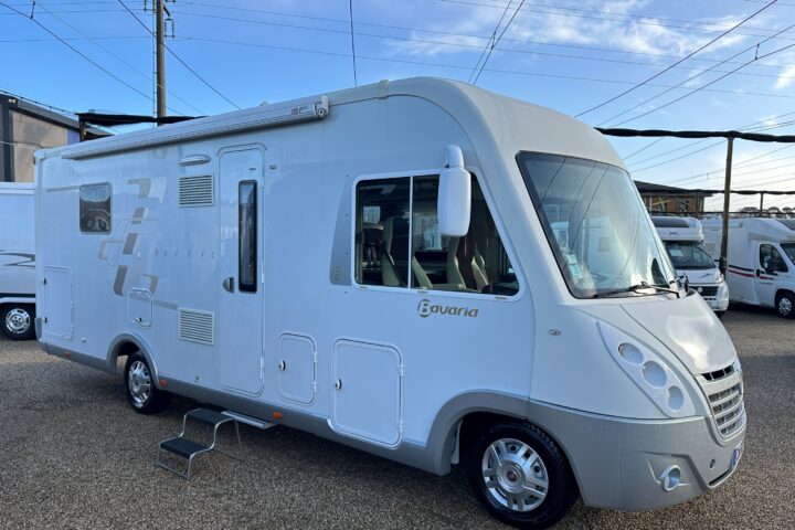 Intégral Bavaria, lit central sur soute, 4 couchages, salle de bain avec grande douche entièrement séparée, fermeture chambre arrière, cuisine spacieuse et toute équipée, vaste salon avant avec sièges pivotant et table centrale, lit pavillon en cabine pour deux adultes.