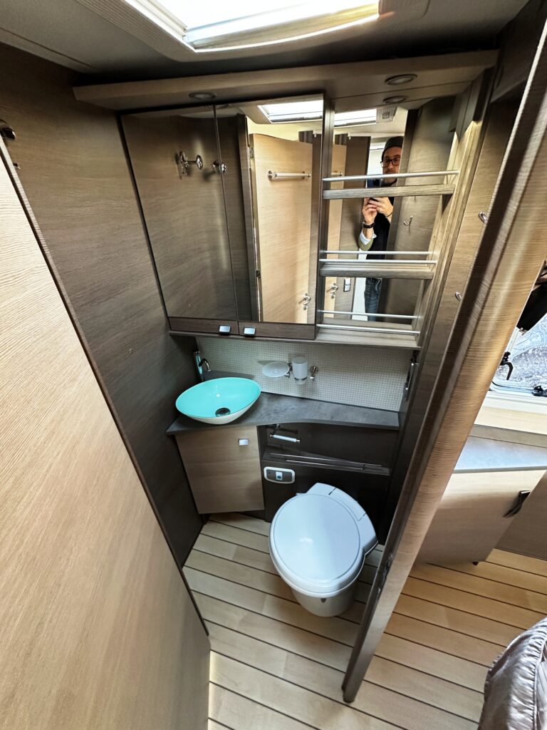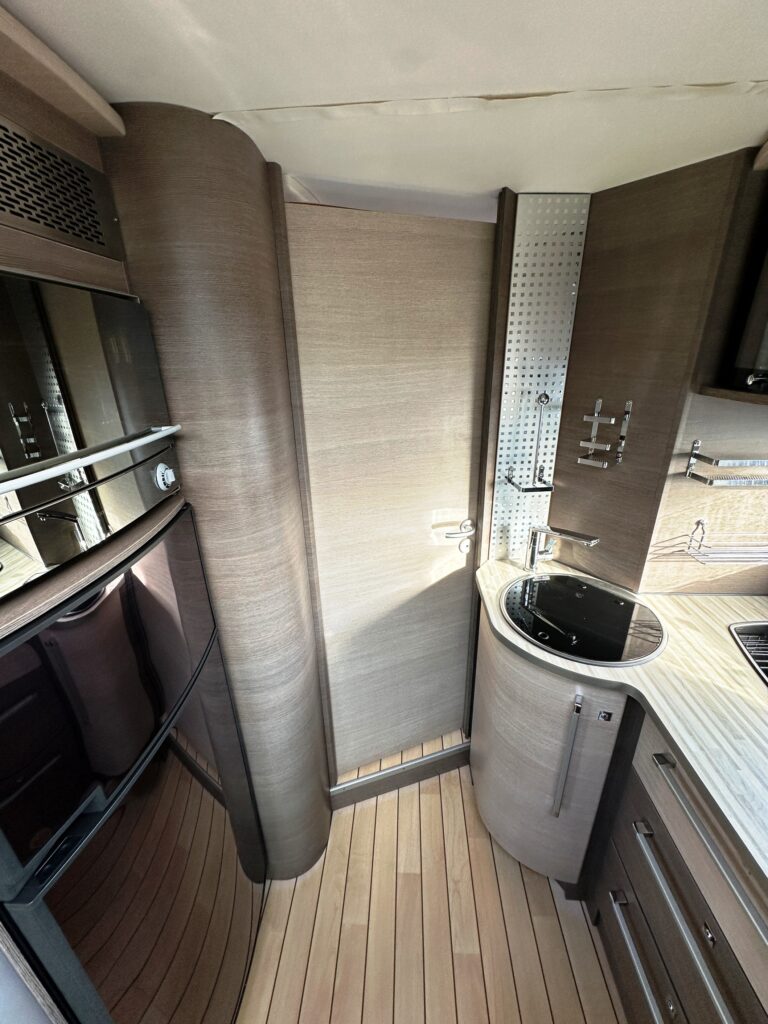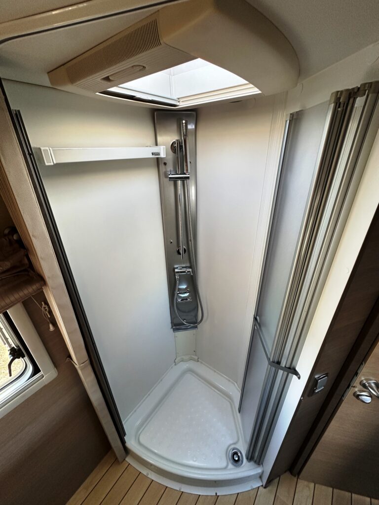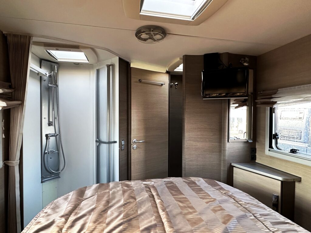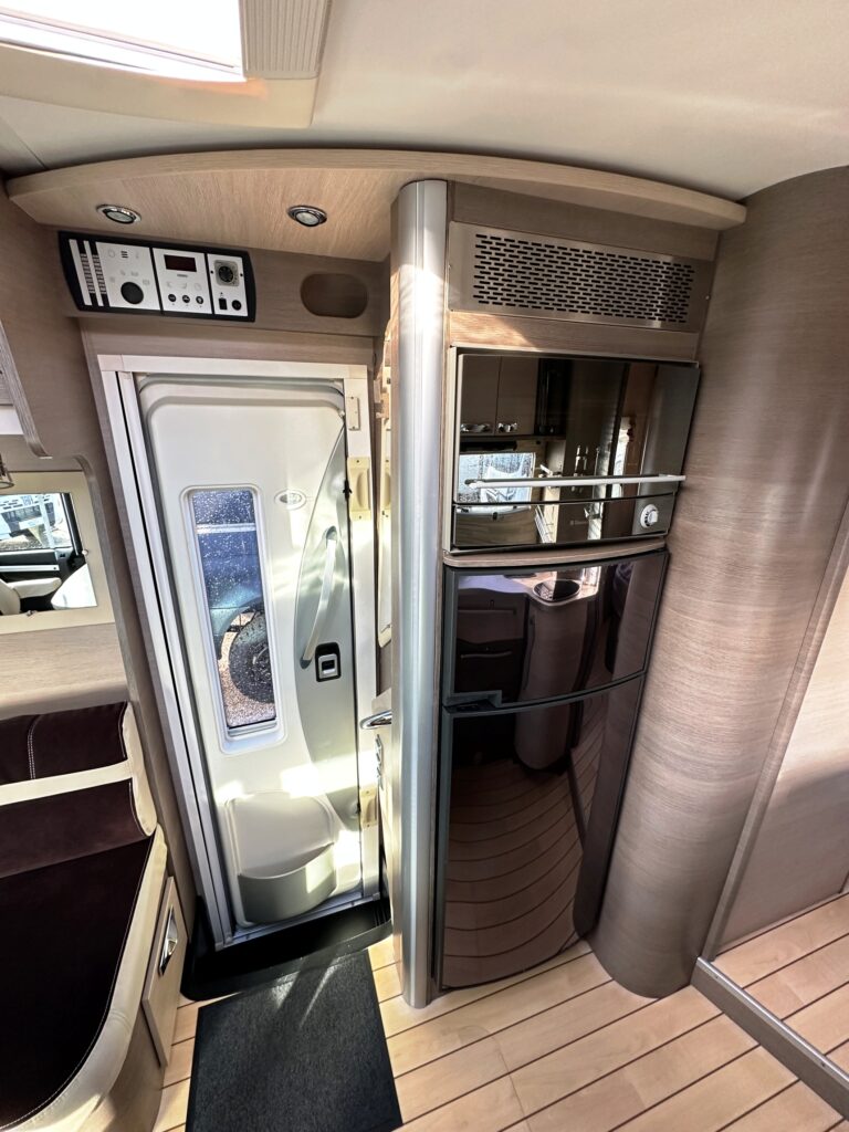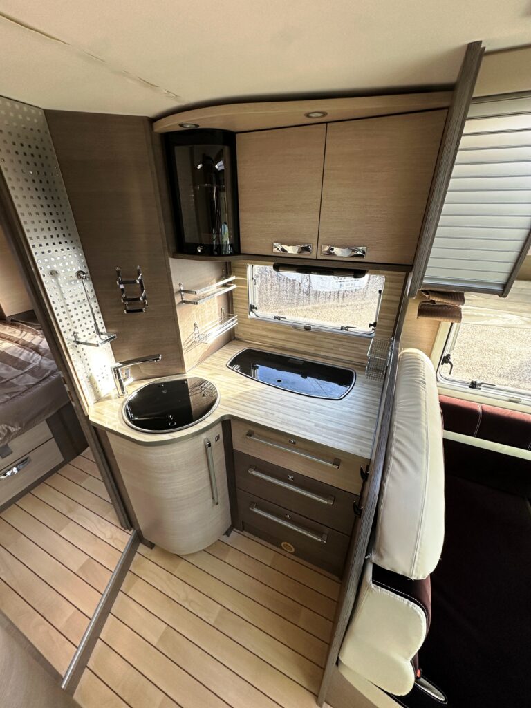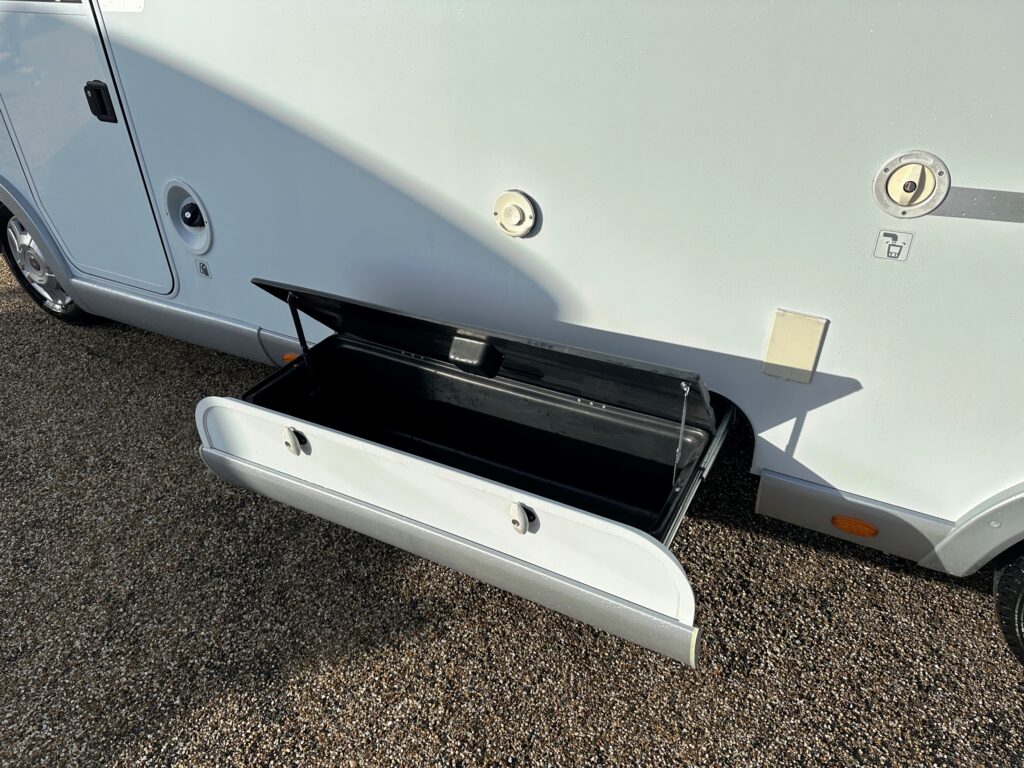 Intégral Bavaria, lit central sur soute, 4 couchages, salle de bain avec grande douche entièrement séparée, fermeture chambre arrière, cuisine spacieuse et toute équipée, vaste salon avant avec sièges pivotant et table centrale, lit pavillon en cabine pour deux adultes.