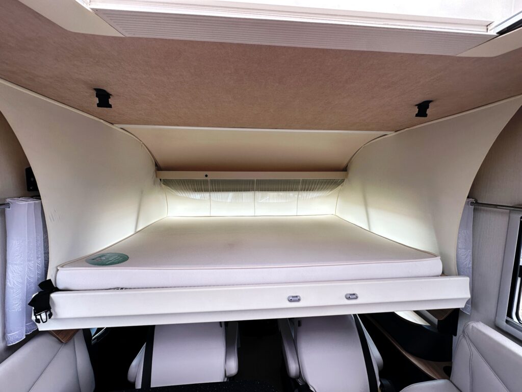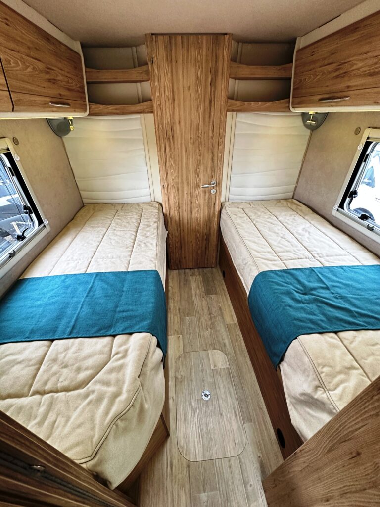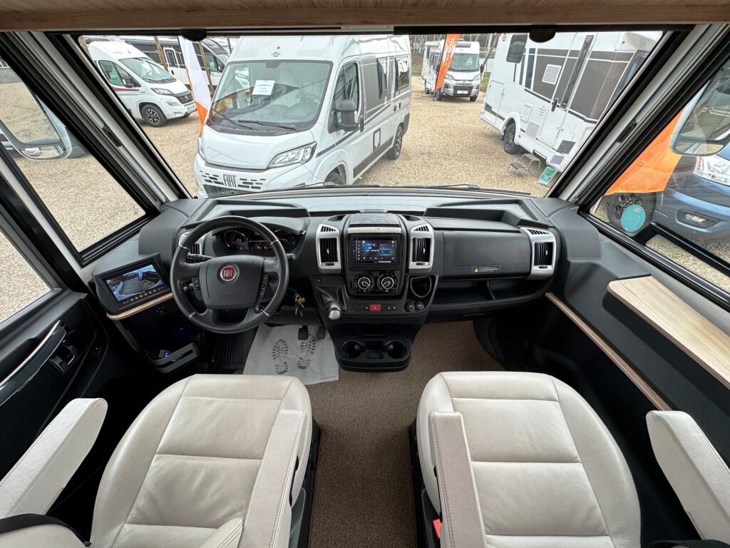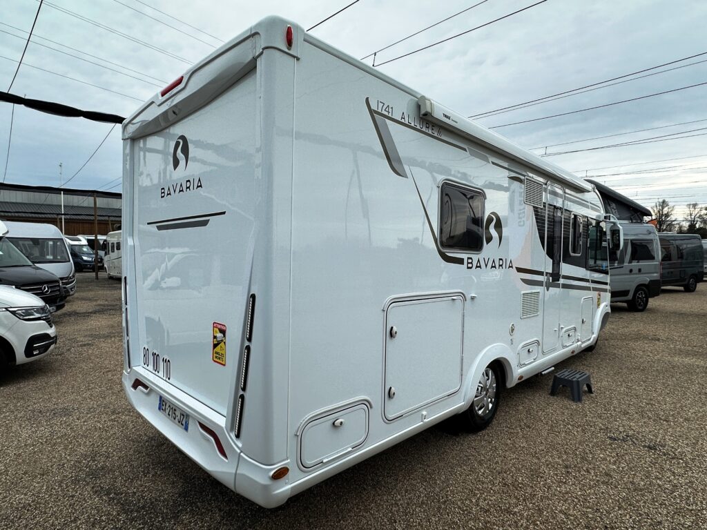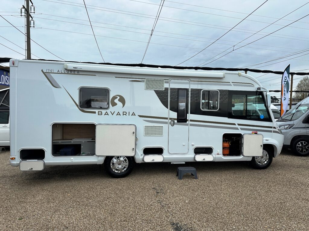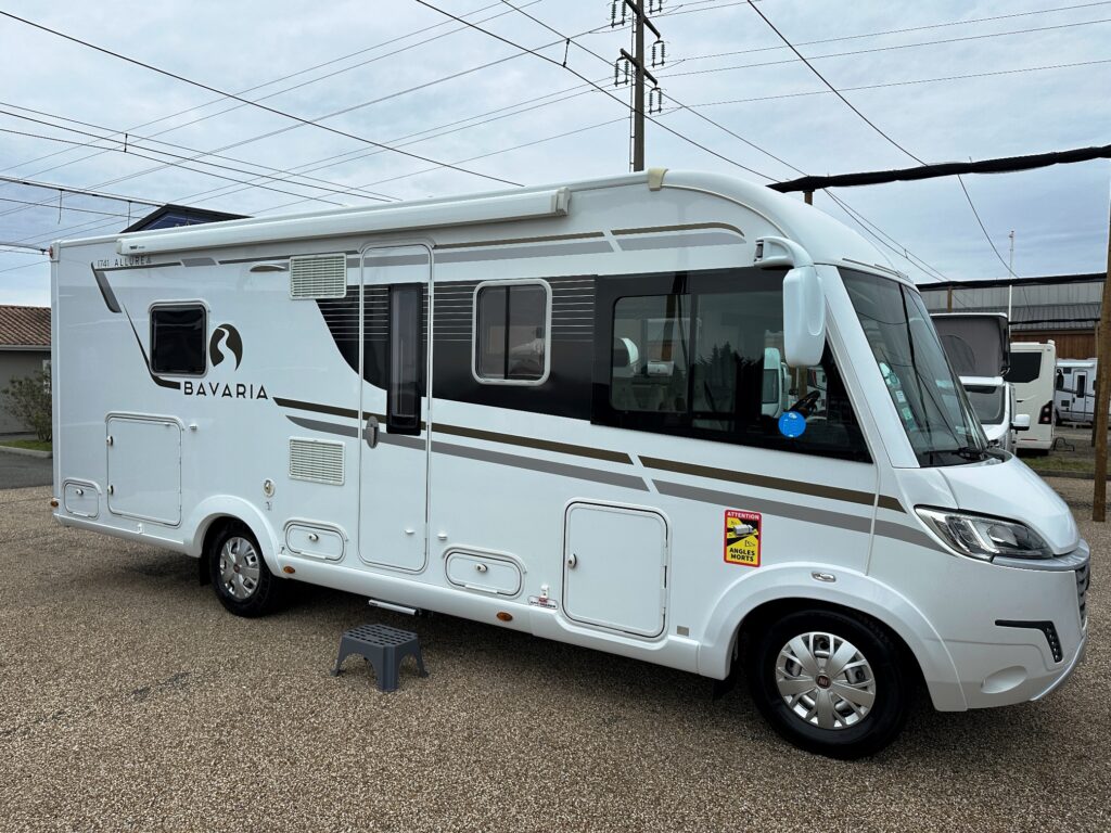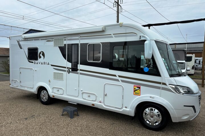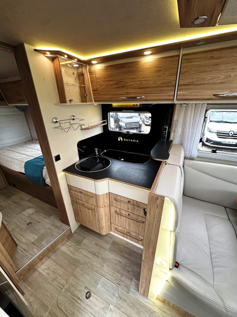 Intégral Bavaria, lits jumeaux, 4 couchages, salle de bain avec grande douche entièrement séparée, fermeture chambre arrière, cuisine spacieuse et toute équipée, vaste salon avant avec sièges pivotant et table centrale + lit pavillon en cabine pour deux adultes.