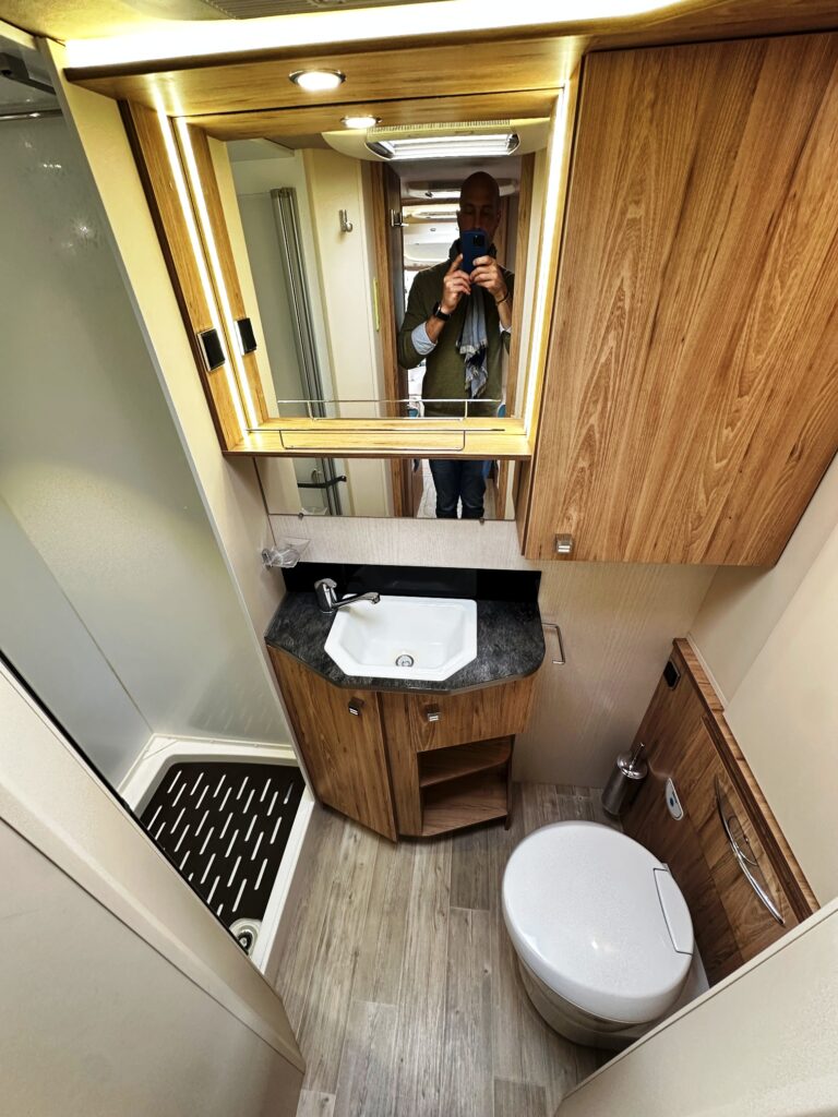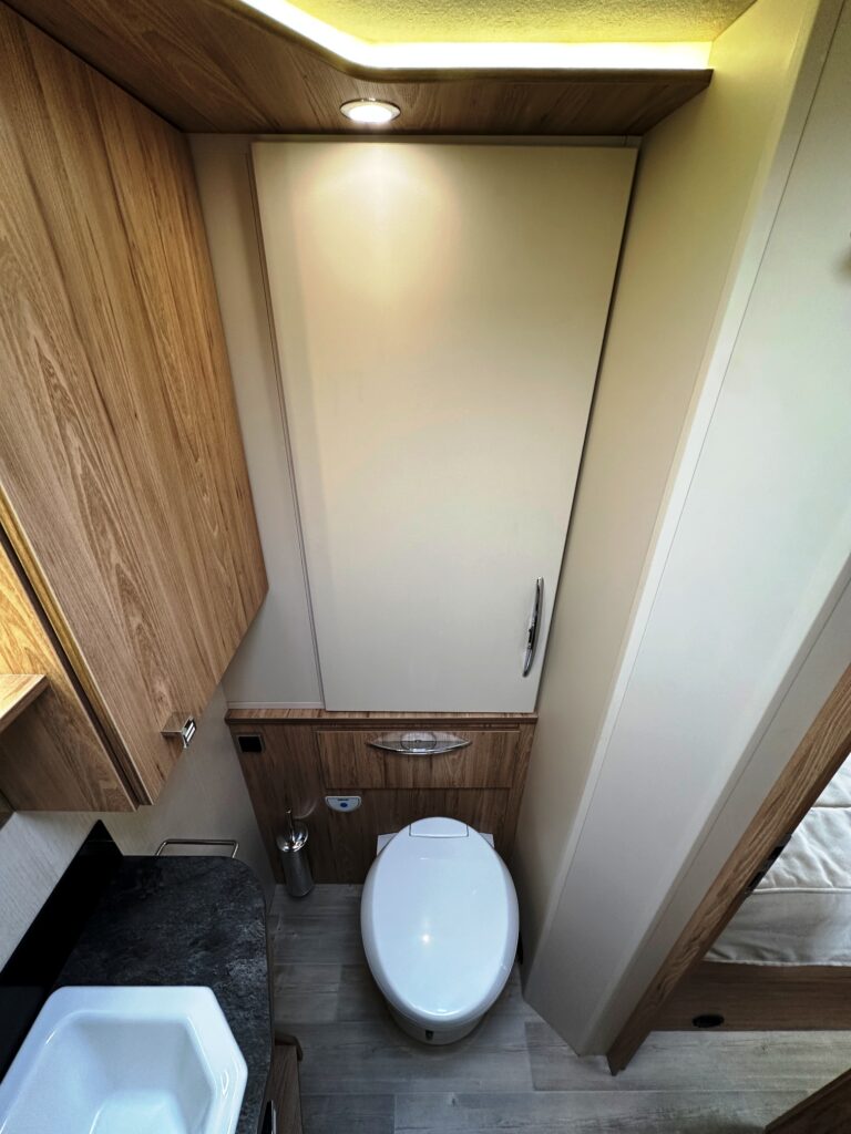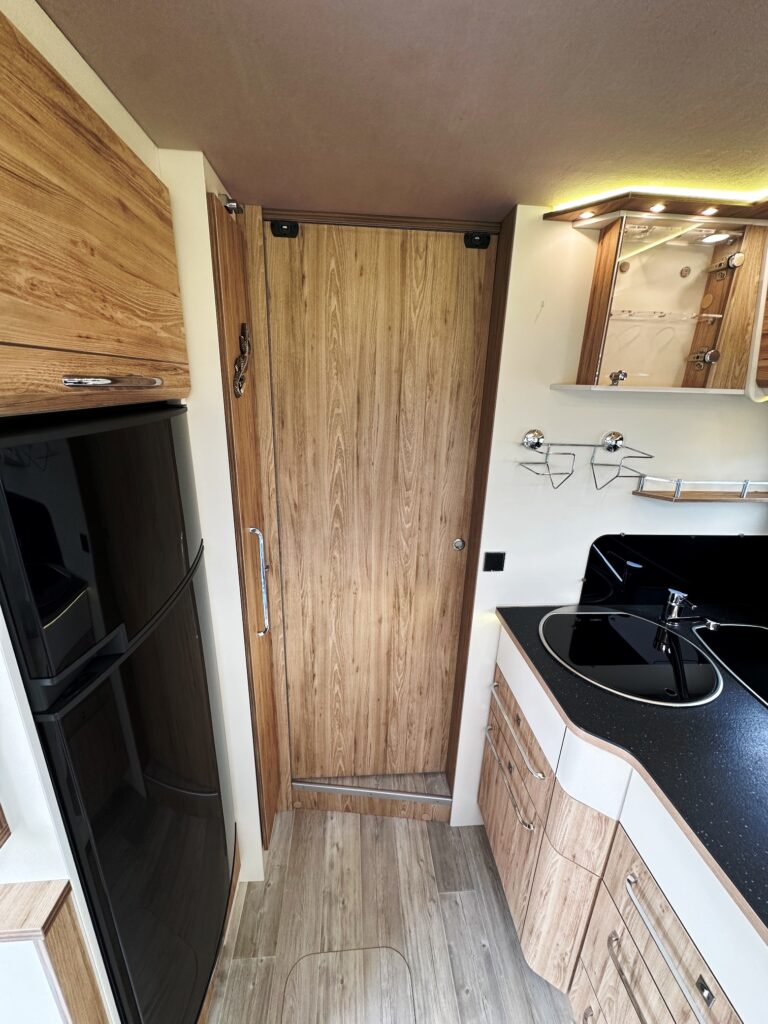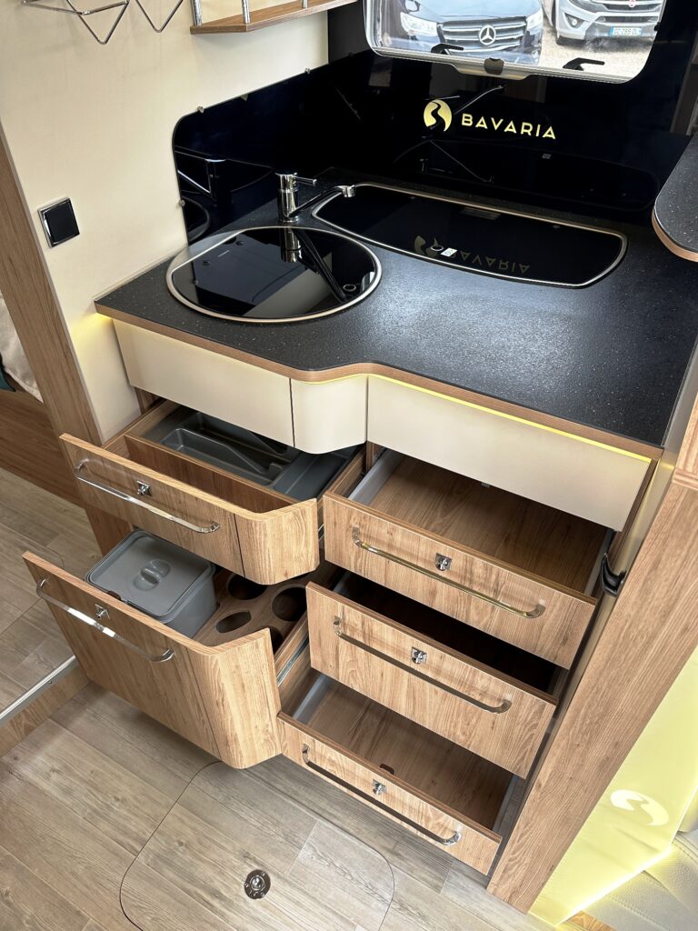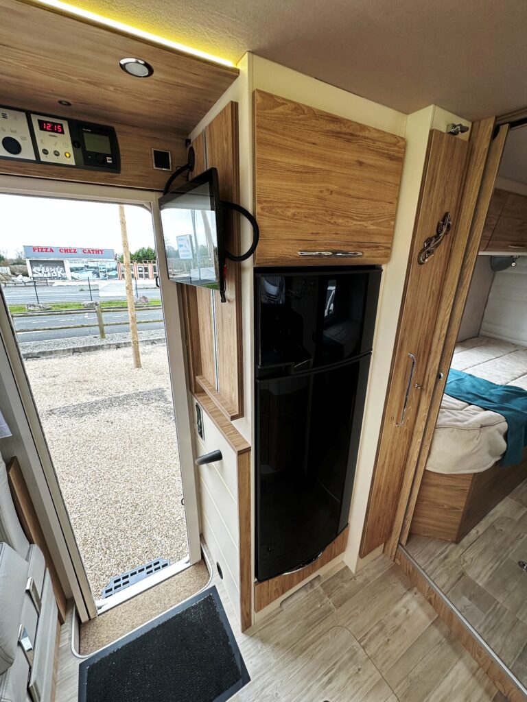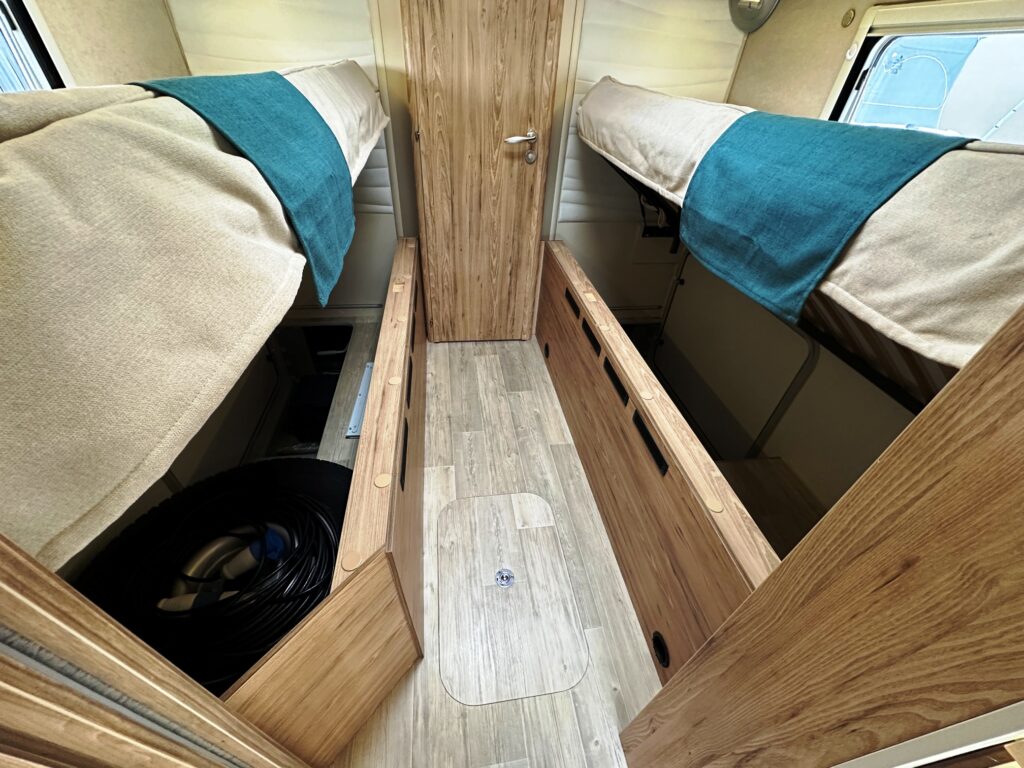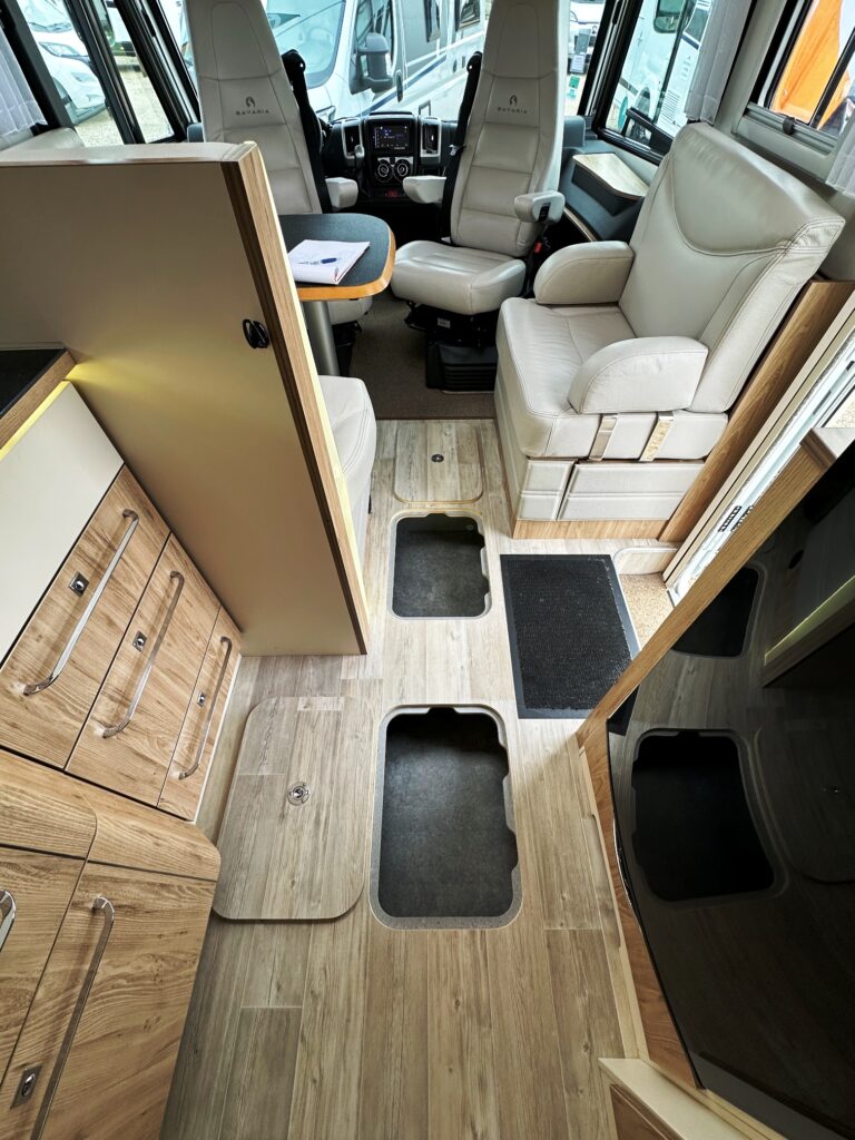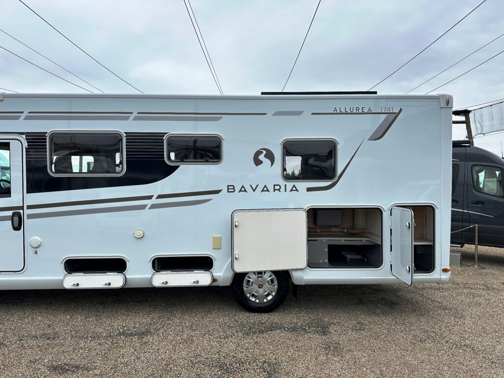 Intégral Bavaria, lits jumeaux, 4 couchages, salle de bain avec grande douche entièrement séparée, fermeture chambre arrière, cuisine spacieuse et toute équipée, vaste salon avant avec sièges pivotant et table centrale + lit pavillon en cabine pour deux adultes.