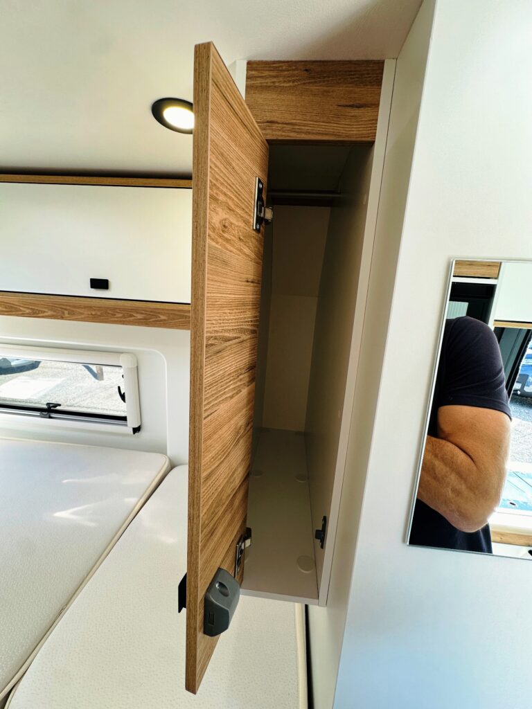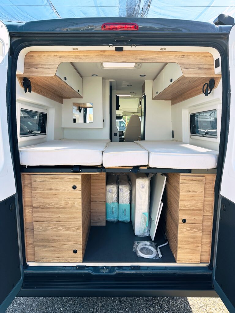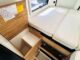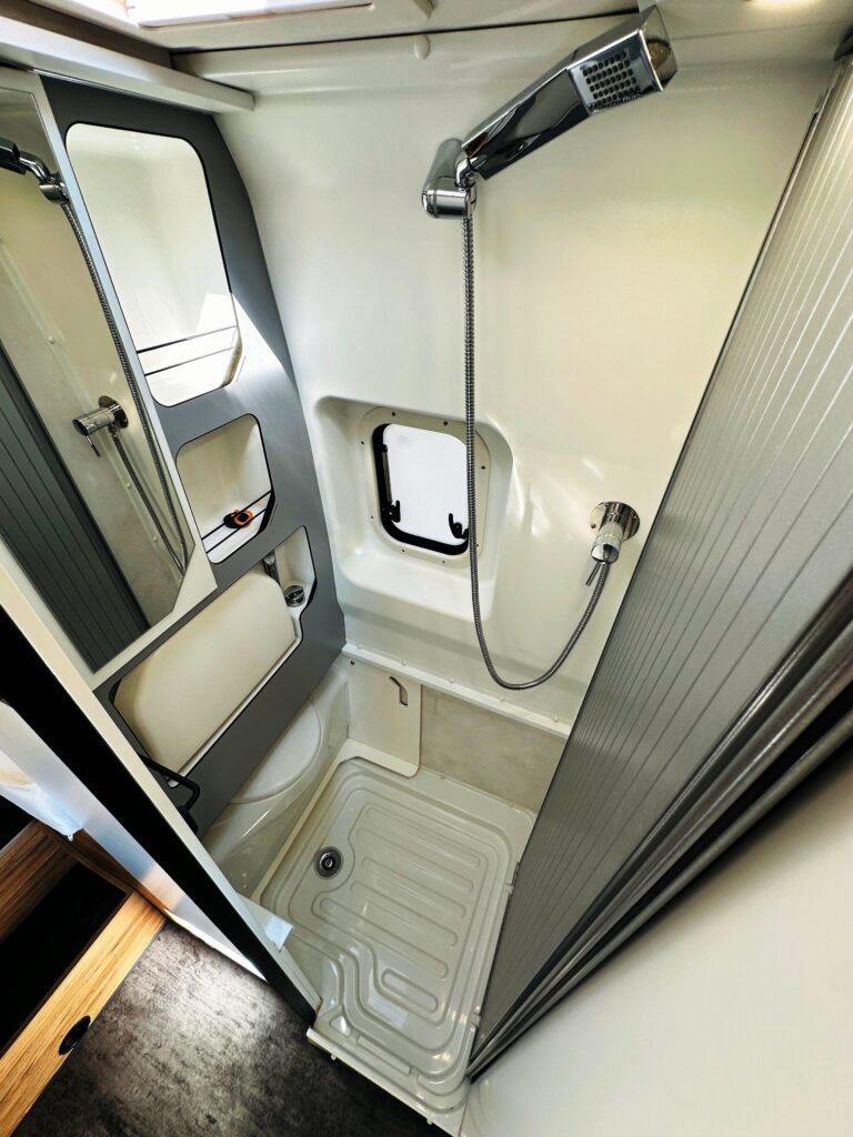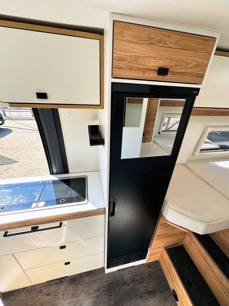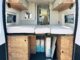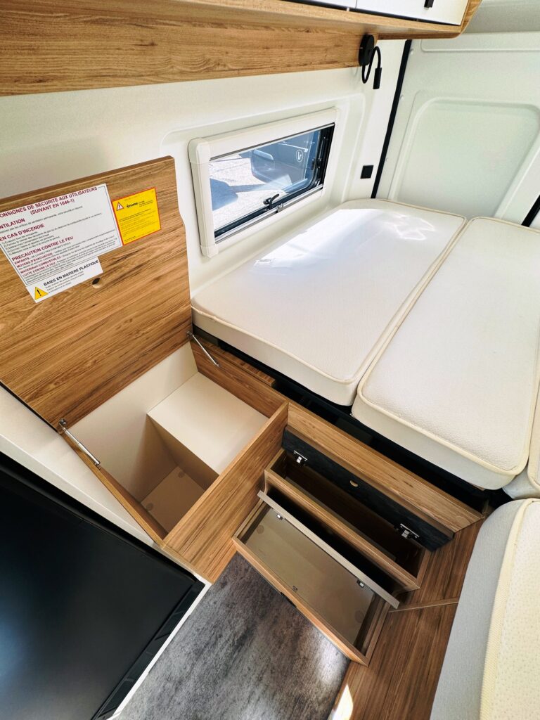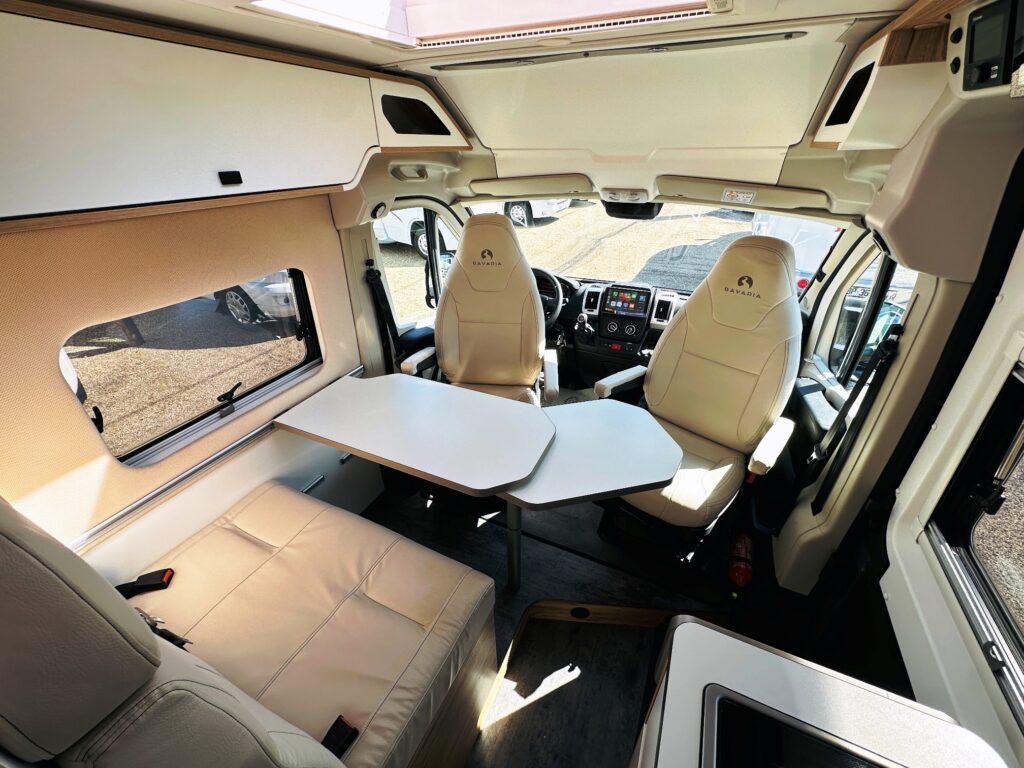 Fourgon Bavaria (6.36 M), lits jumeaux (possibilité de dégager le couloir), salle de bain modulable convertible en vaste douche, salon avant avec sièges pivotant, table centrale, cuisine droite équipée de nombreux rangements, d’un plan de travail amovible et d’un grand frigo par compression.