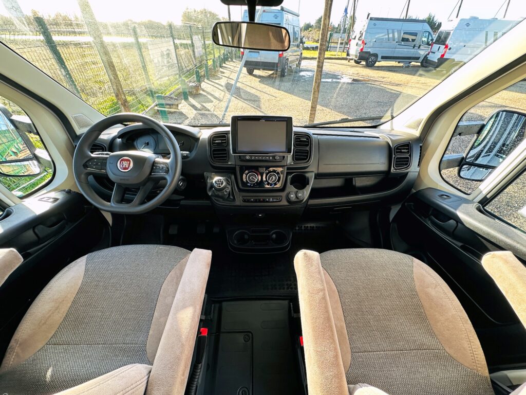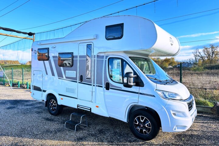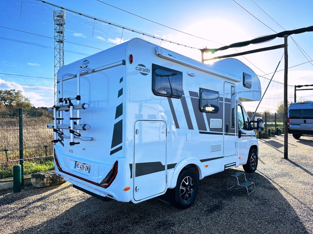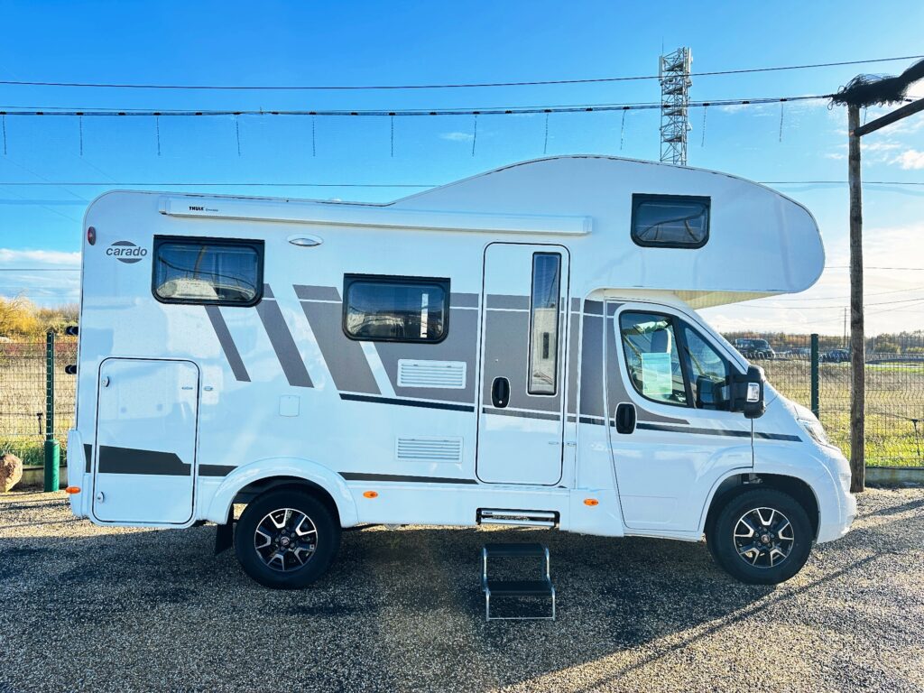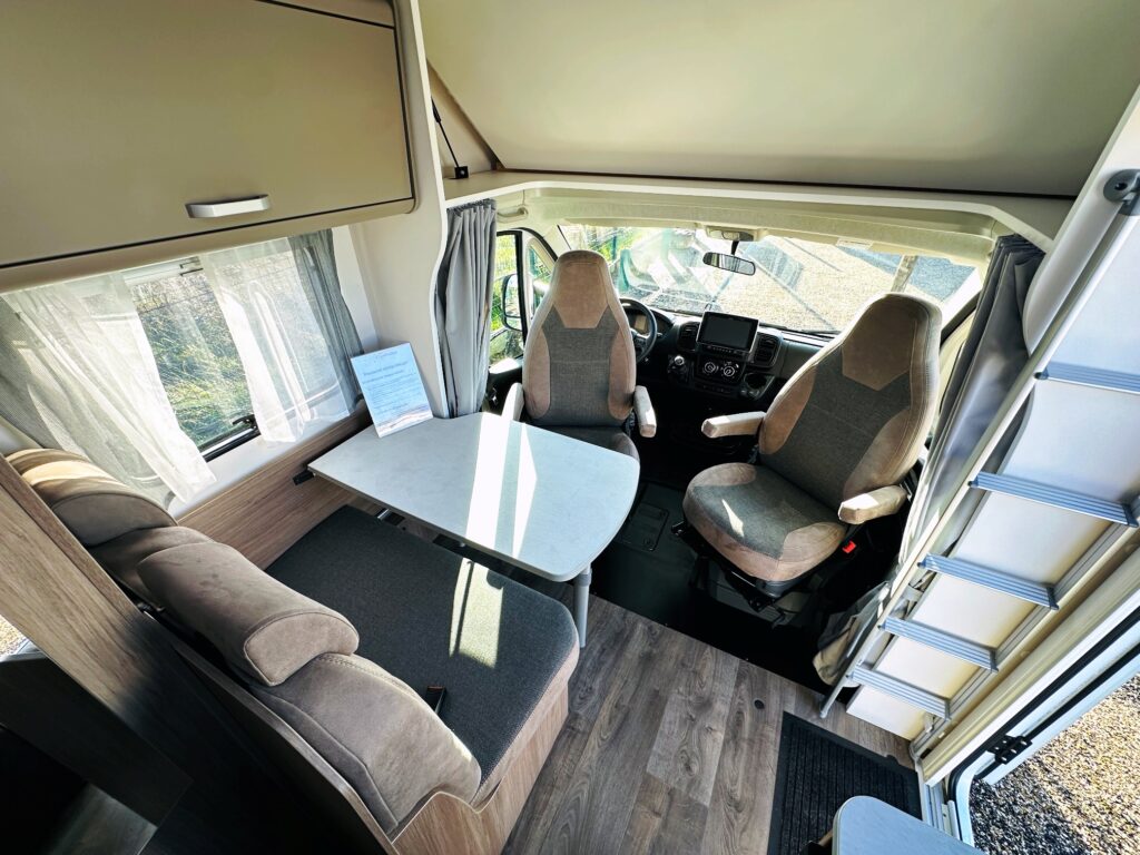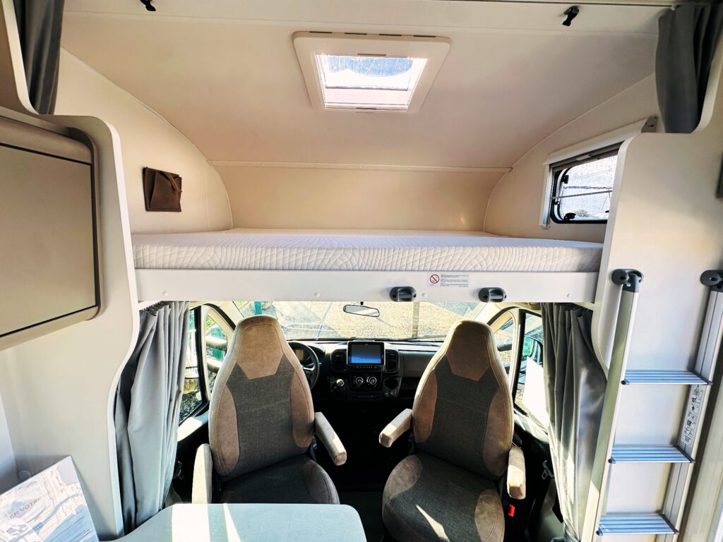 Capucine Carado, 4 couchages, lit sur soute garage (plusieurs vélos adultes), salle de bain vario convertible en douche indépendante, cuisine spacieuse et toute équipée, salon avant avec sièges pivotant et banquette face route (Isofix), immense capucine en cabine avec lit en 160 cm