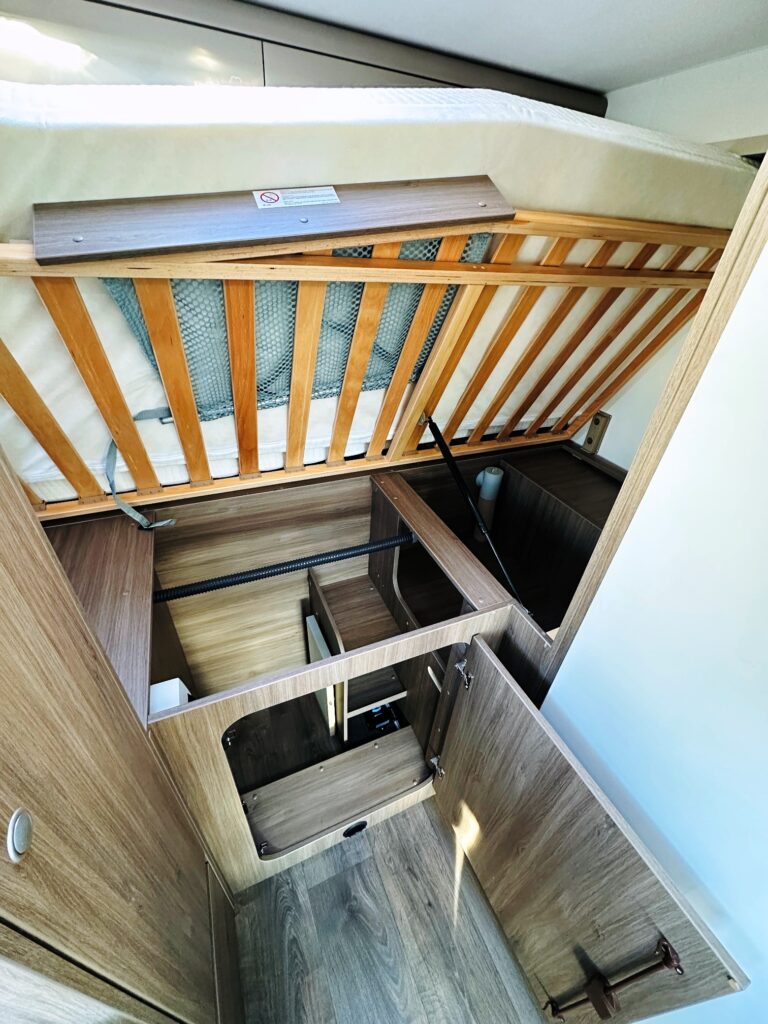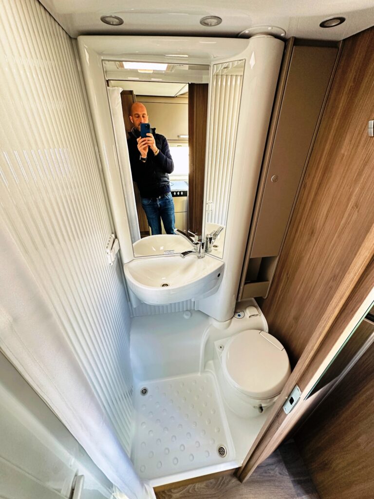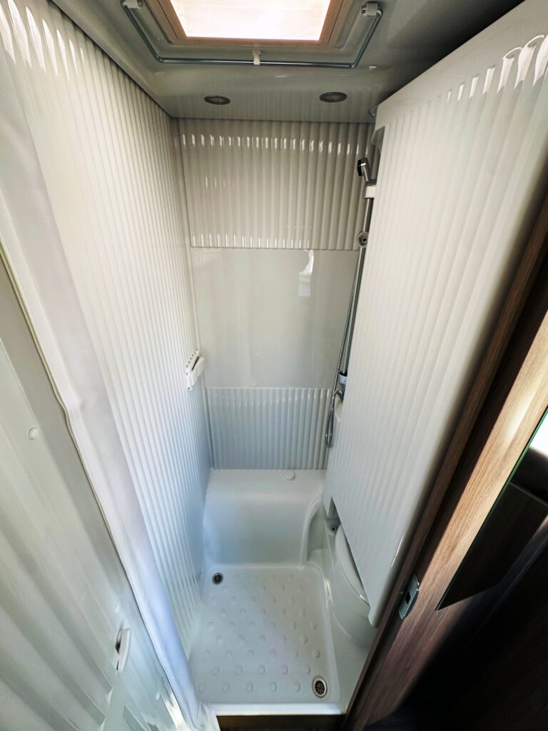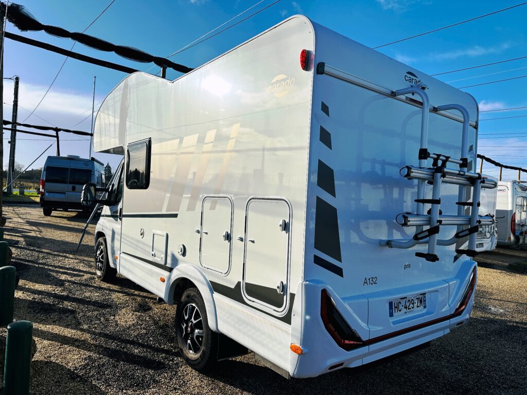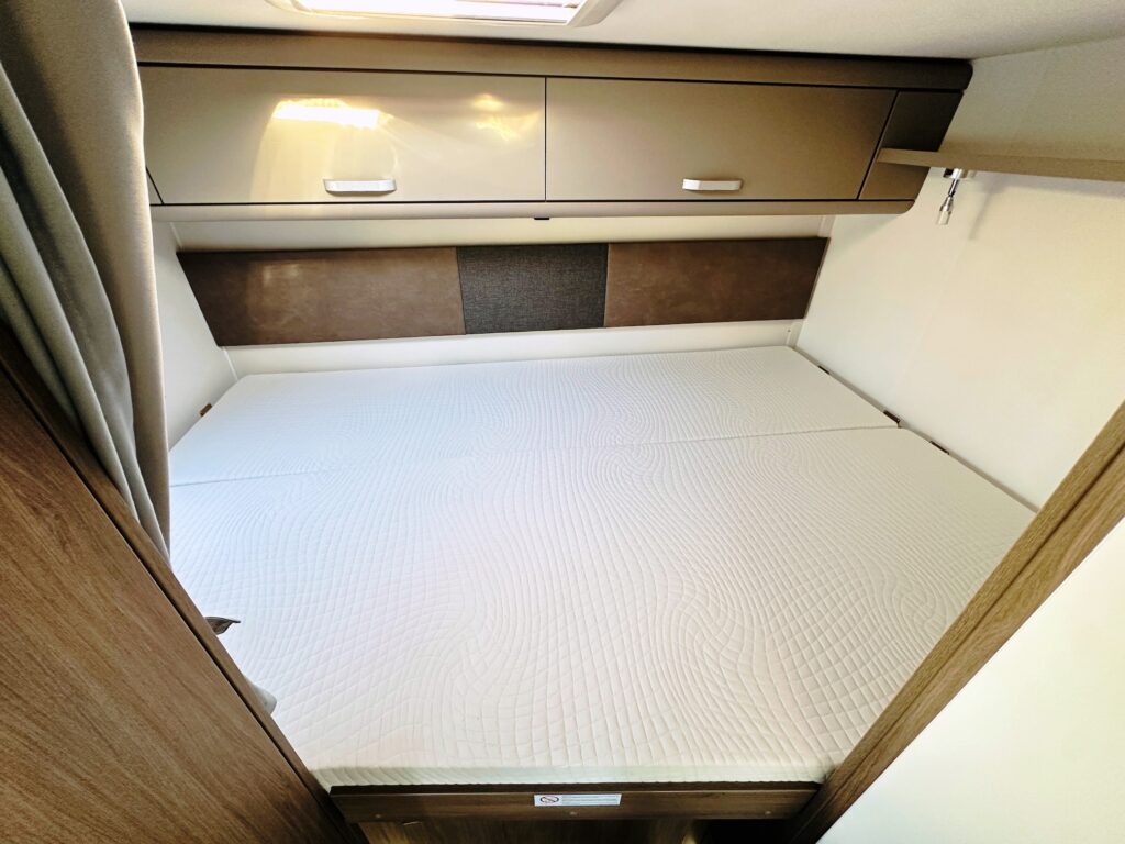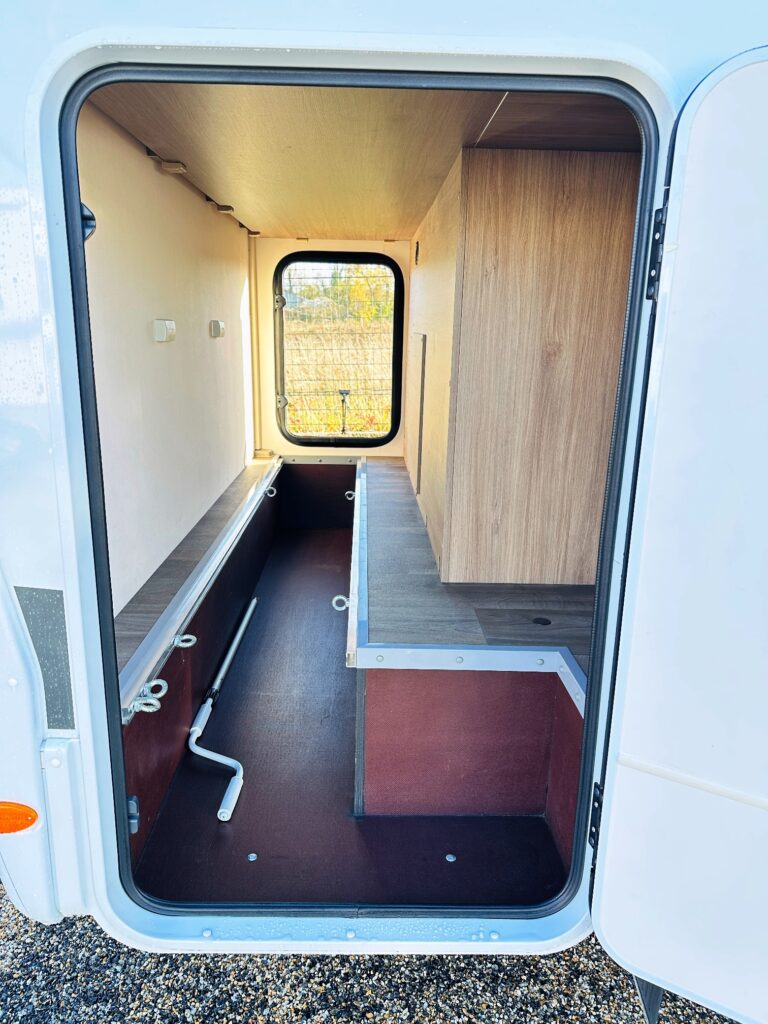 Capucine Carado, 4 couchages, lit sur soute garage (plusieurs vélos adultes), salle de bain vario convertible en douche indépendante, cuisine spacieuse et toute équipée, salon avant avec sièges pivotant et banquette face route (Isofix), immense capucine en cabine avec lit en 160 cm
