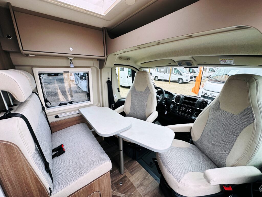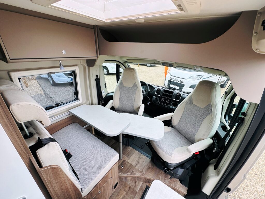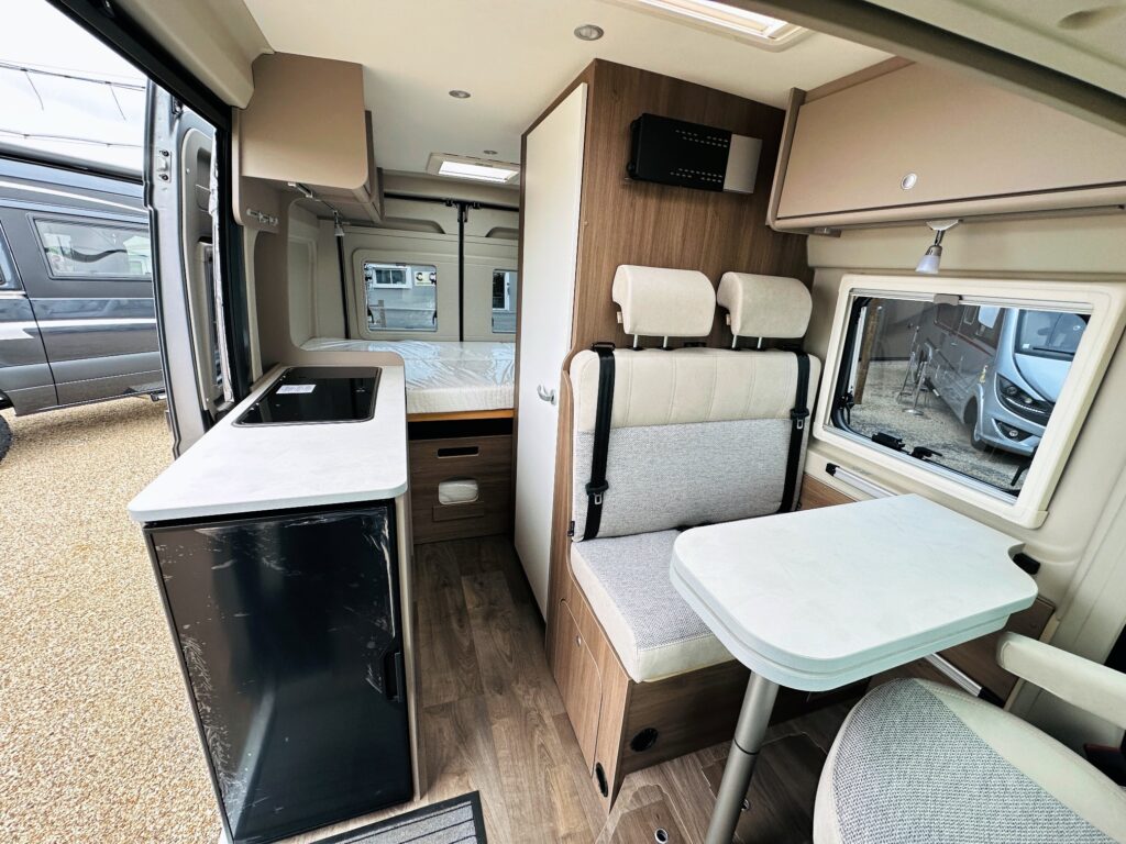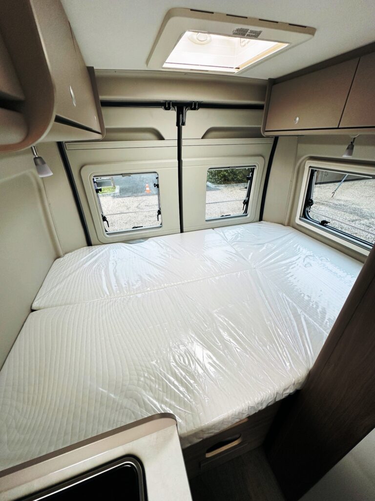 CARADO CV 540 PRO,  collection 2026, 5.40 M, 3 couchages, lit permanent arrière modulable (possibilité de dégager un vaste couloir), salle de bain avec douche intégrée et plan de travail, salon avant avec sièges pivotant. Cuisine droite équipée de nombreux rangements et d’un vaste plan de travail.
