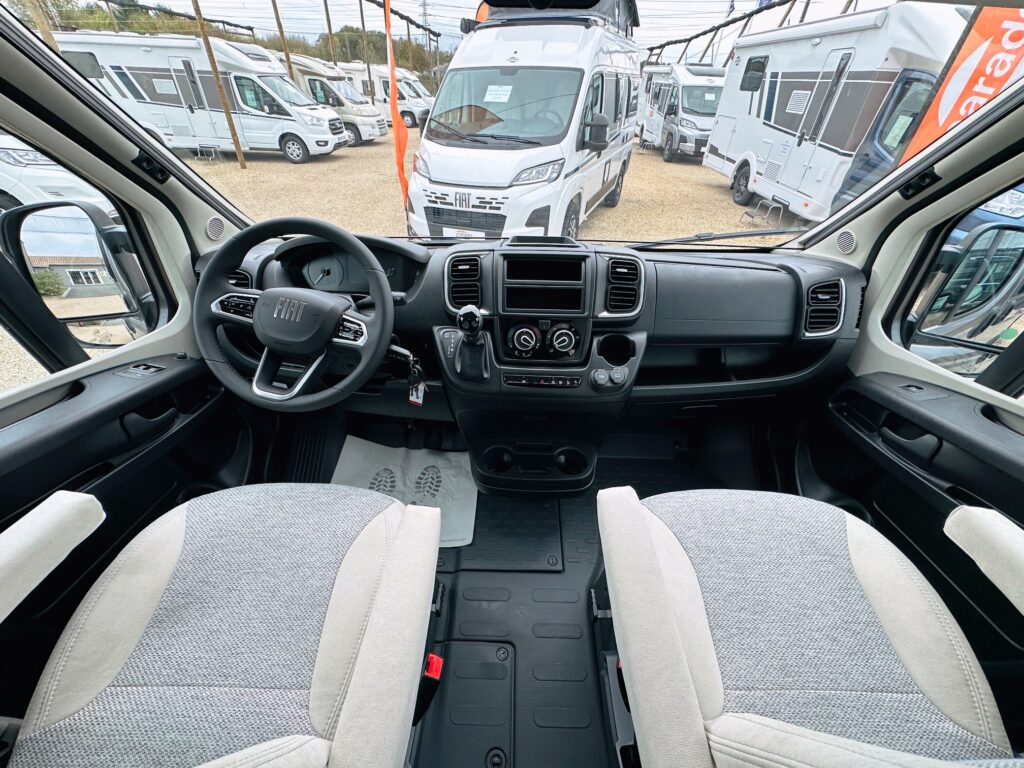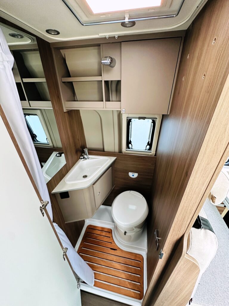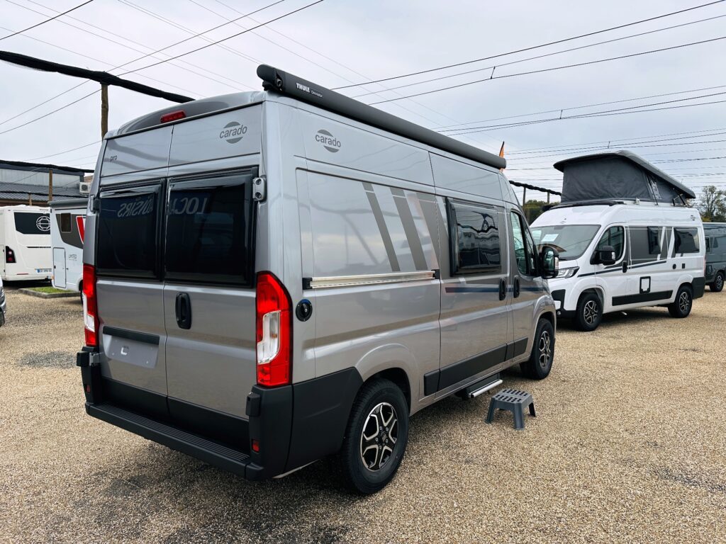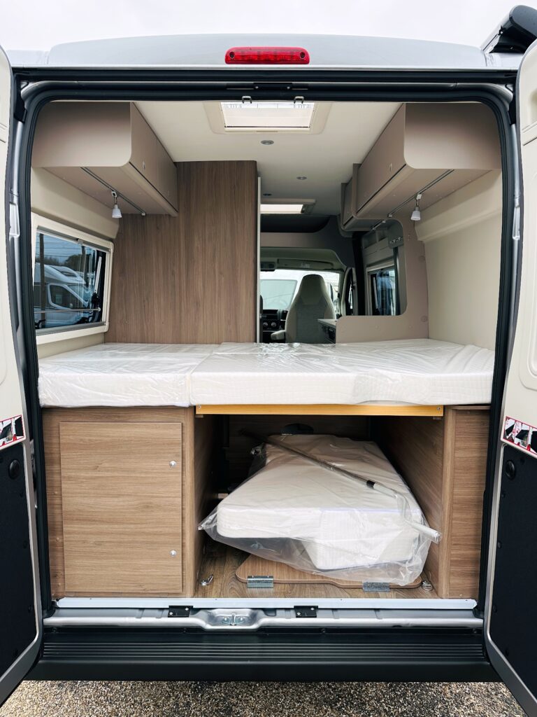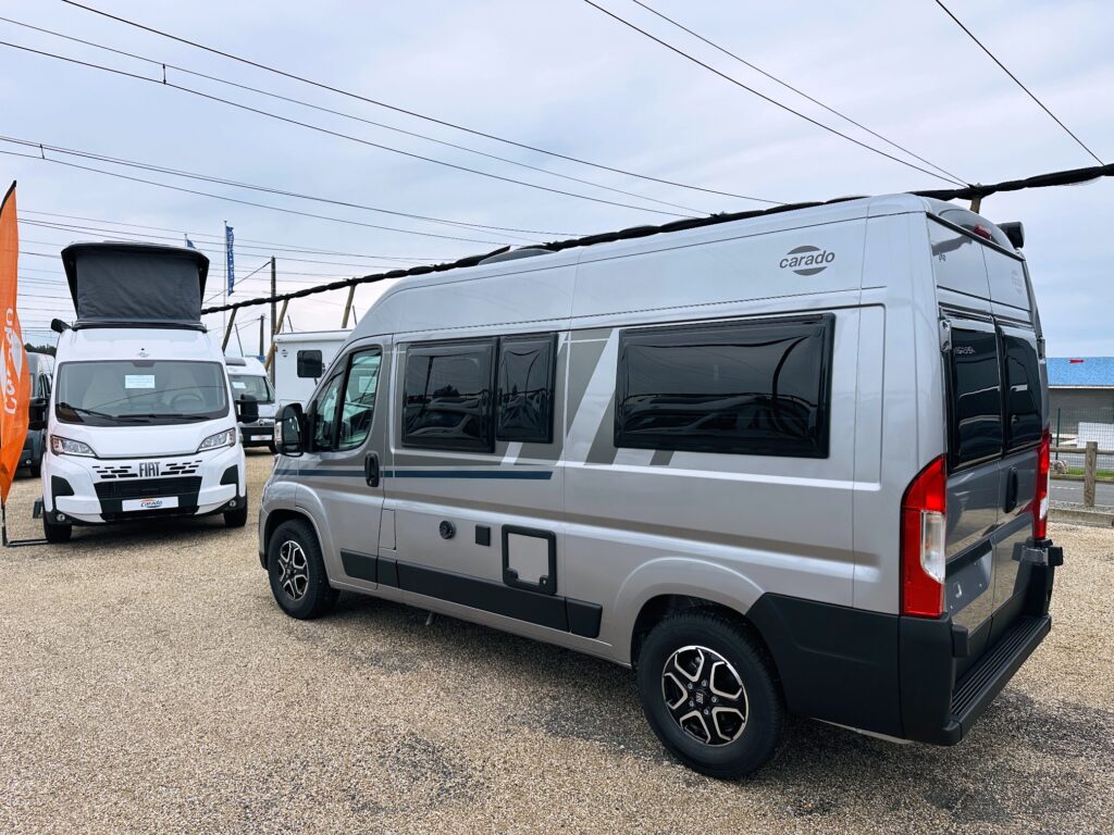 CARADO CV 540 PRO,  collection 2026, 5.40 M, 3 couchages, lit permanent arrière modulable (possibilité de dégager un vaste couloir), salle de bain avec douche intégrée et plan de travail, salon avant avec sièges pivotant. Cuisine droite équipée de nombreux rangements et d’un vaste plan de travail.