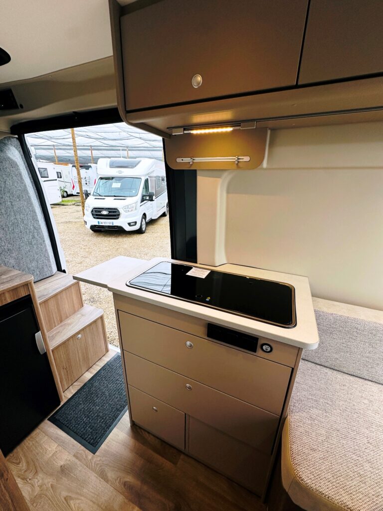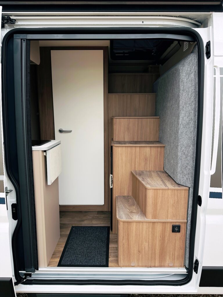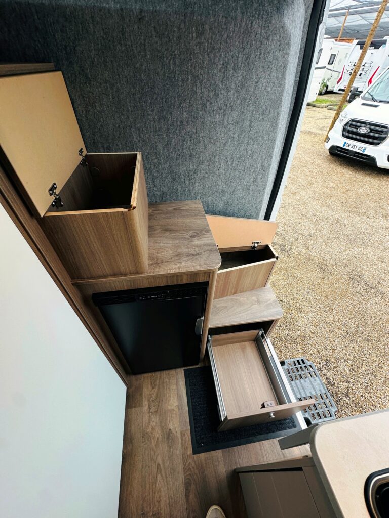 Plus qu’un simple accès, cet escalier intègre des rangements astucieux pour optimiser votre espace. Carado révolutionne vos nuits en van : l’accès à votre couchage n’a jamais été aussi simple et pratique.