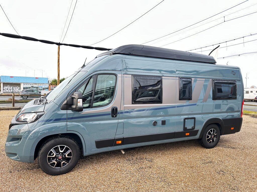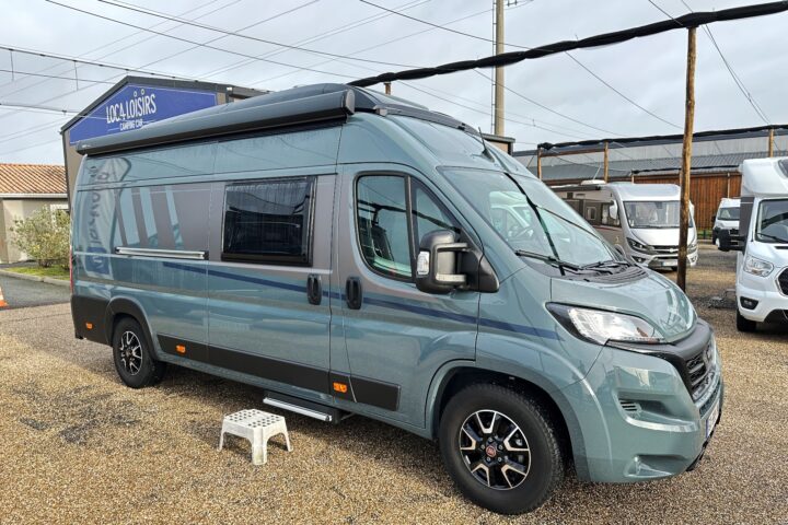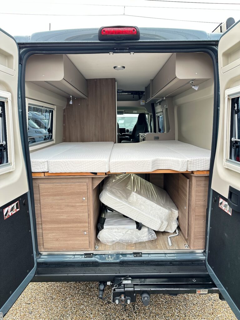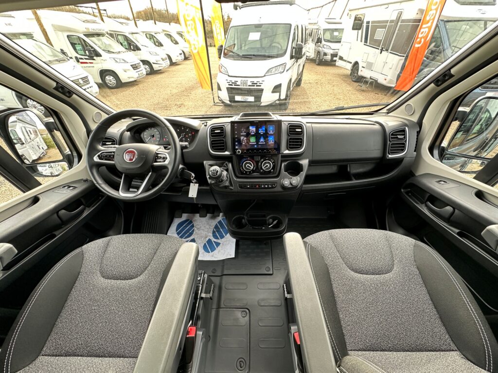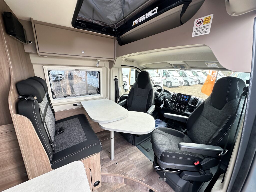 Fourgon Carado (6.36 M), lits jumeaux (possibilité de dégager le couloir), salle de bain avec douche intégrée, salon avant avec sièges pivotant, table centrale, cuisine droite équipée de nombreux rangements avec frigo par compression, toit relevable accueillant un vaste lit supplémentaire en 140×190 cm.