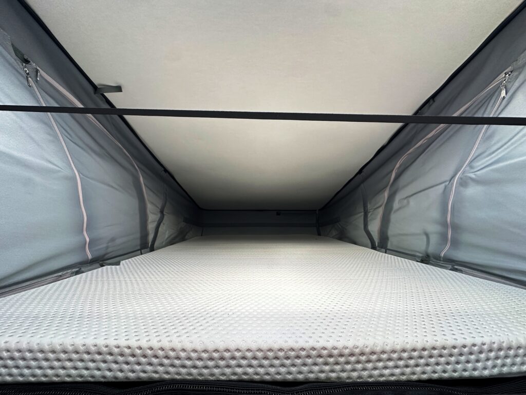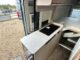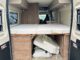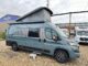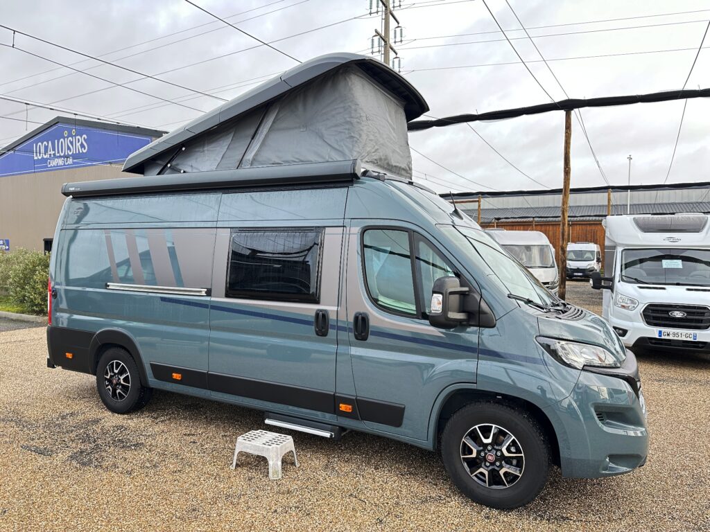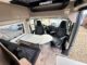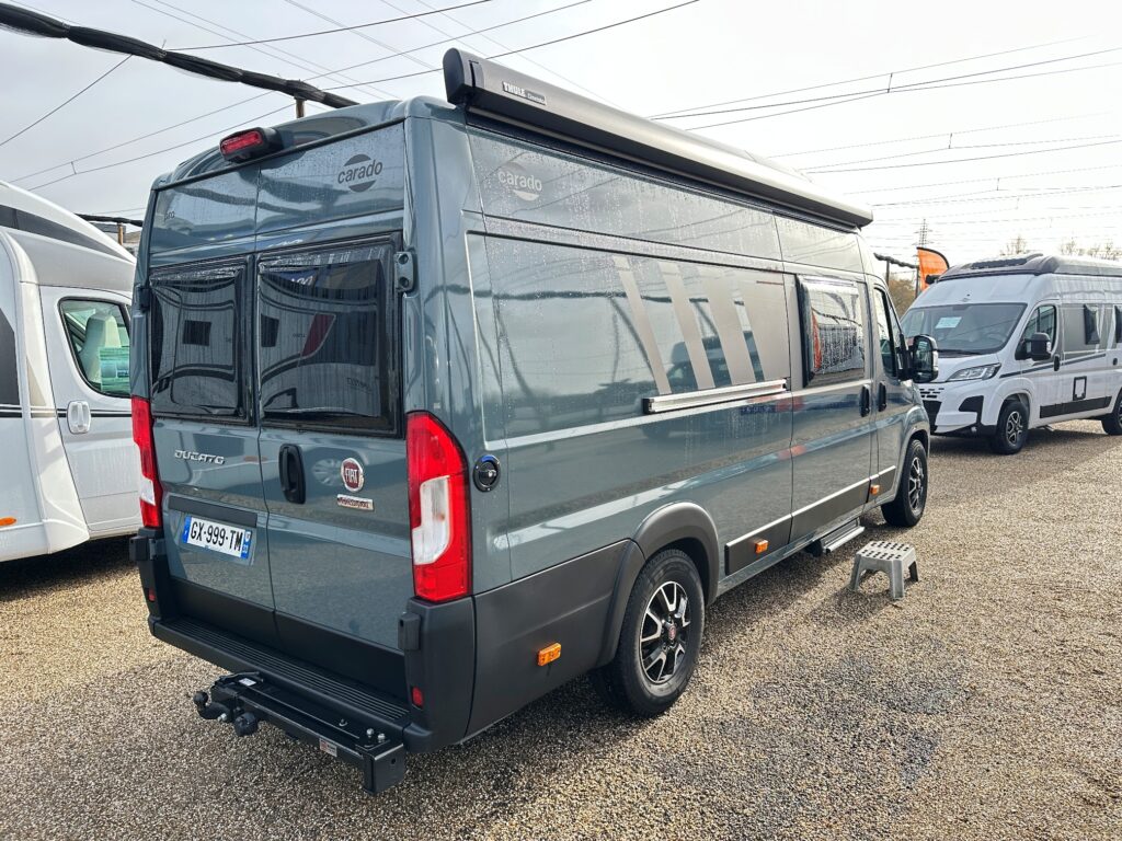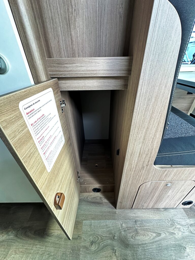 Fourgon Carado (6.36 M), lits jumeaux (possibilité de dégager le couloir), salle de bain avec douche intégrée, salon avant avec sièges pivotant, table centrale, cuisine droite équipée de nombreux rangements avec frigo par compression, toit relevable accueillant un vaste lit supplémentaire en 140×190 cm.