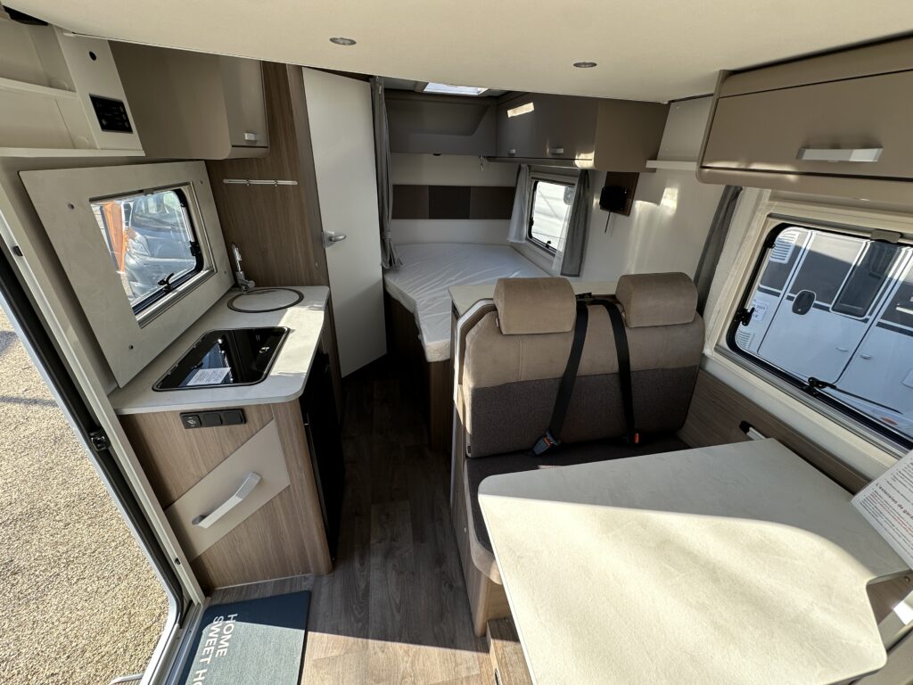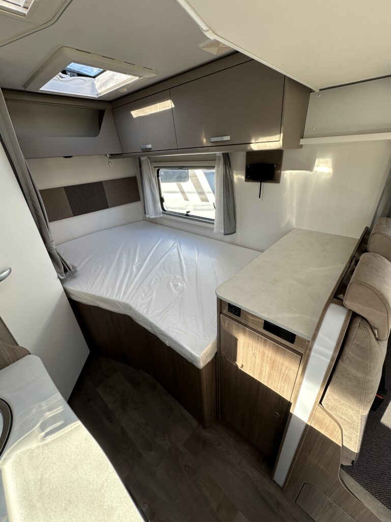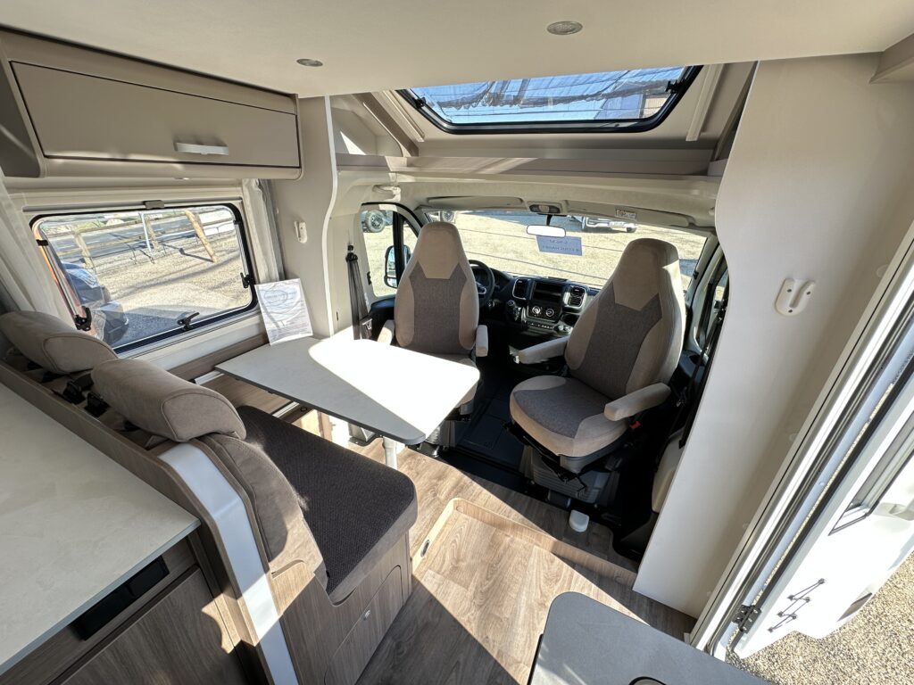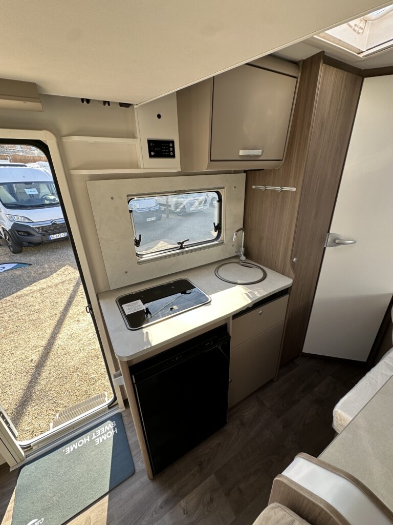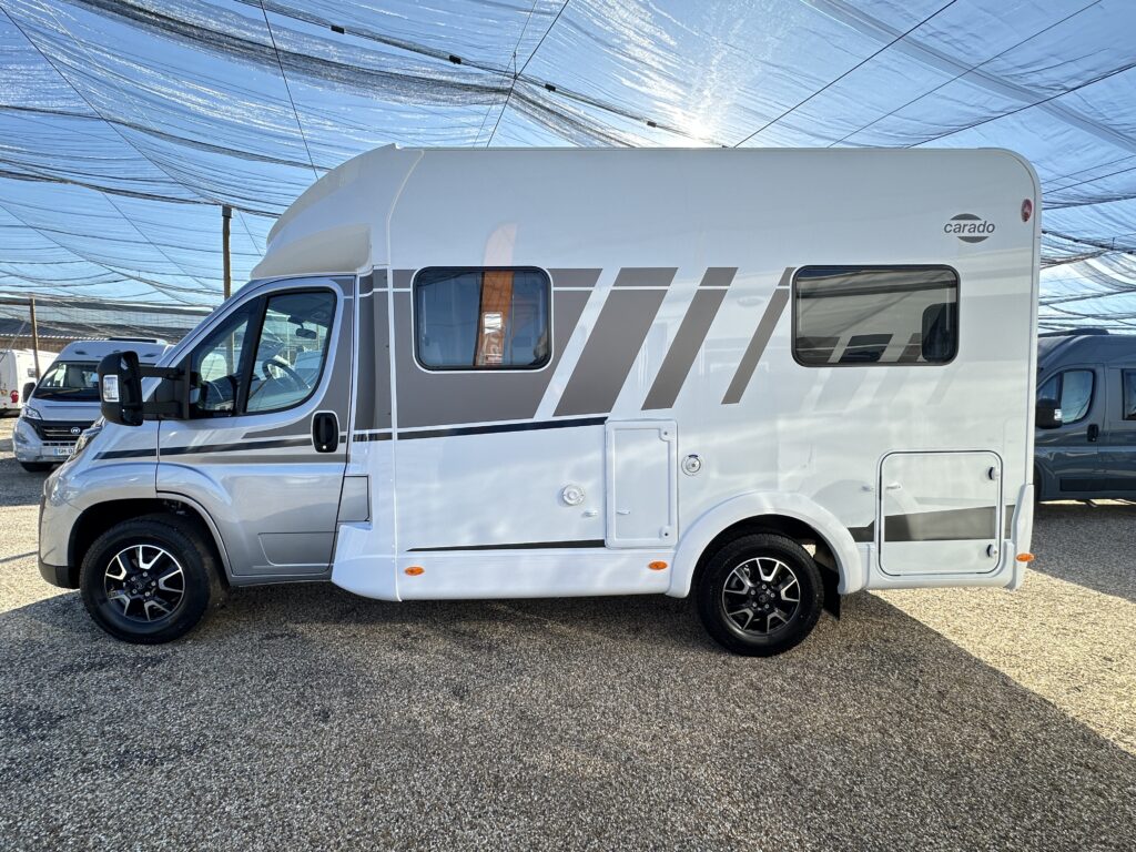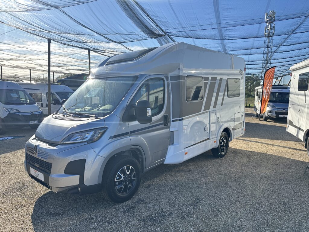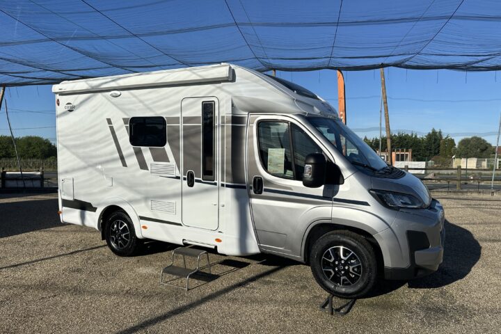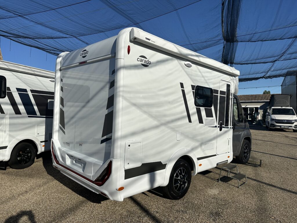 CARADO T 135 PRO +, collection 2026, 5.96 M, 4 couchages, lit permanent à la Française, salle de bain modulable convertible en vaste douche, salon avant avec sièges pivotant, surmonté d’un lit pavillon pour deux adultes, cuisine droite équipée de nombreux rangements.