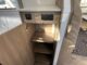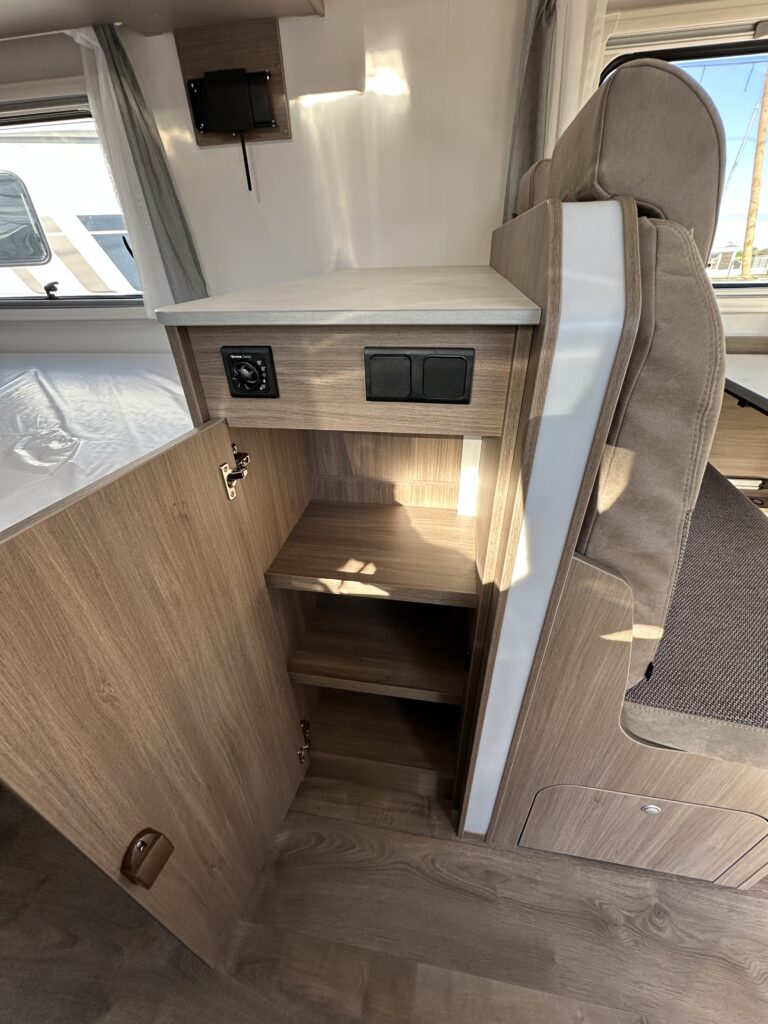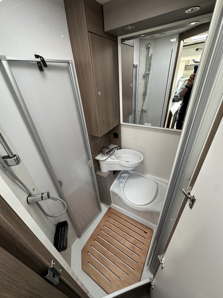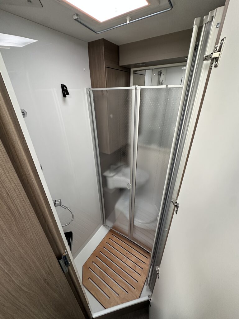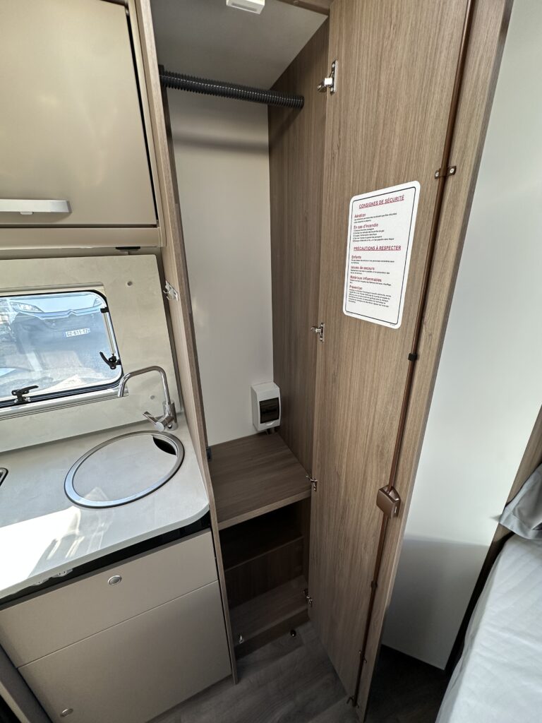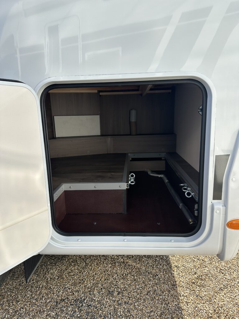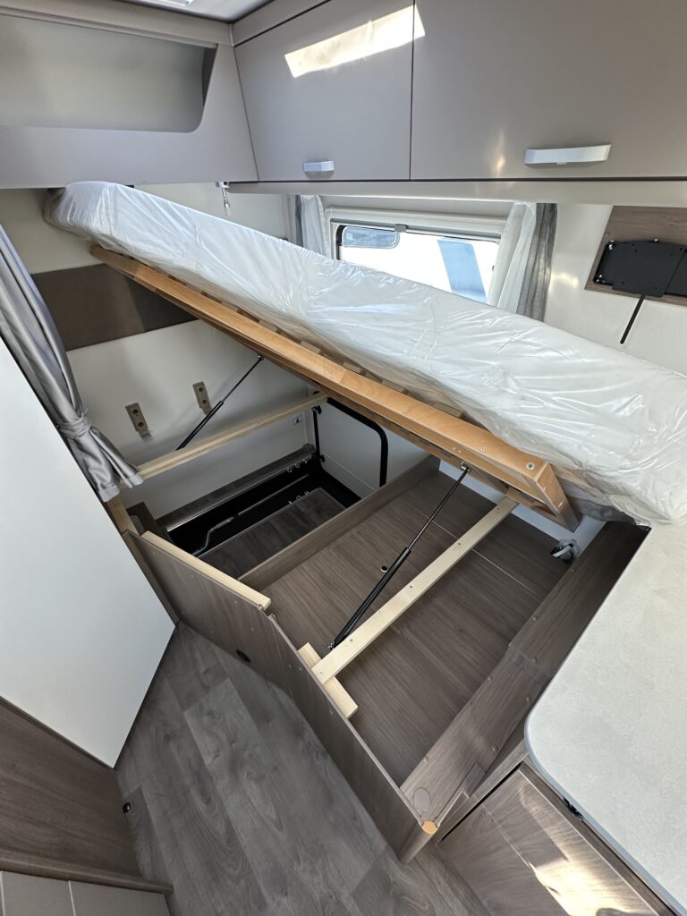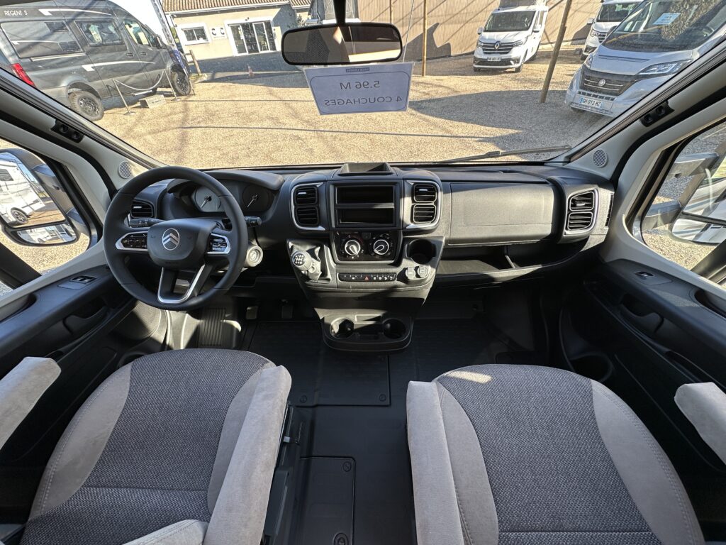 CARADO T 135 PRO +, collection 2026, 5.96 M, 4 couchages, lit permanent à la Française, salle de bain modulable convertible en vaste douche, salon avant avec sièges pivotant, surmonté d’un lit pavillon pour deux adultes, cuisine droite équipée de nombreux rangements.