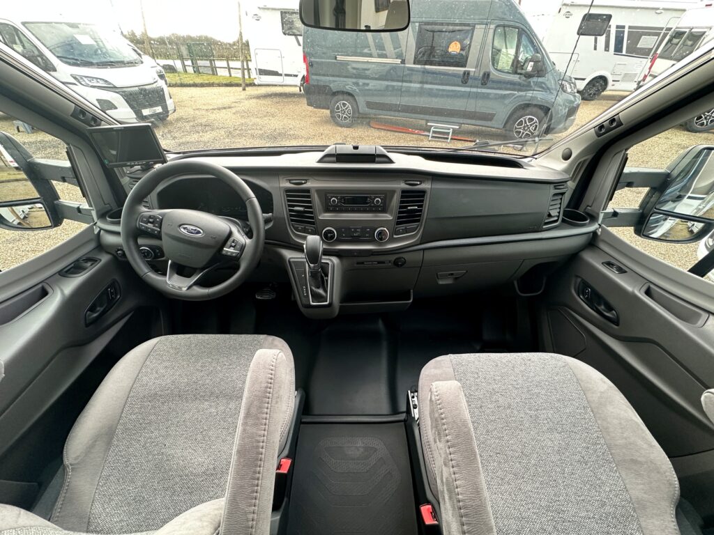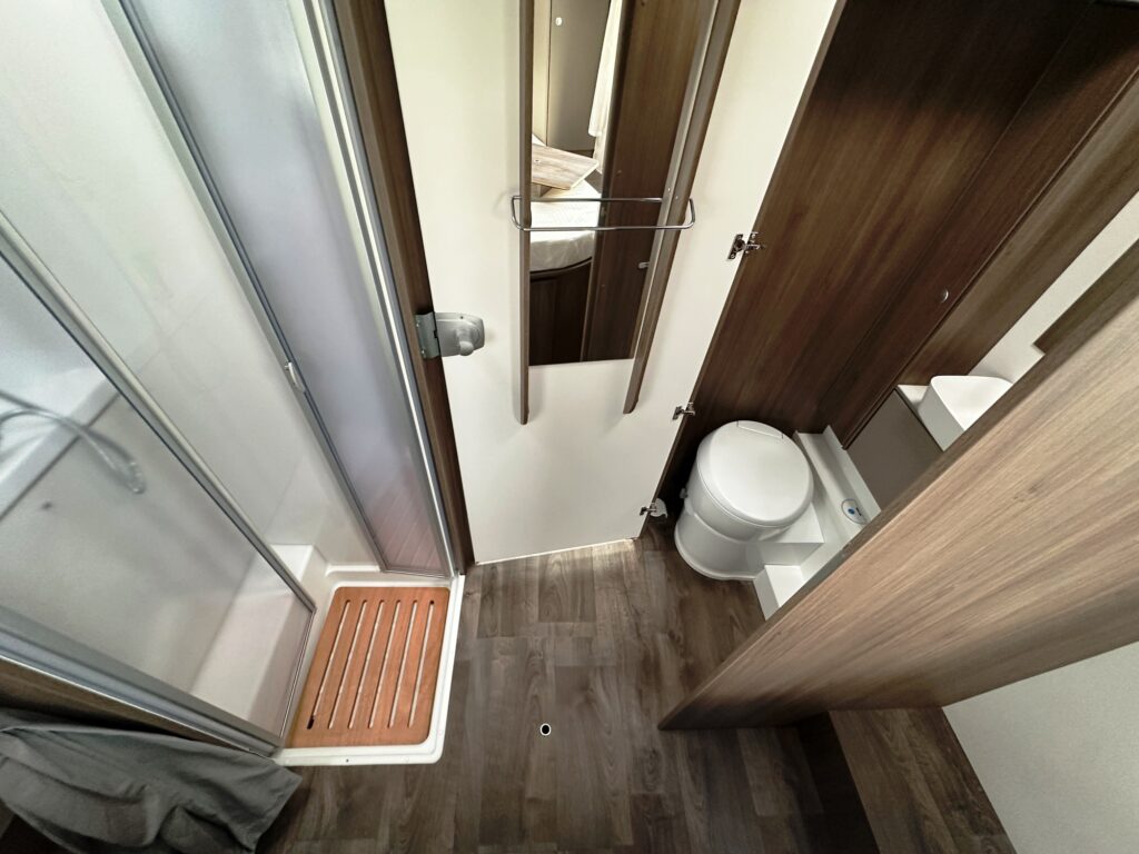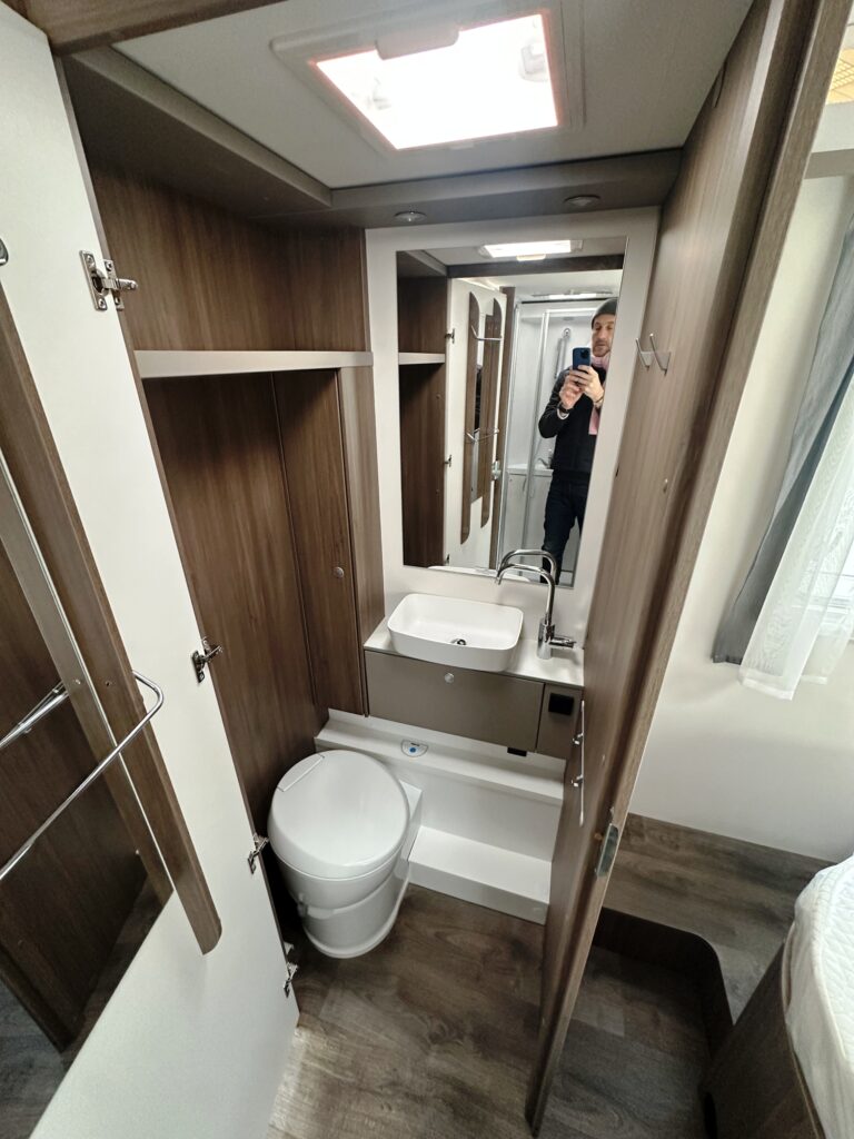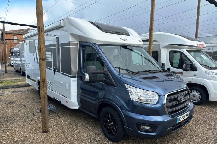 Profilé Carado, lit central en 150 cm sur soute (plusieurs vélos), 4 couchages, salle de bain avec grande douche entièrement séparée, fermeture chambre arrière, cuisine spacieuse et toute équipée, vaste salon avant avec sièges pivotant et table centrale + lit pavillon pour deux adultes.