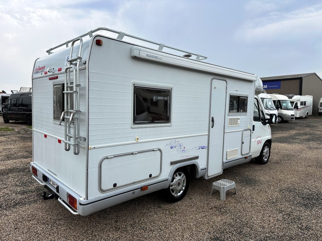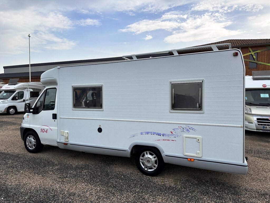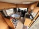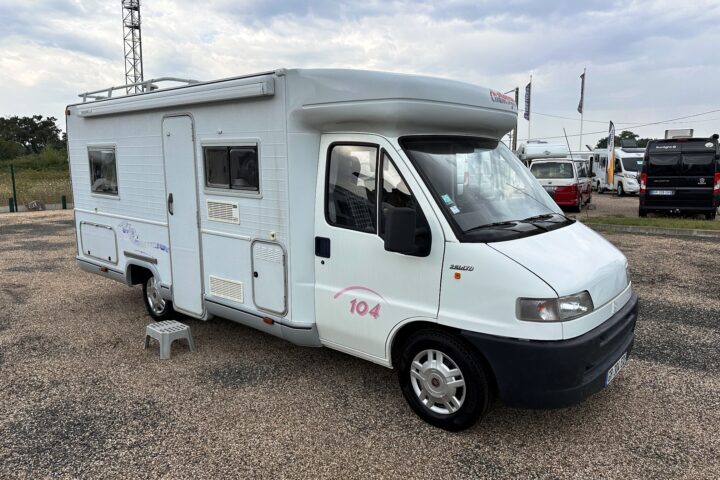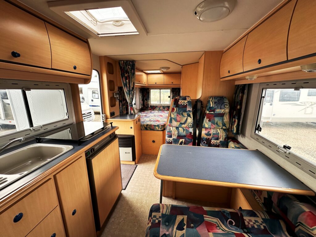 Profilé Challenger, fabrication Française reconnue, 4 couchages, lit à la française, salle de bain avec douche indépendante, salon avant avec dinette face/face convertible en un couchage double d’appoint.