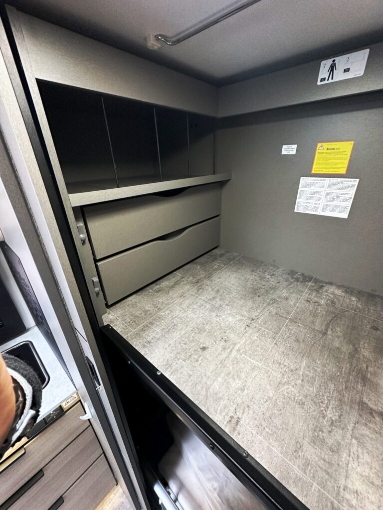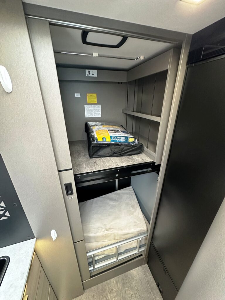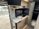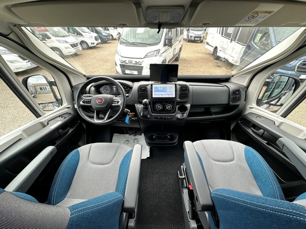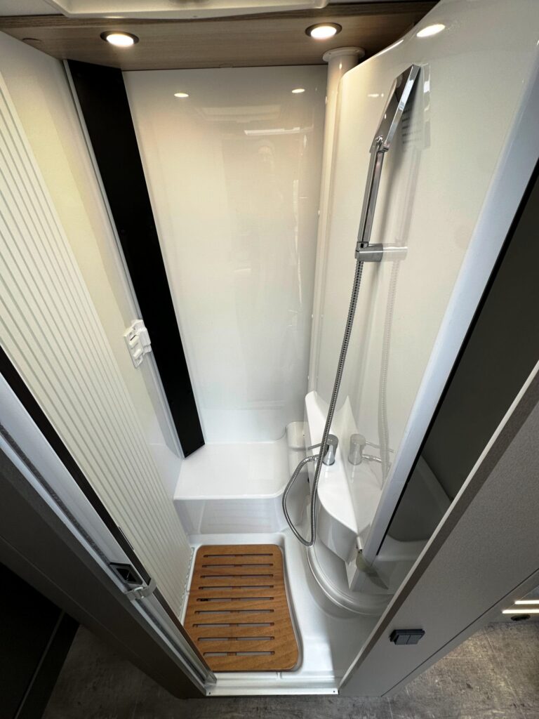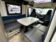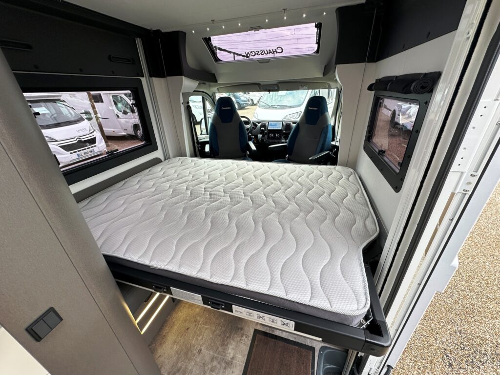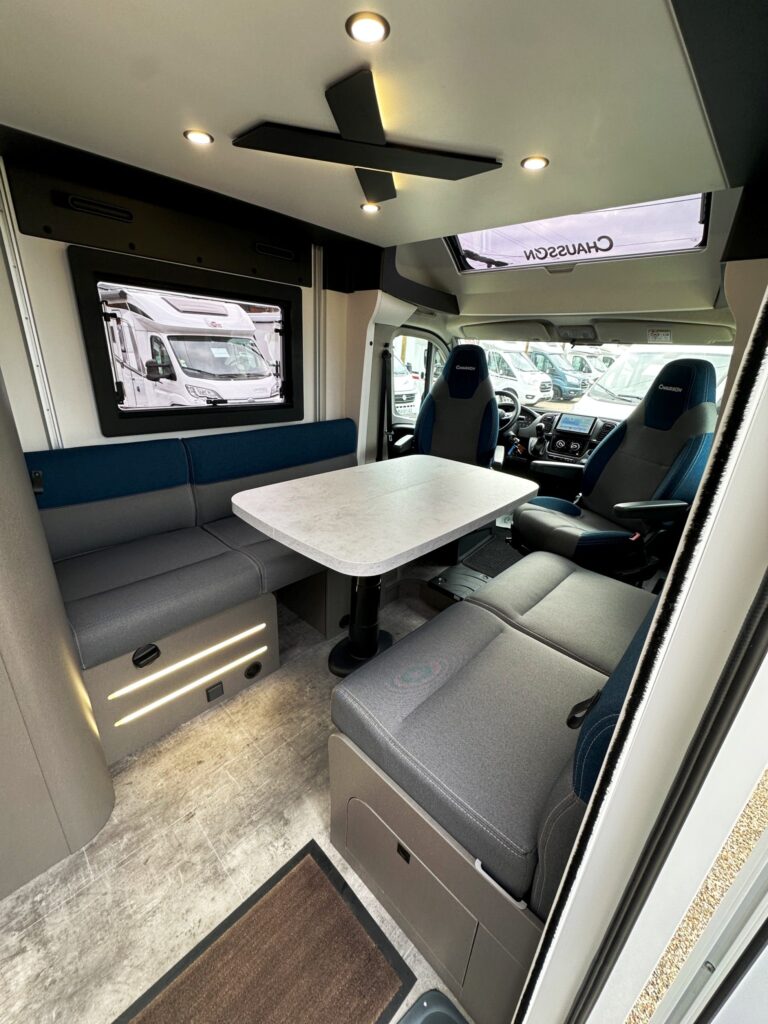 Profilé hybride Chausson, lit pavillon électrique, 4 couchages, salle de bain Vario convertible en vaste douche, cuisine droite spacieuse et tout équipée, immense salon avant avec sièges pivotants et table centrale convertible en couchage double, vaste soute arrière modulable (plusieurs vélos adultes) et grand dressing.