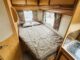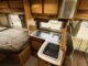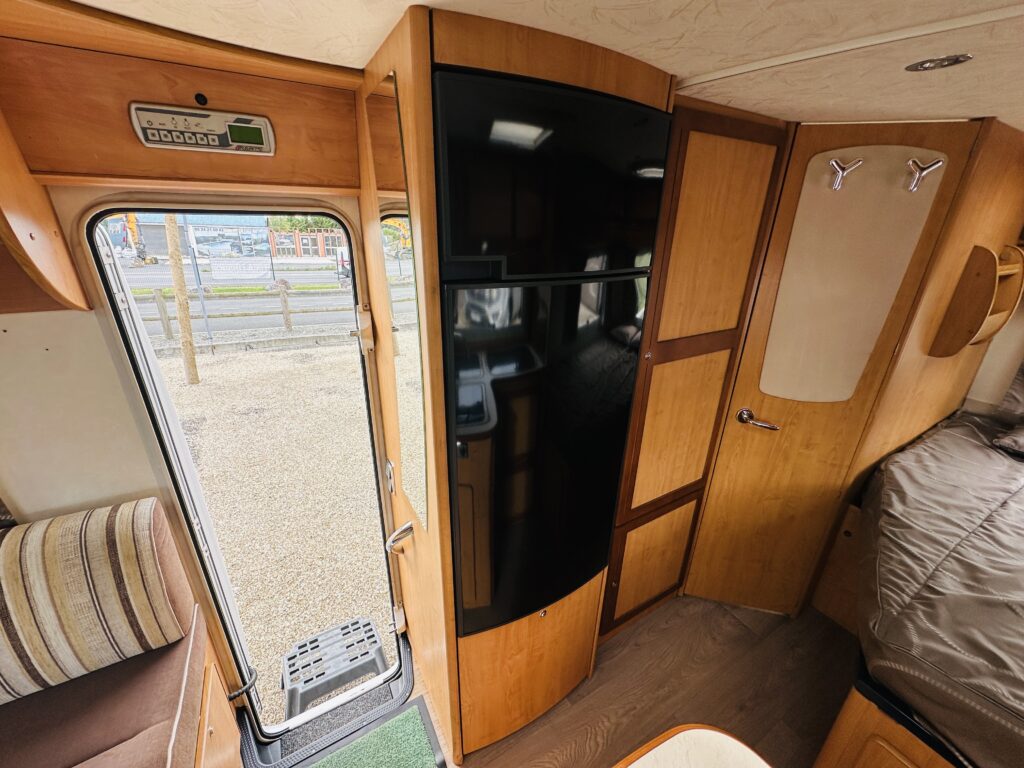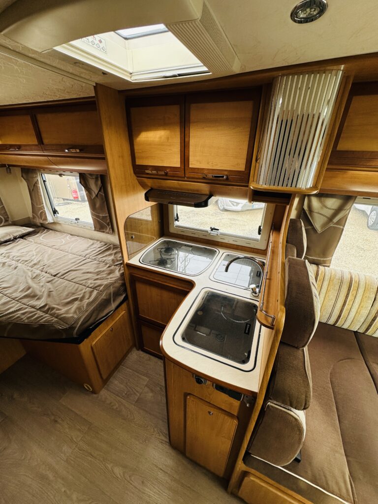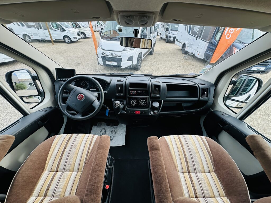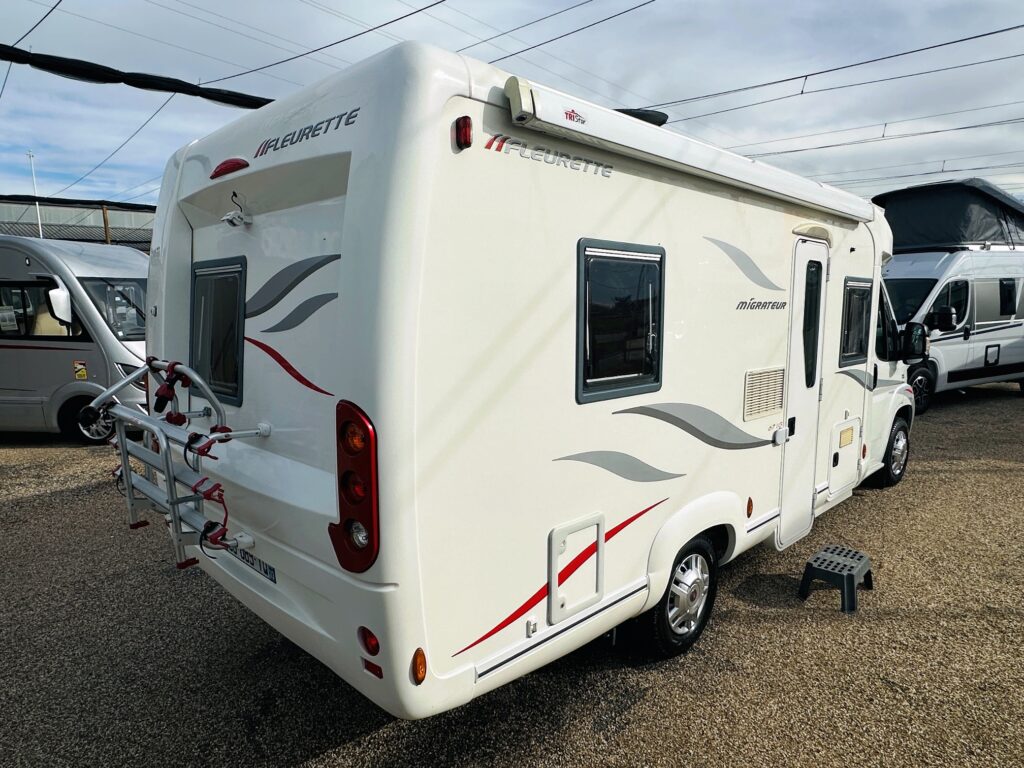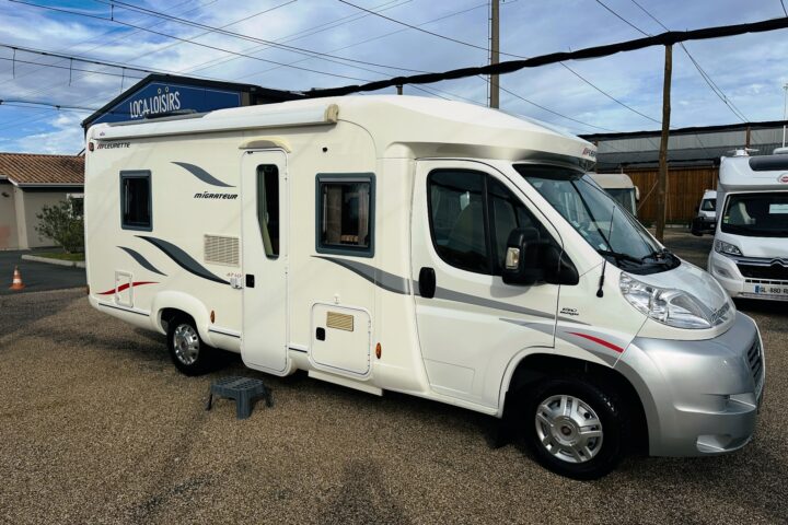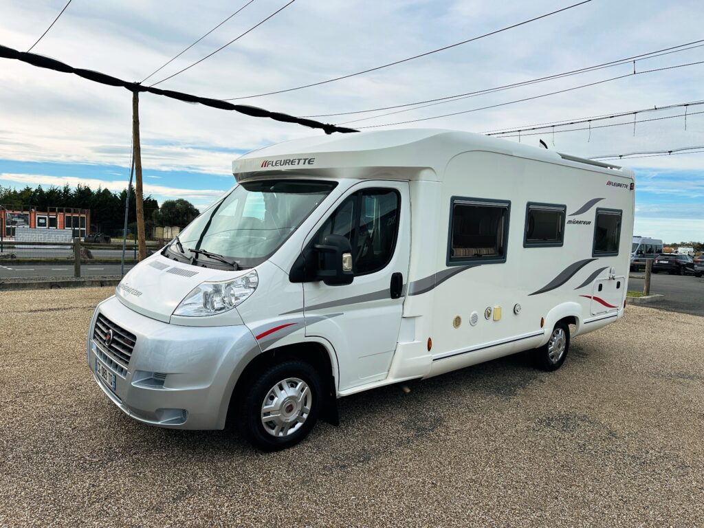 Profilé Fleurette, fabrication Française recherchée, lit à la Française, 4 couchages, salle de bain avec douche séparée, cuisine en L équipée d’un grand frigo automatique, vaste salon avant avec banquette latérale et sièges cabines pivotants convertible en un couchage double d’appoint.