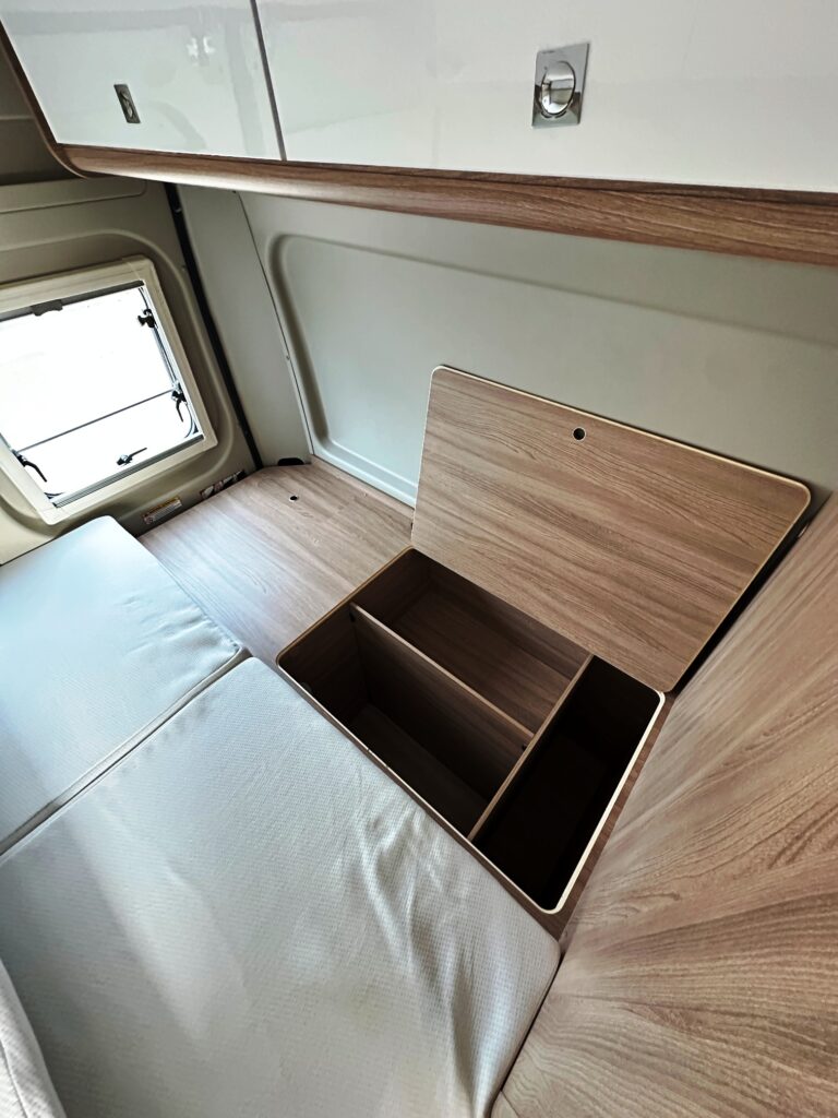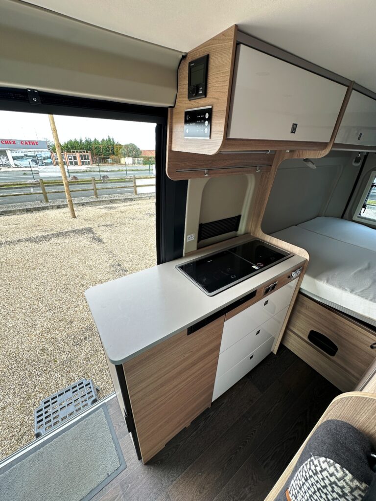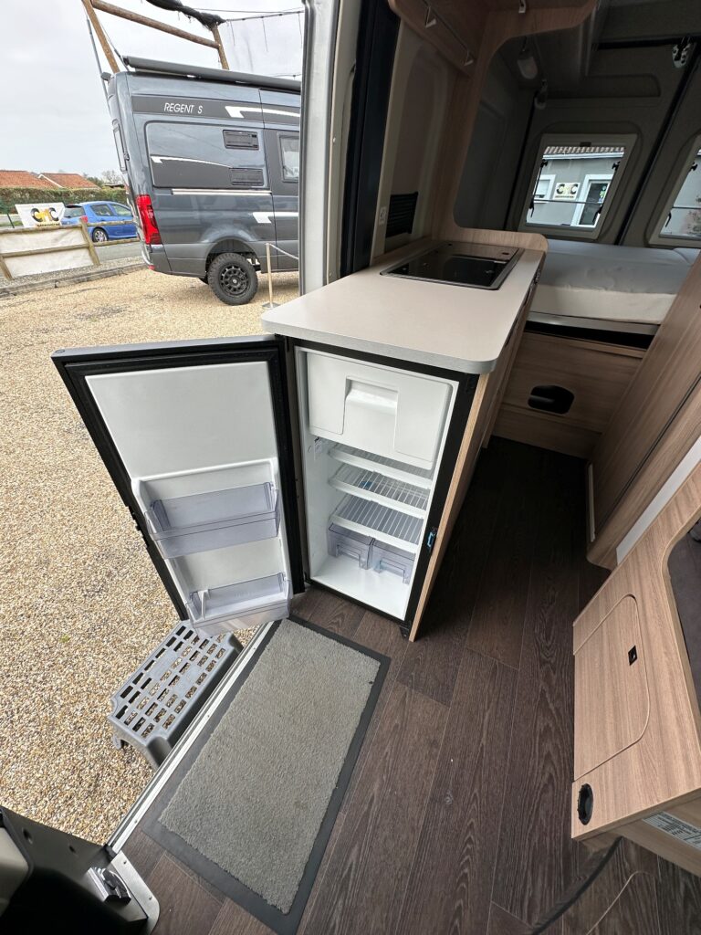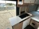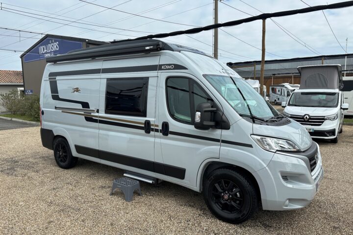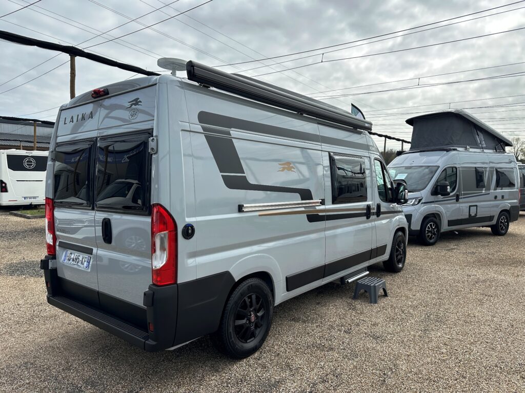 Fourgon Laïka (5.99 M), 4 couchages, lit transversal (possibilité de dégager le couloir), vaste salle de bain avec douche intégrée, salon avant avec sièges pivotant, table centrale, cuisine droite équipée de nombreux rangements et d’un frigo par compression, toit relevable et lit pavillon supplémentaire pour deux adultes.