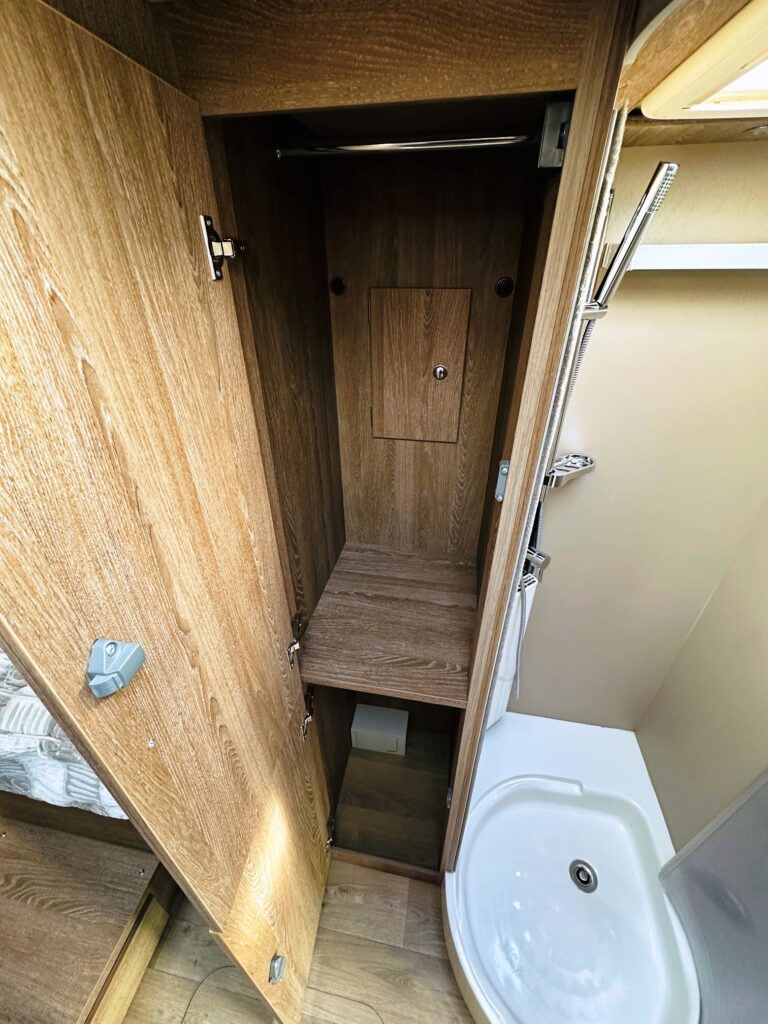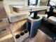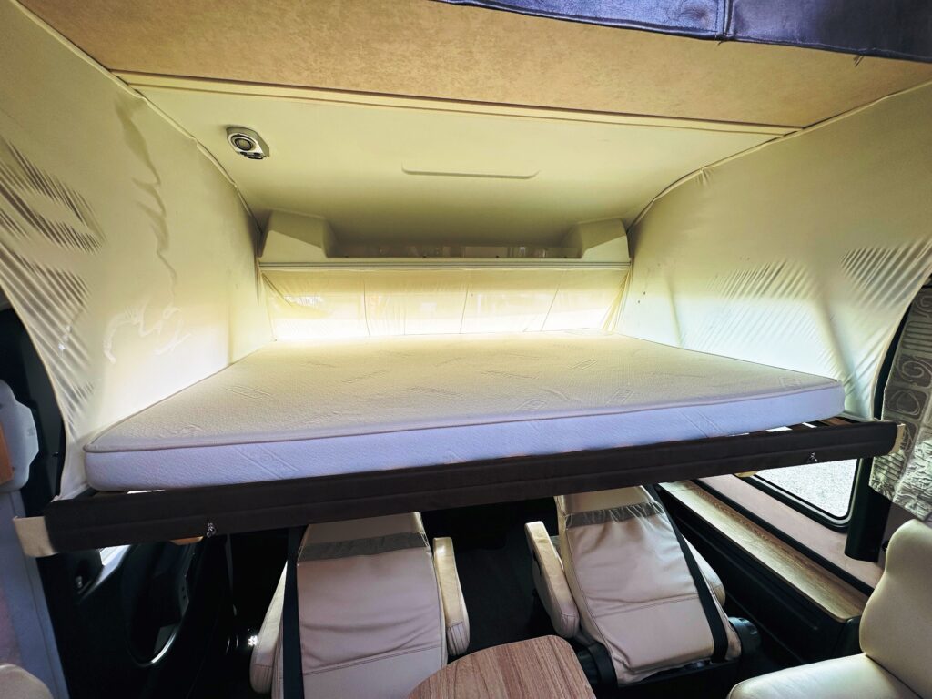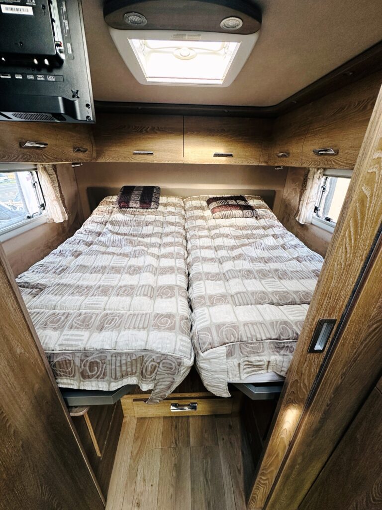 Intégral Le Voyageur, poids lourd 4.5 T, lits jumeaux convertibles en lit central, 4 couchages, vaste salle de bain avec grande douche entièrement indépendante, cuisine spacieuse et toute équipée, grand salon avant avec sièges pivotant et table centrale, lit pavillon en cabine pour deux adultes.