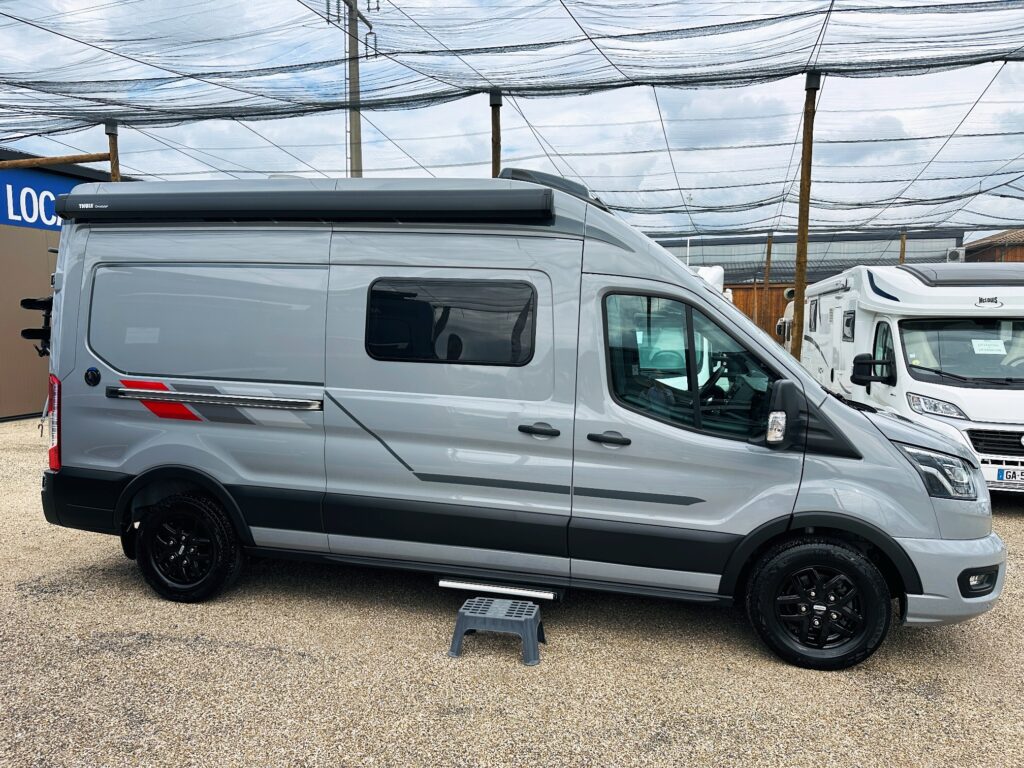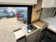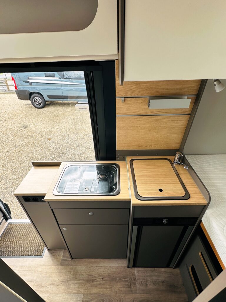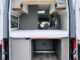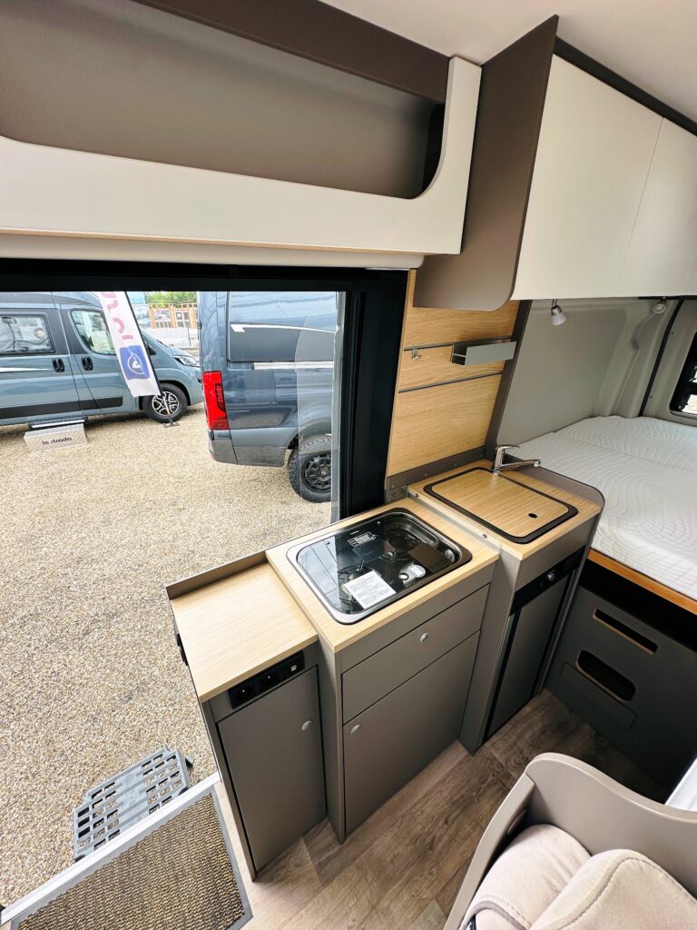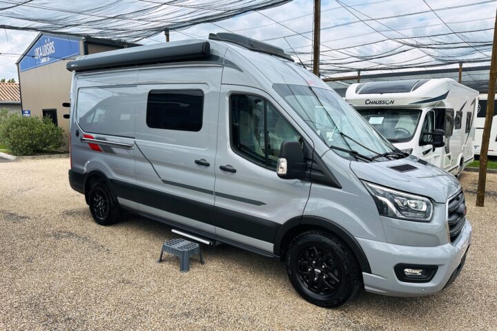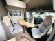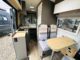 Fourgon LMC (5.98 M), lit permanent arrière transversale modulable (possibilité de dégager le couloir), salle de bain avec douche intégrée, salon avant avec sièges pivotant, table centrale, cuisine droite équipée de nombreux rangements, d’un plan de travail amovible et d’un frigo par compression.