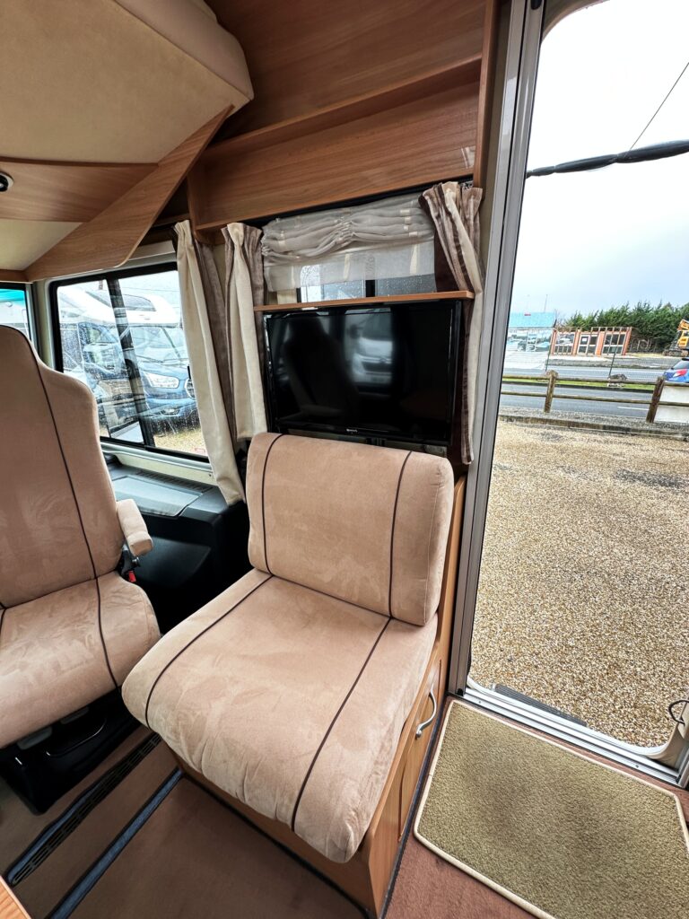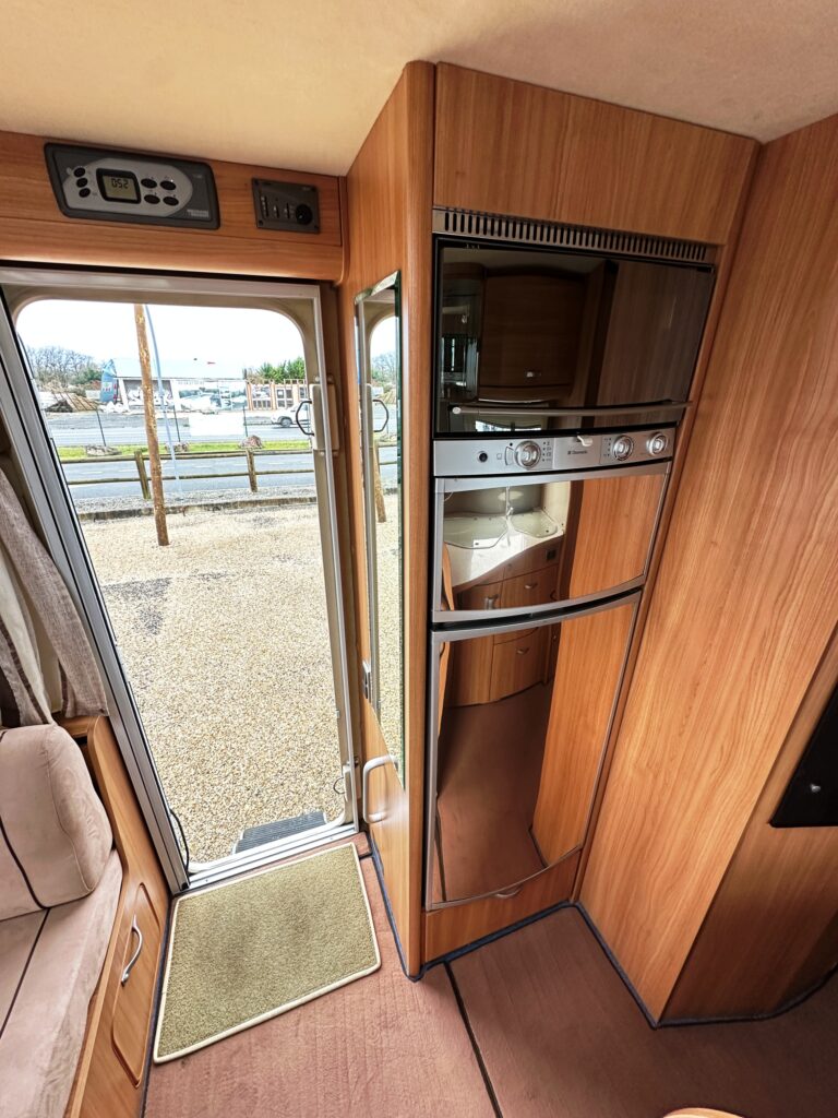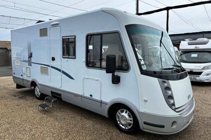 Intégral Niesmann, poids lourd 3.850 Kg, lit sur vaste soute garage, 4 couchages, salle de bain avec douche intégrée, cuisine spacieuse et toute équipée, vaste salon avant avec sièges pivotant et table centrale, lit pavillon en cabine pour deux adultes.