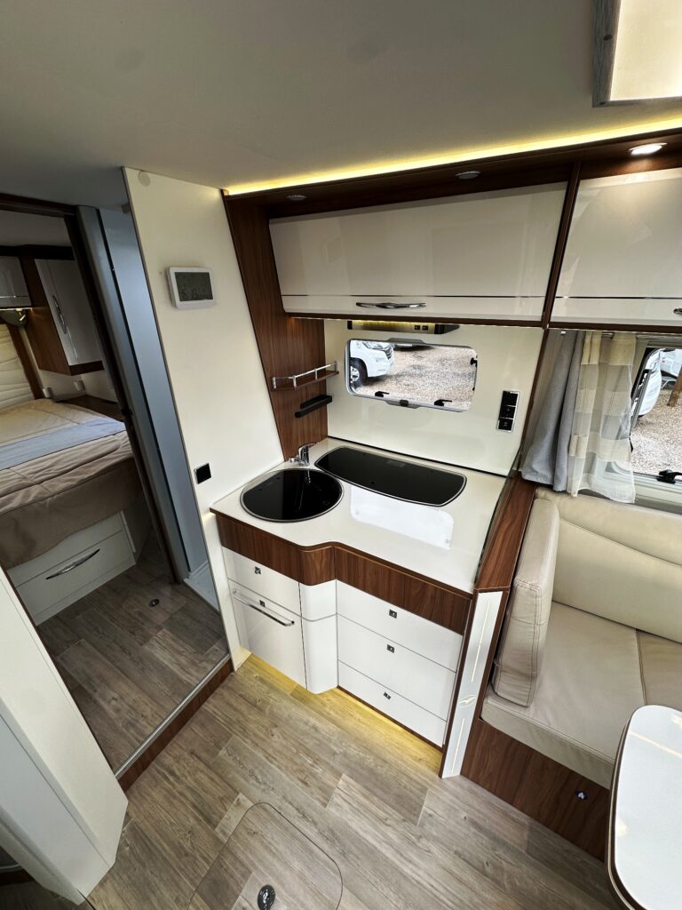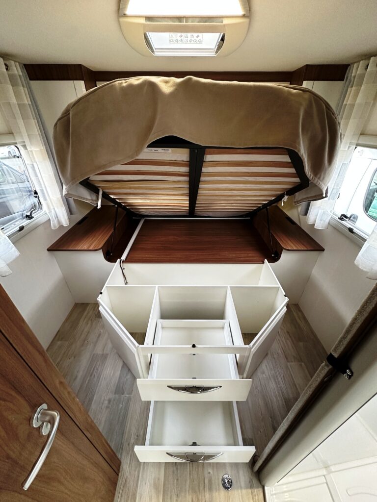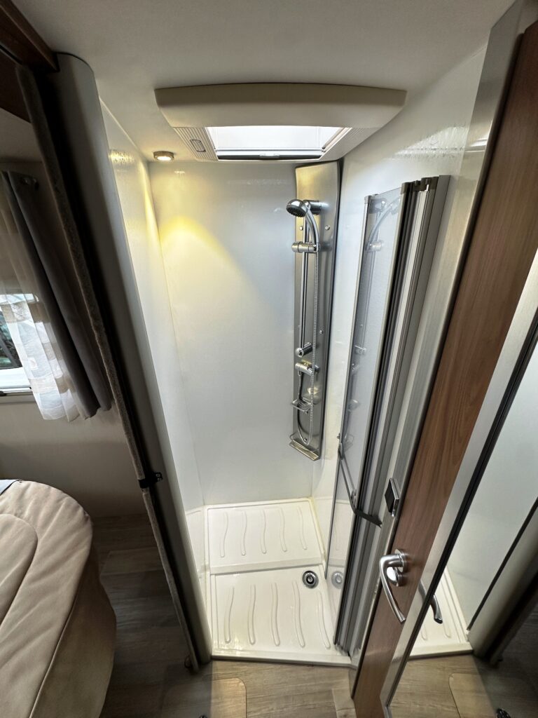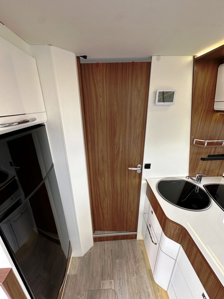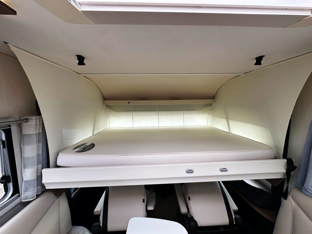 Intégral Pilote, lit central, vaste soute garage (plusieurs vélos adultes), 4 couchages, salle de bain avec grande douche entièrement séparée, double fermeture chambre arrière, cuisine spacieuse et toute équipée, vaste salon avant avec sièges pivotant et table centrale convertible en un couchage d’appoint + lit pavillon en cabine pour deux adultes.