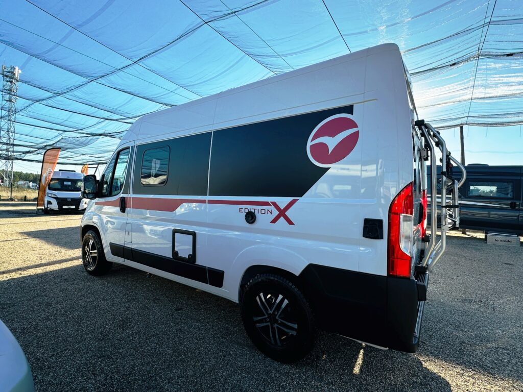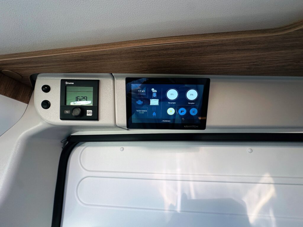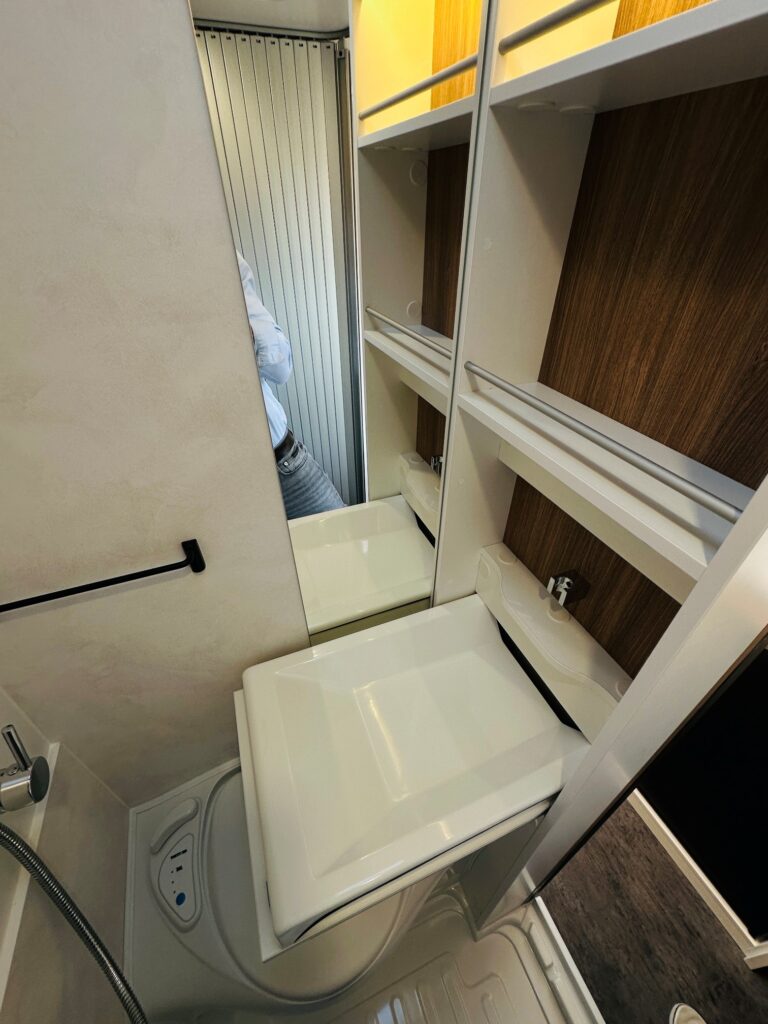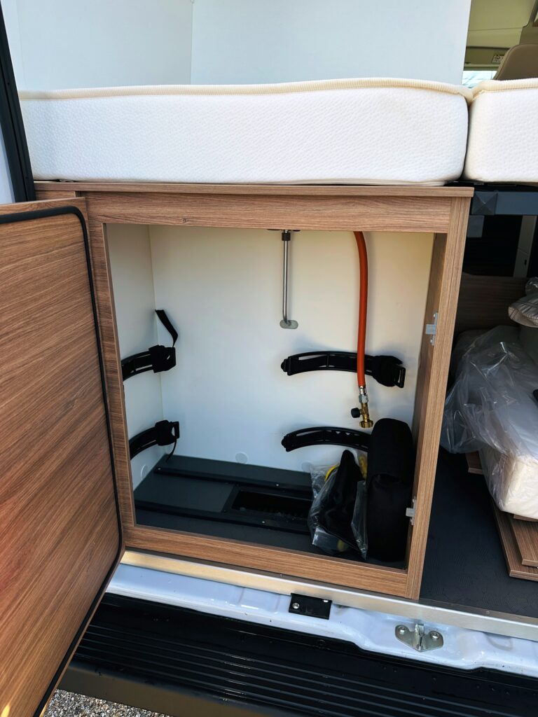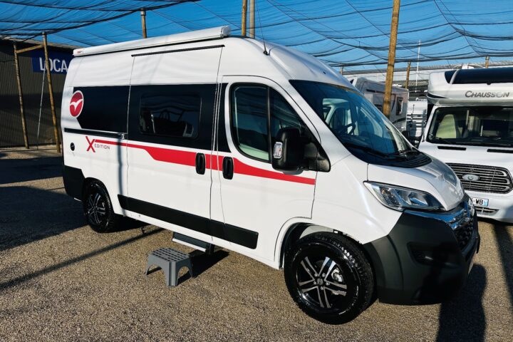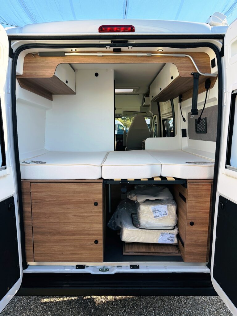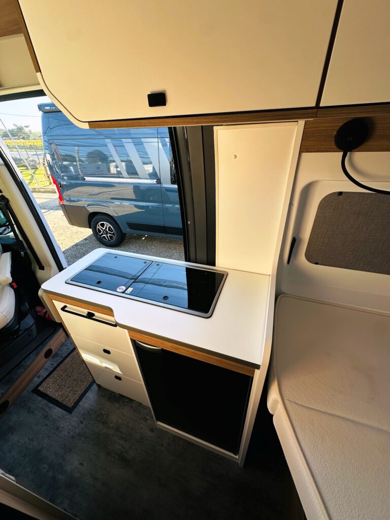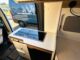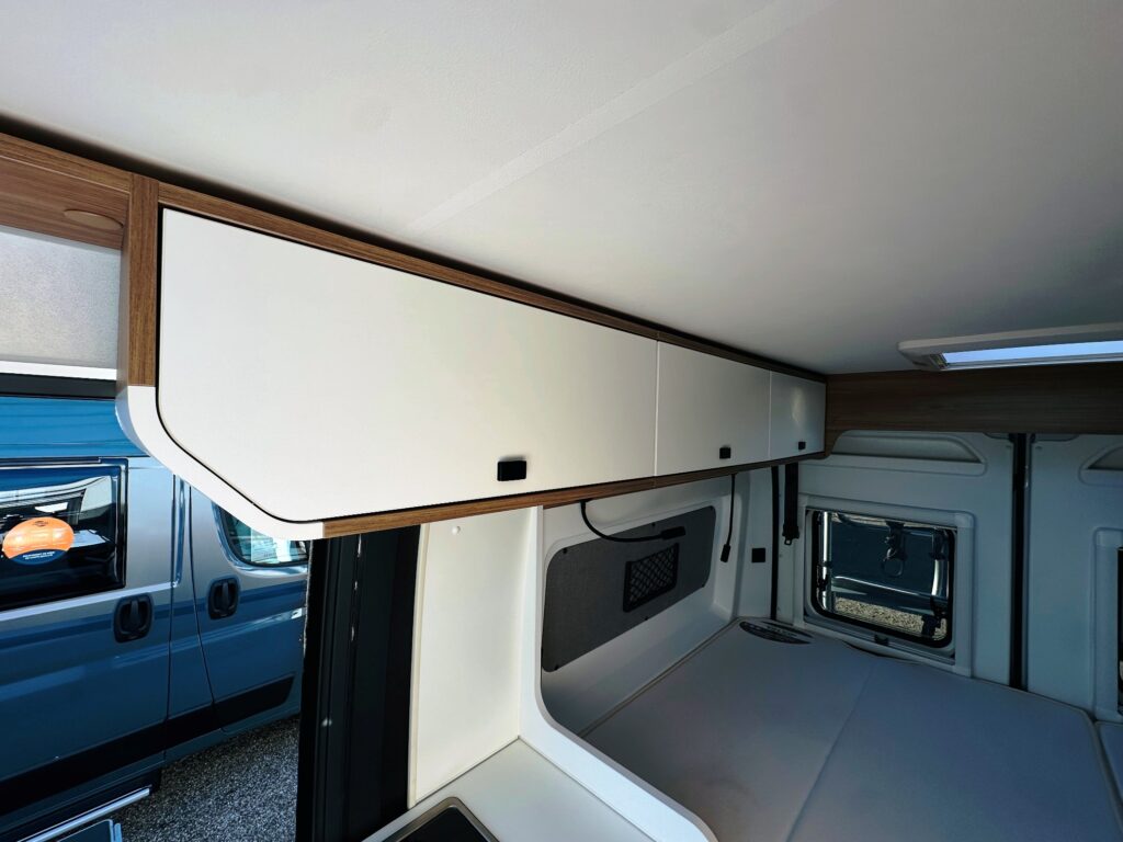 Fourgon Pilote compact (5.41 M), lit permanent arrière transversale modulable (possibilité de dégager le couloir), salle de bain avec douche intégrée et évier amovible, salon avant avec sièges pivotant convertible en un couchage d’appoint, cuisine droite équipée de nombreux rangements, d’un plan de travail rabattable et d’un frigo par compression.