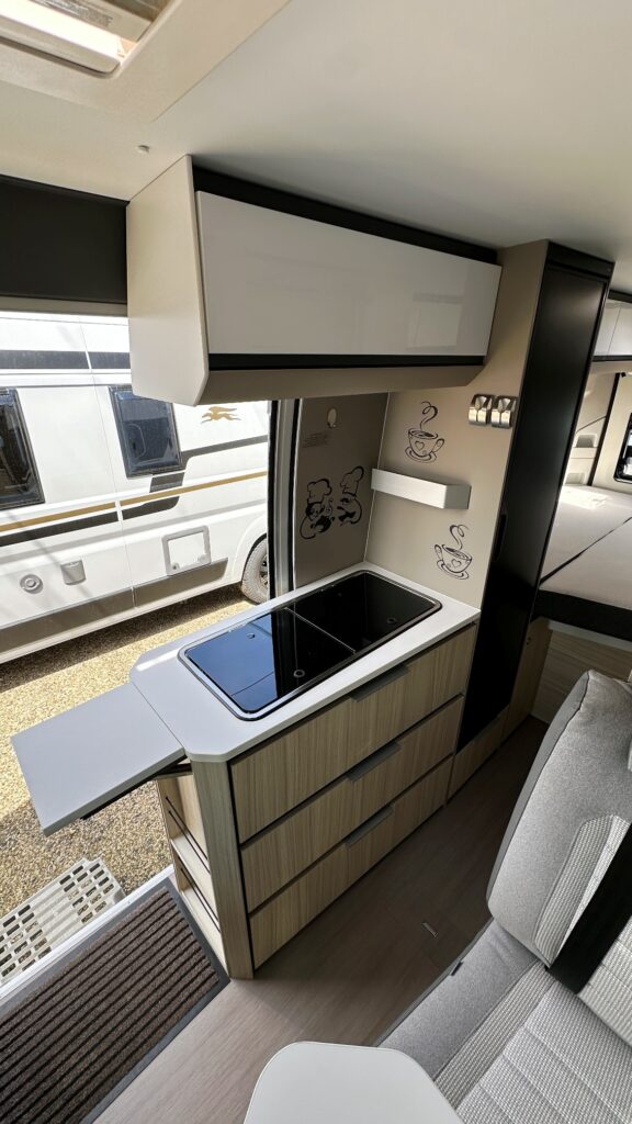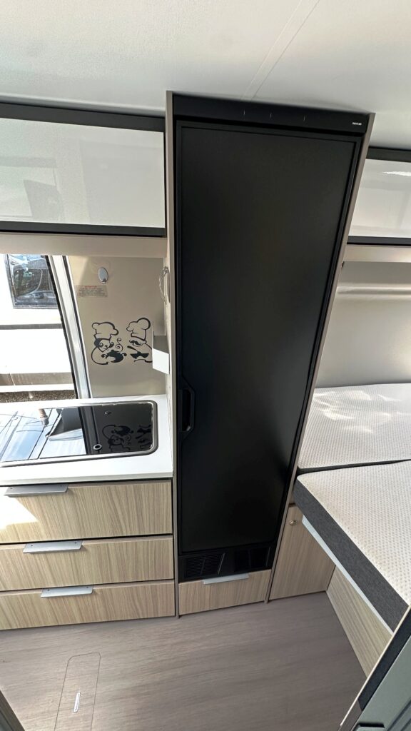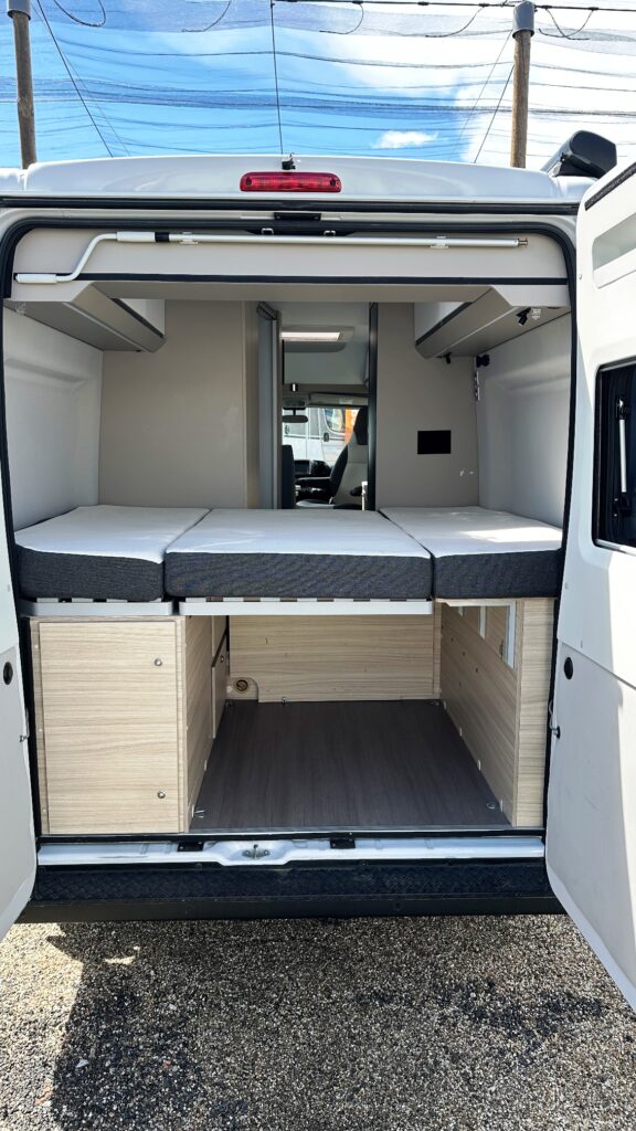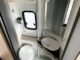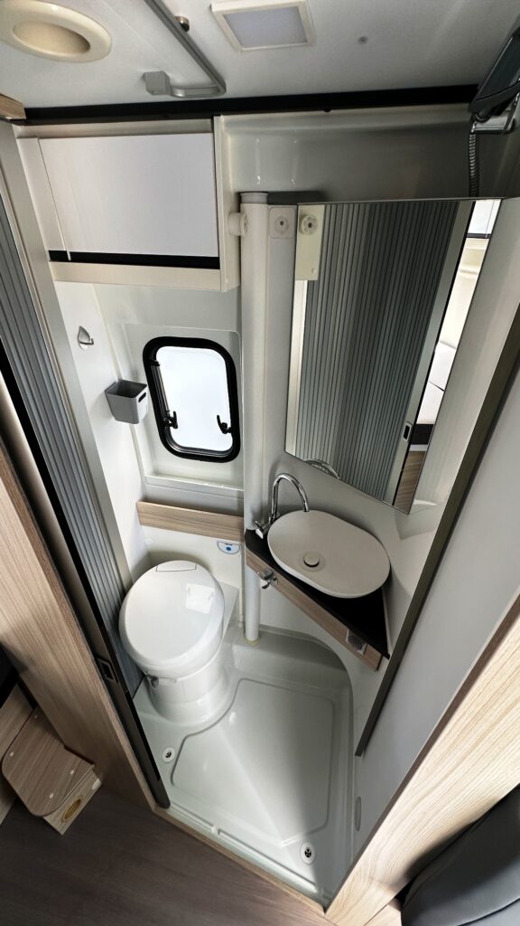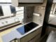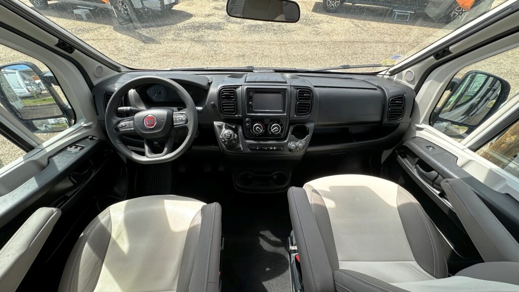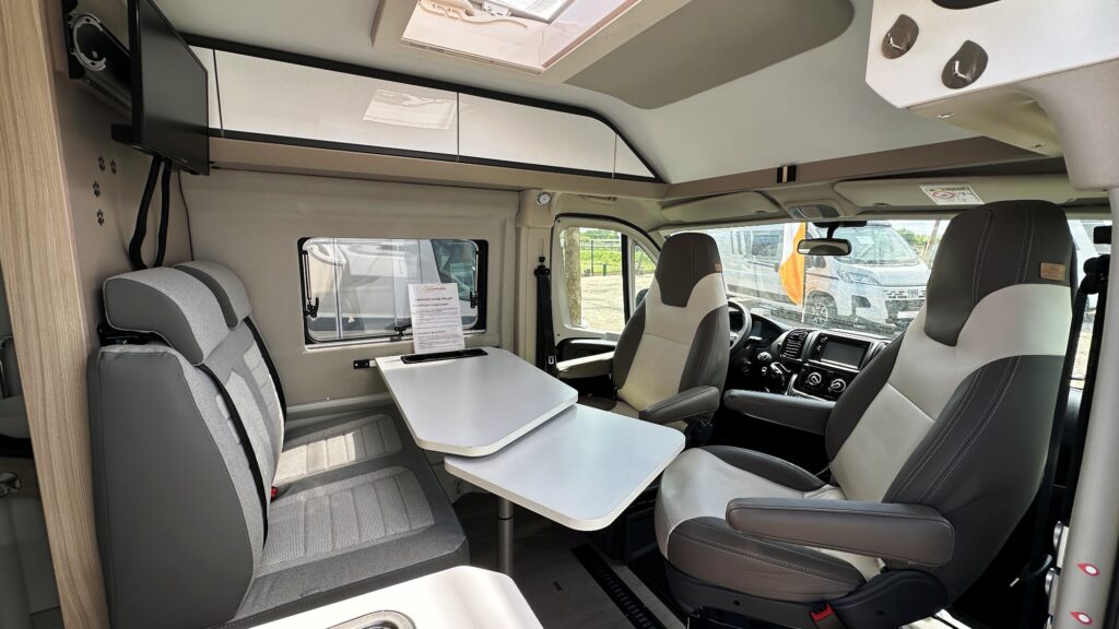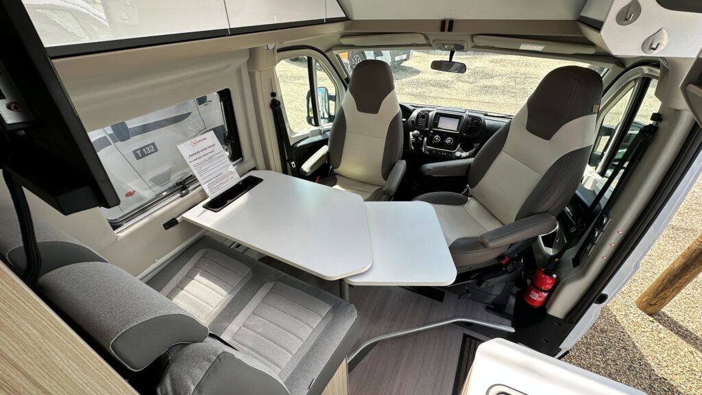 Fourgon Possl (5.99 M), lit transversal (possibilité de dégager le couloir), salle de bain « Vario » convertible en douche, salon avant avec sièges pivotant, table centrale convertible en un couchage d’appoint pour enfant, cuisine droite équipée de nombreux rangements et d’un grand frigo automatique.