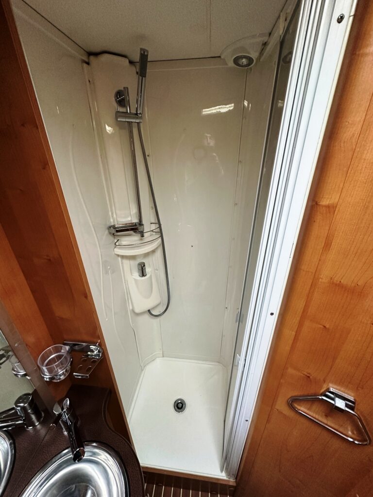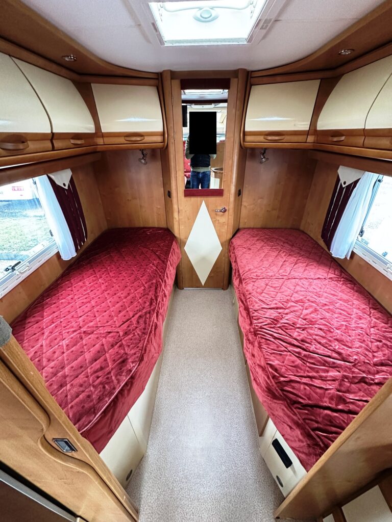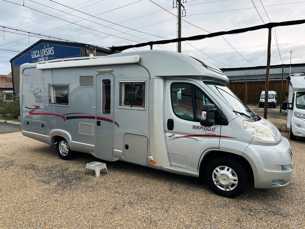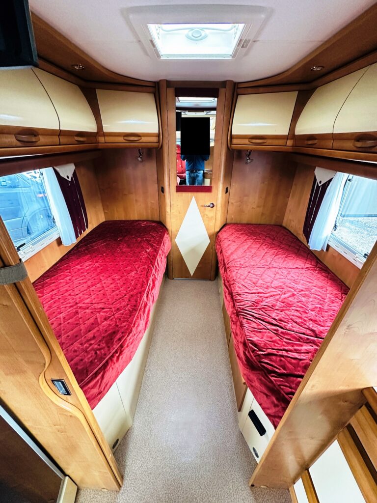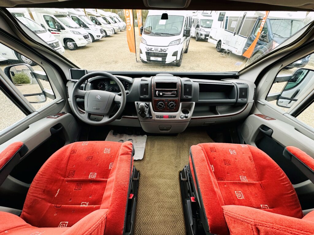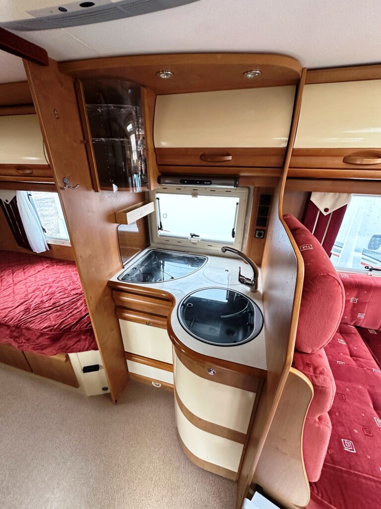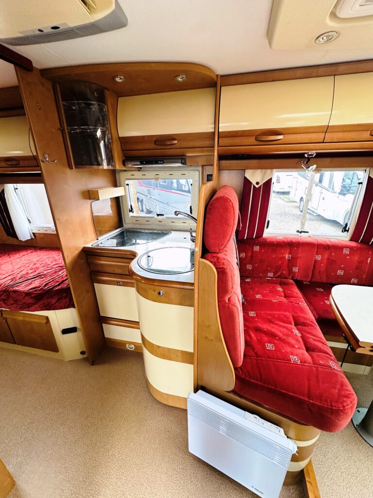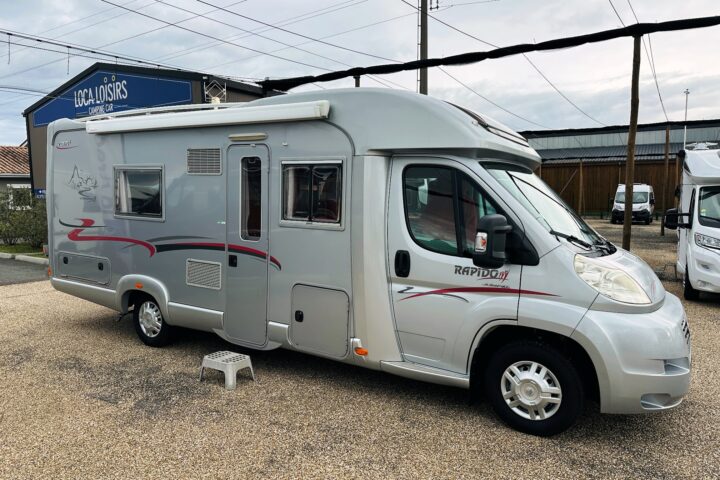 Profilé Rapido, fabrication Française haut de gamme, agencement confortable avec un lits jumeaux, 3 couchages, très grande salle de bain sur l’arrière de la cellule avec douche indépendante, une cuisine en L équipée d’un grand frigo automatique, et un vaste salon avant avec banquette latérale et sièges cabines pivotants convertible en un couchage d’appoint.