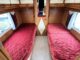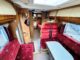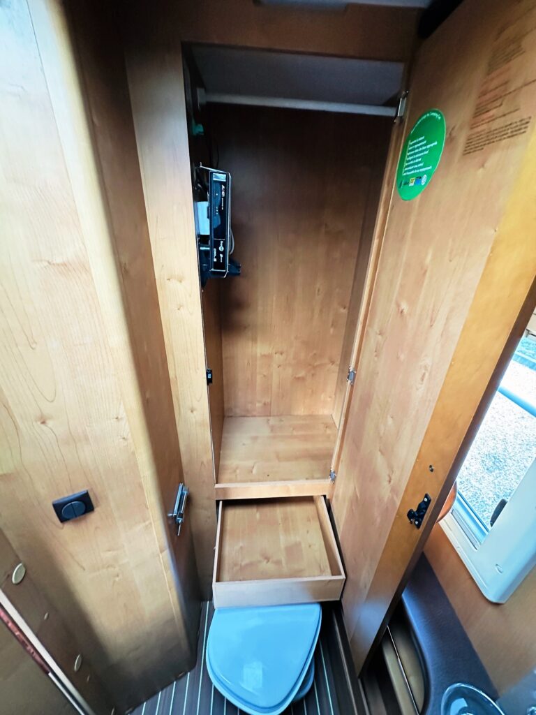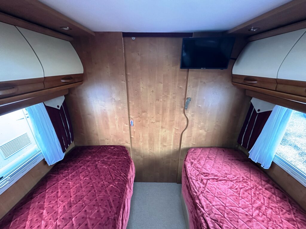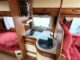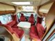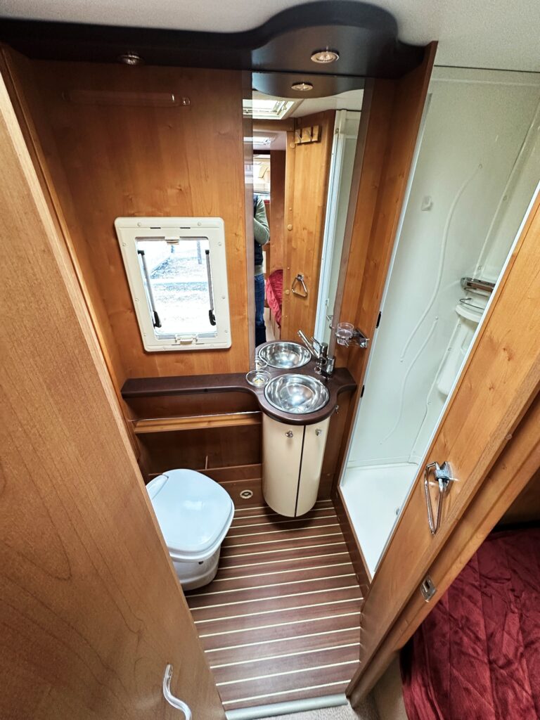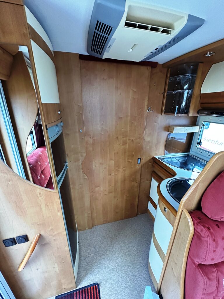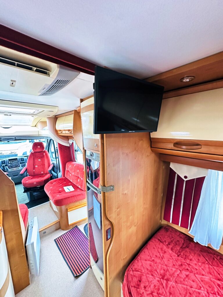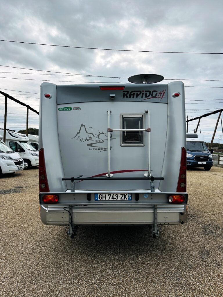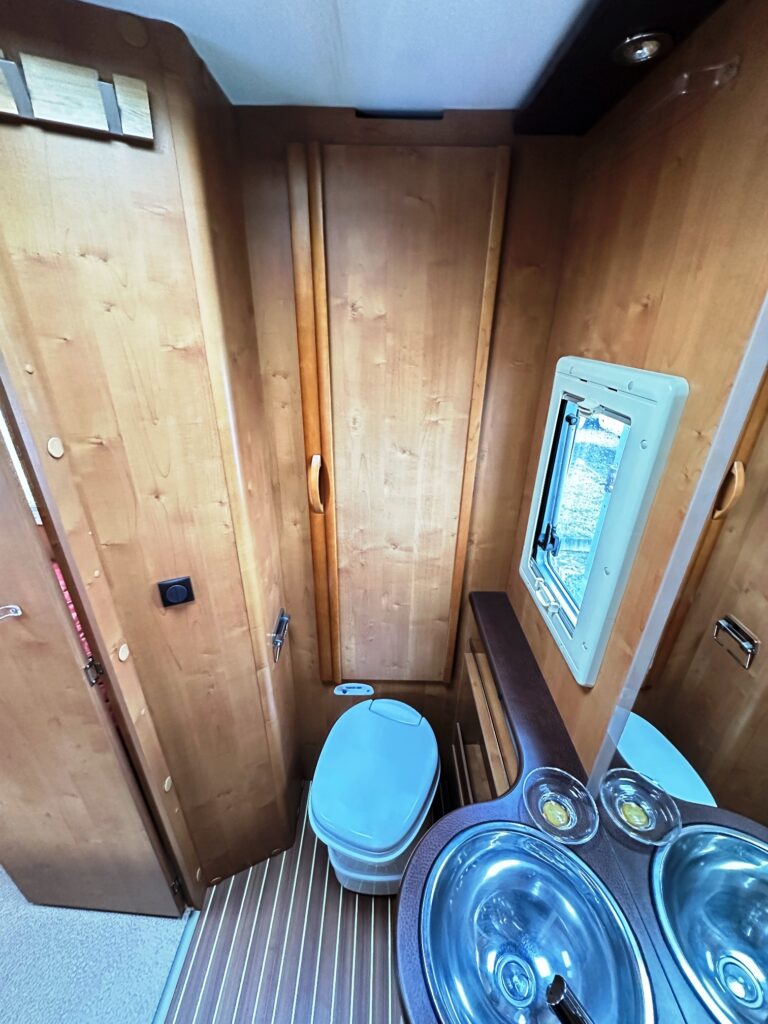 Profilé Rapido, fabrication Française haut de gamme, agencement confortable avec un lits jumeaux, 3 couchages, très grande salle de bain sur l’arrière de la cellule avec douche indépendante, une cuisine en L équipée d’un grand frigo automatique, et un vaste salon avant avec banquette latérale et sièges cabines pivotants convertible en un couchage d’appoint.