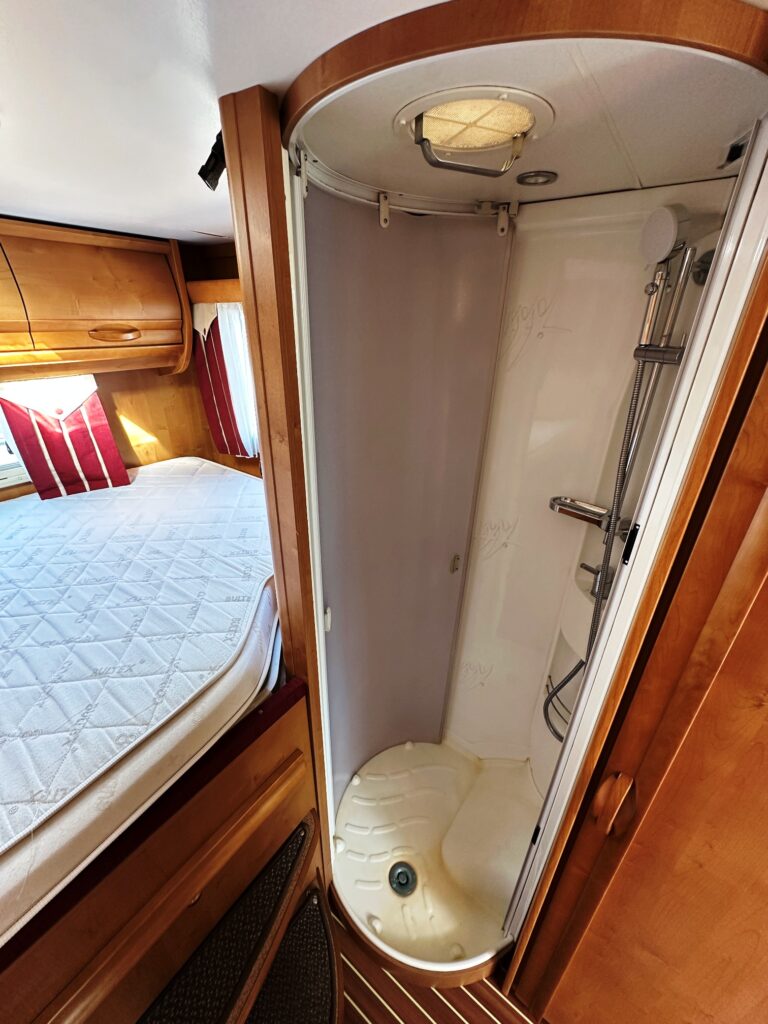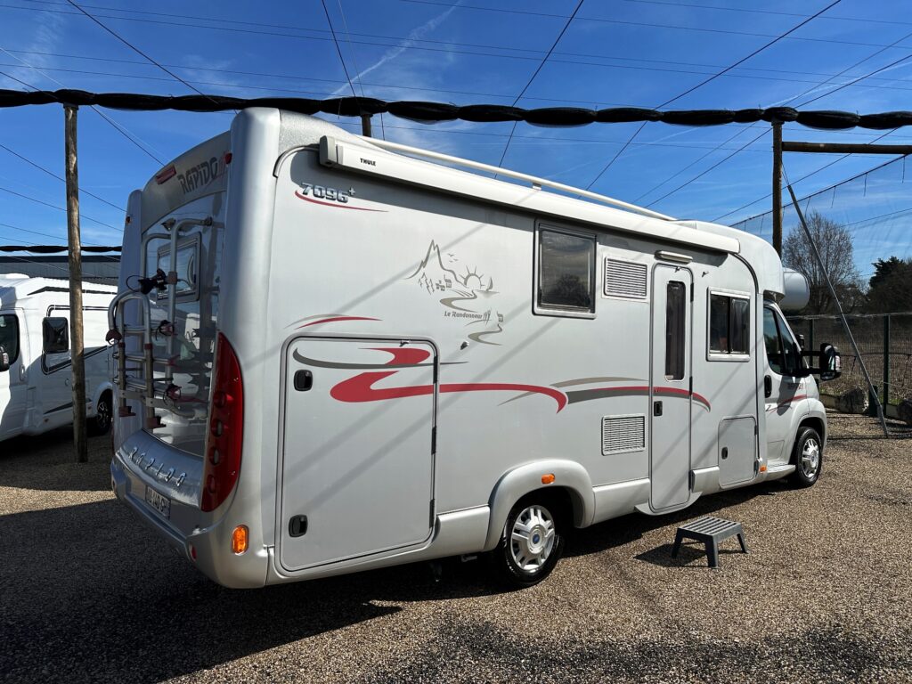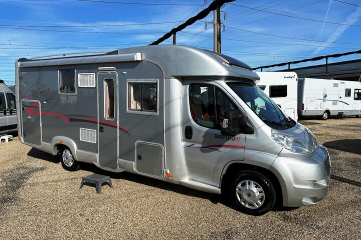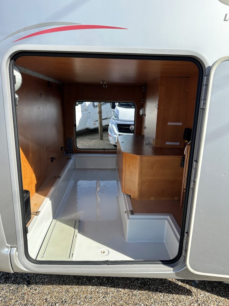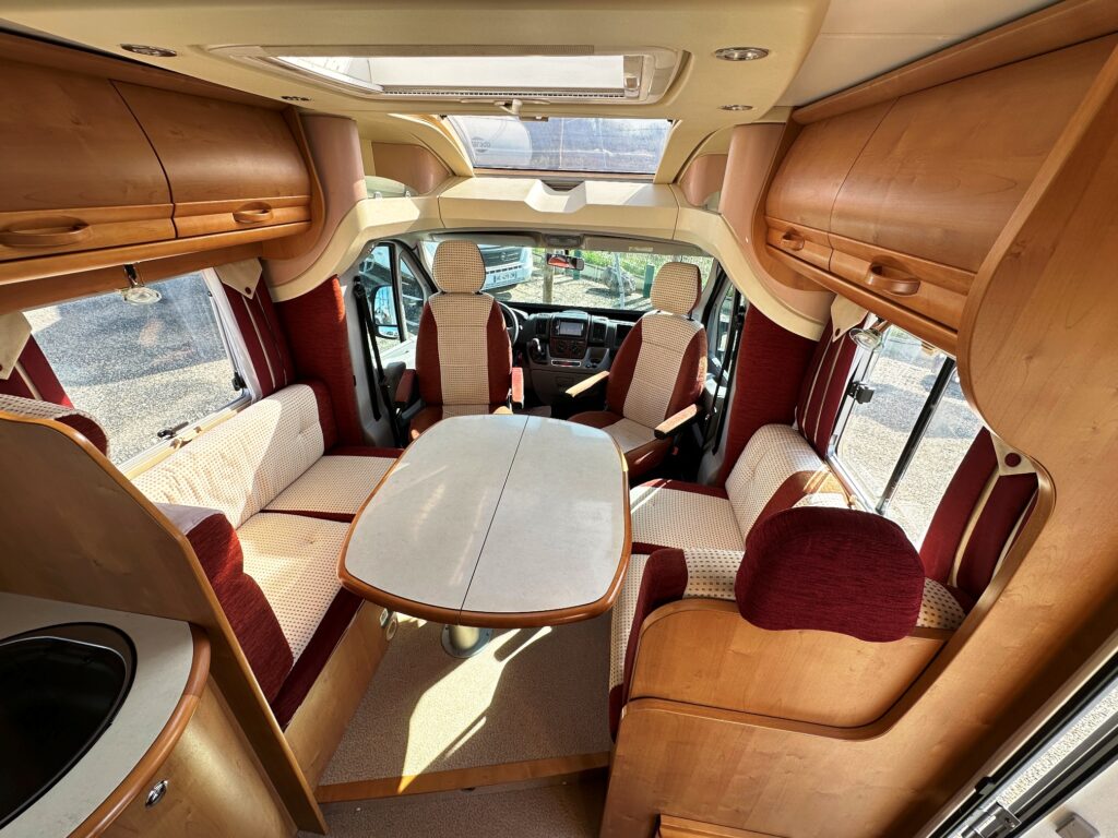 Profilé Rapido, 4 couchages, lit sur immense soute garage (plusieurs vélos adultes), salle de bain avec grande douche entièrement séparée, cuisine spacieuse et toute équipée, vaste salon avant avec sièges pivotant et table centrale convertible en un couchage double d’appoint.