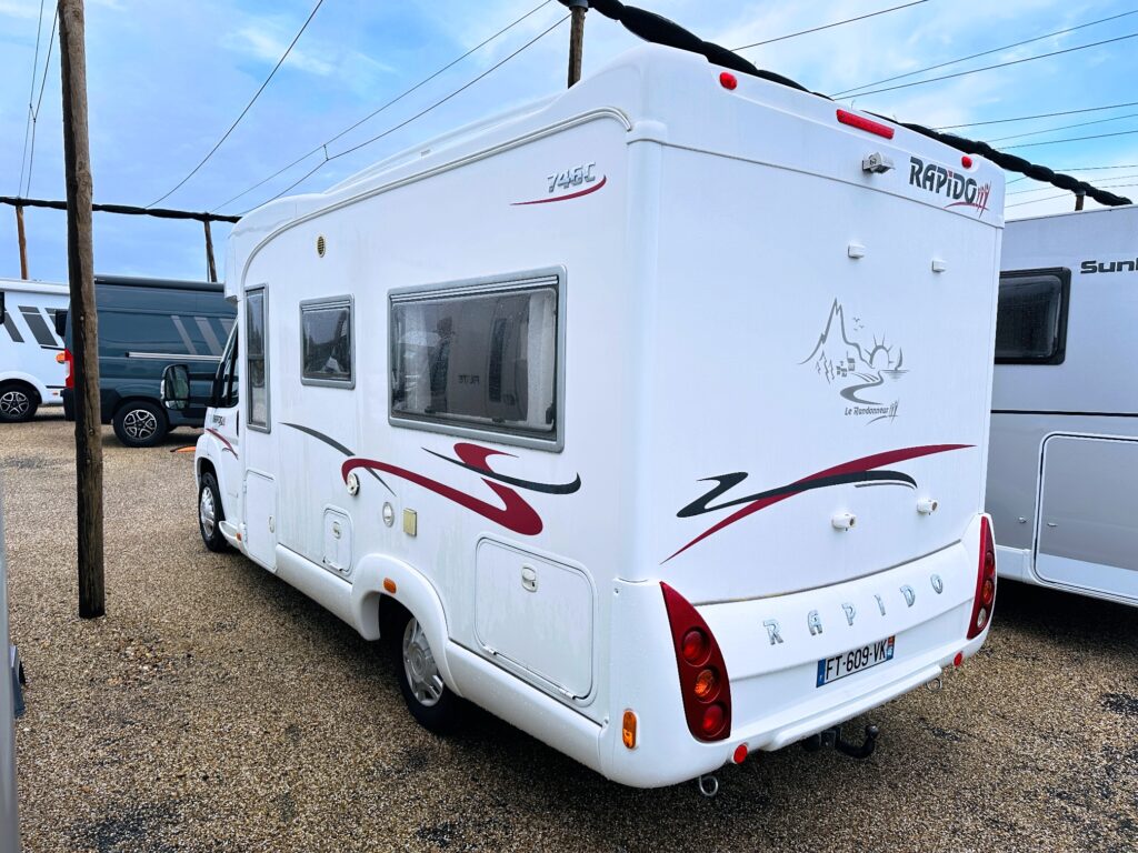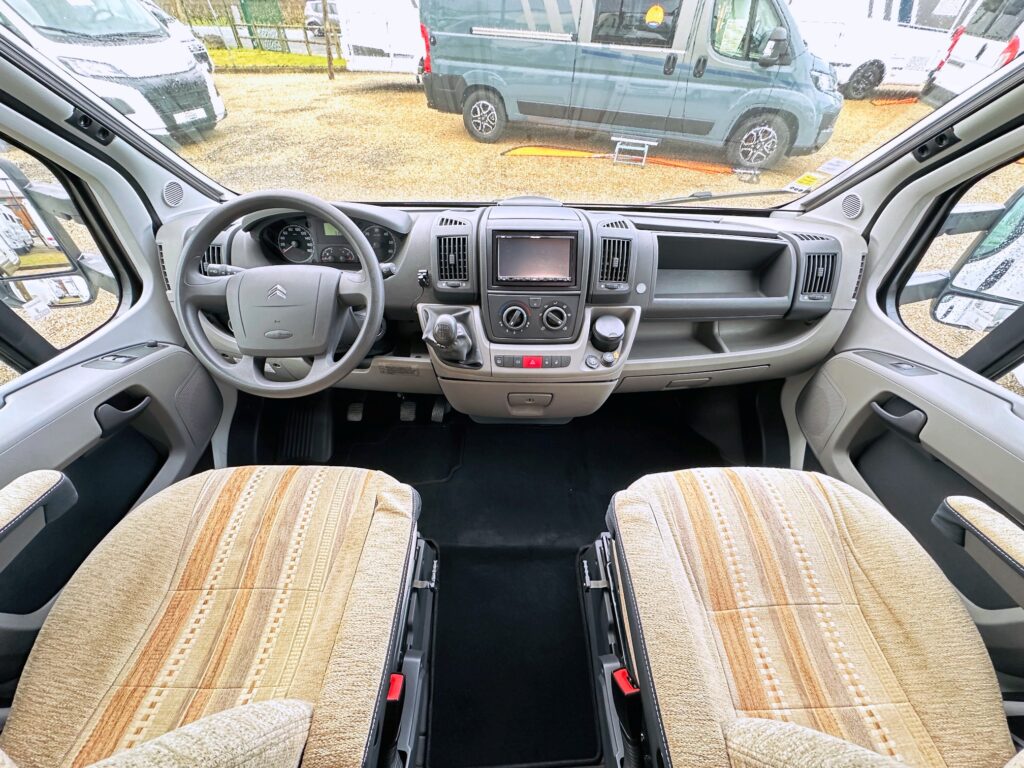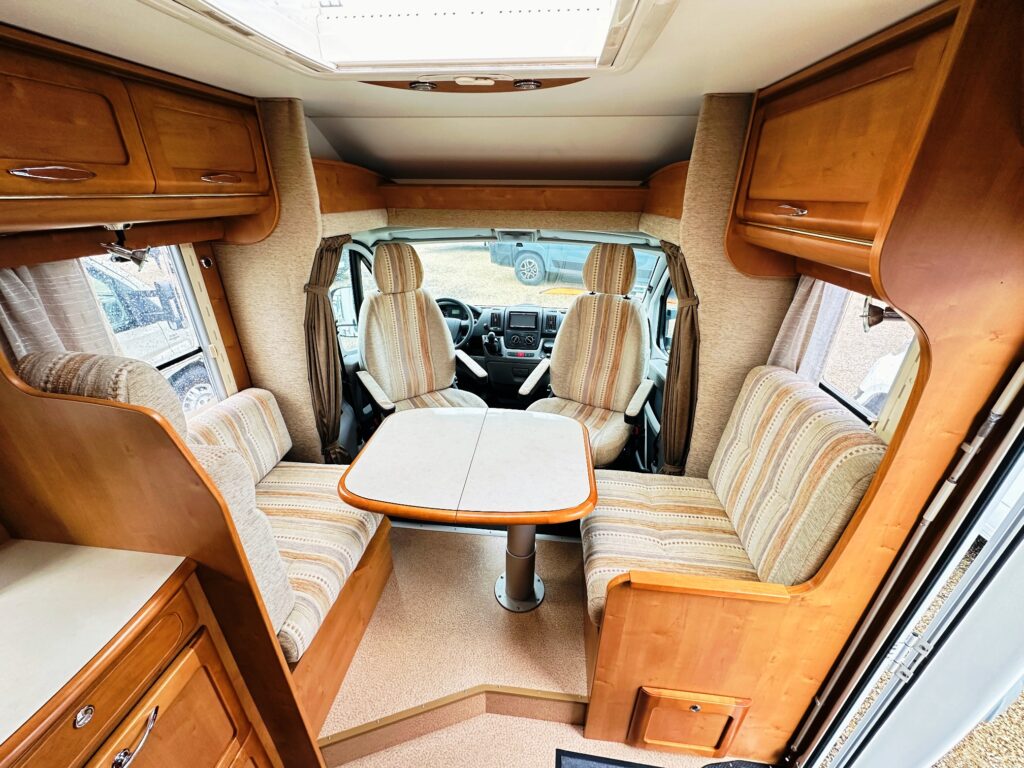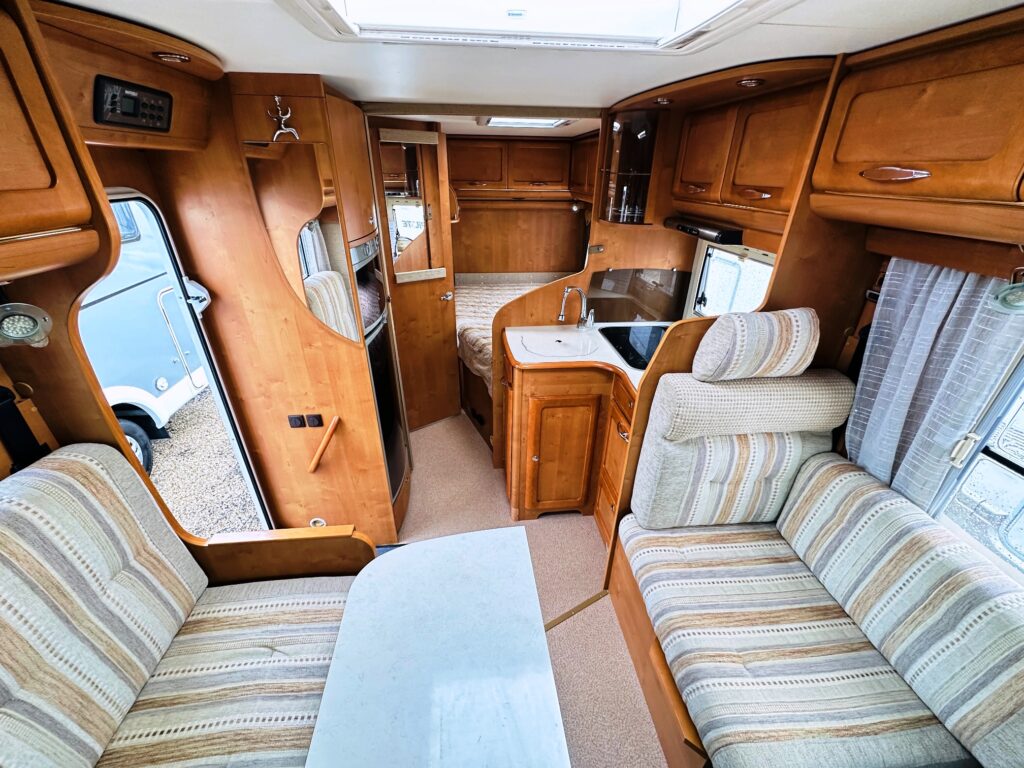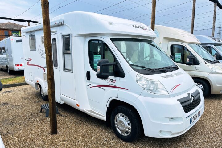 Profilé compact (6.49 M) Rapido, fabrication Française haut de gamme, agencement confortable avec un lit à la Française, 3 couchages, belle salle de bain avec douche séparée, une cuisine en L équipée d’un grand frigo automatique et un vaste salon avant avec banquettes latérales, table centrale et sièges cabines pivotants convertible en un couchage d’appoint.