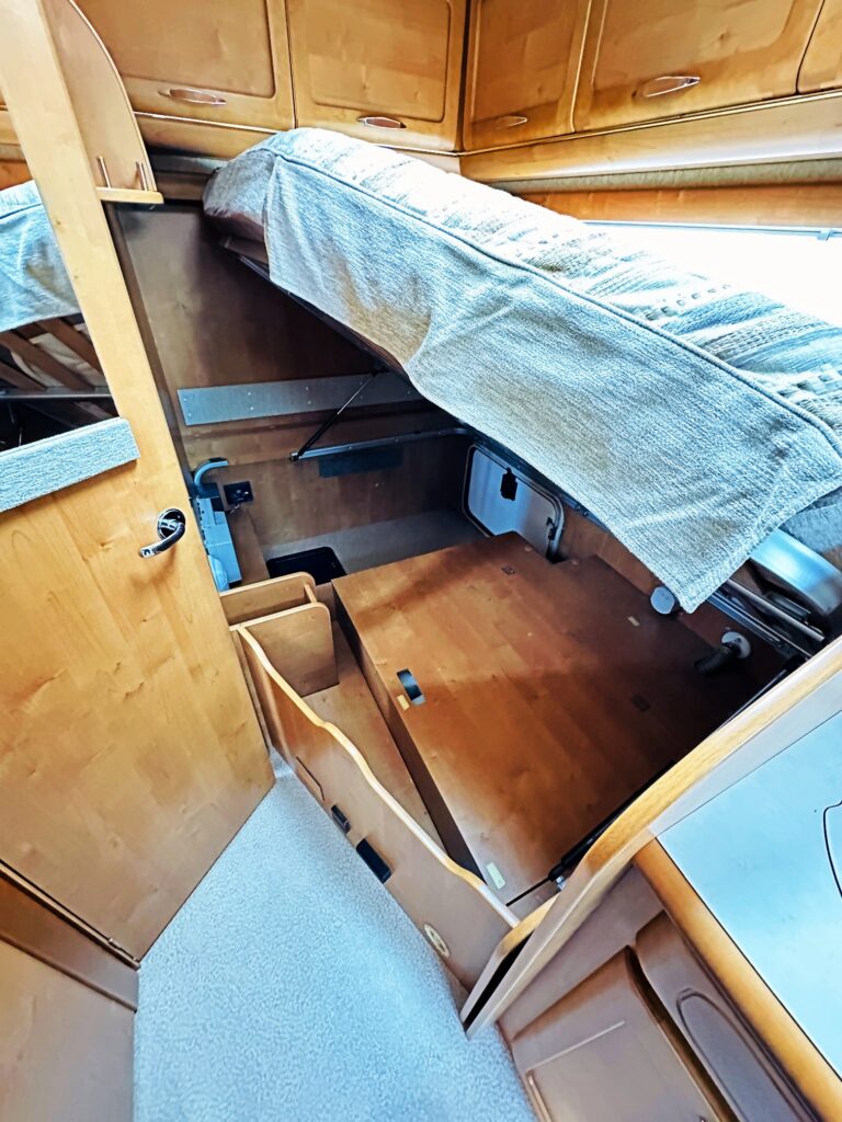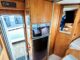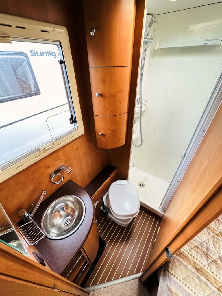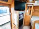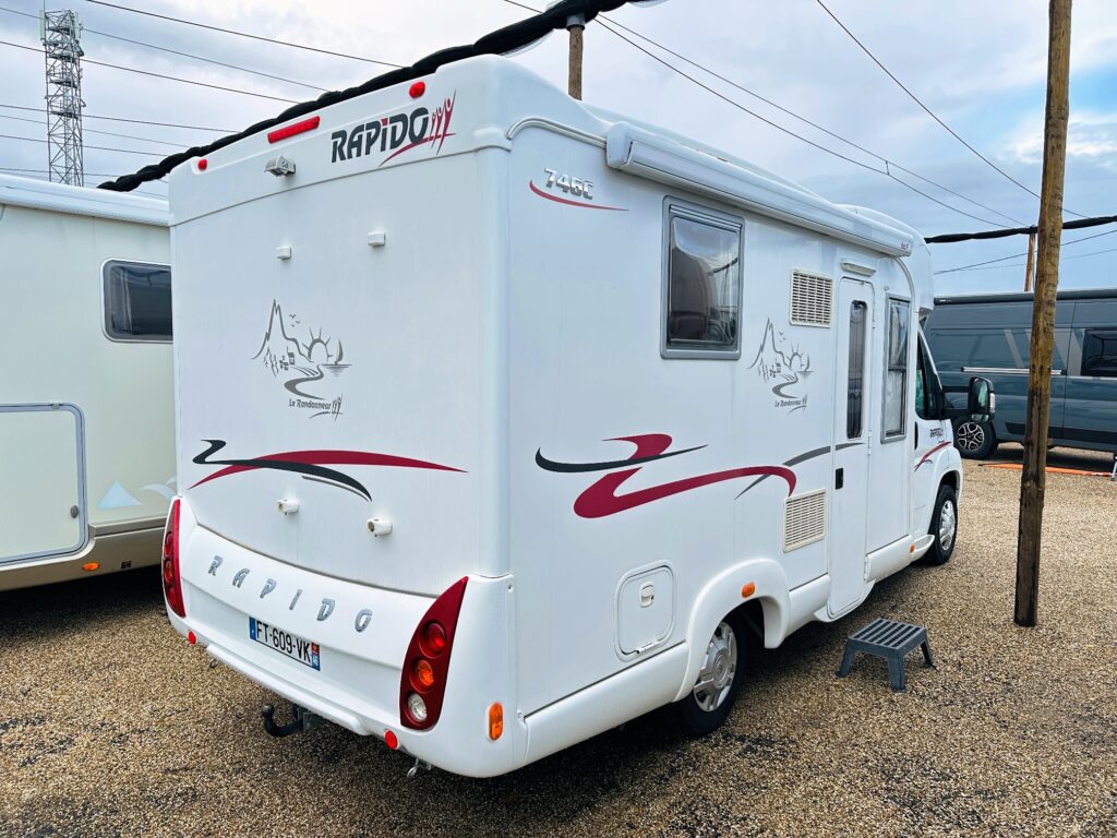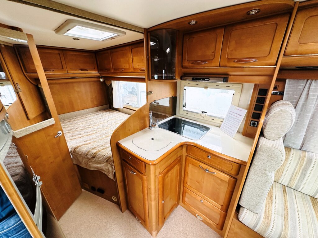 Profilé compact (6.49 M) Rapido, fabrication Française haut de gamme, agencement confortable avec un lit à la Française, 3 couchages, belle salle de bain avec douche séparée, une cuisine en L équipée d’un grand frigo automatique et un vaste salon avant avec banquettes latérales, table centrale et sièges cabines pivotants convertible en un couchage d’appoint.