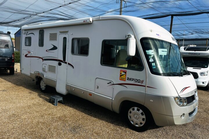 Intégral Rapido poids lourd (3.88 T), lit transversal sur immense soute garage, 4 couchages, salle de bain avec grande douche entièrement séparée, cuisine spacieuse et toute équipée, vaste salon avant avec sièges pivotant et table centrale, lit pavillon en cabine pour deux adultes.