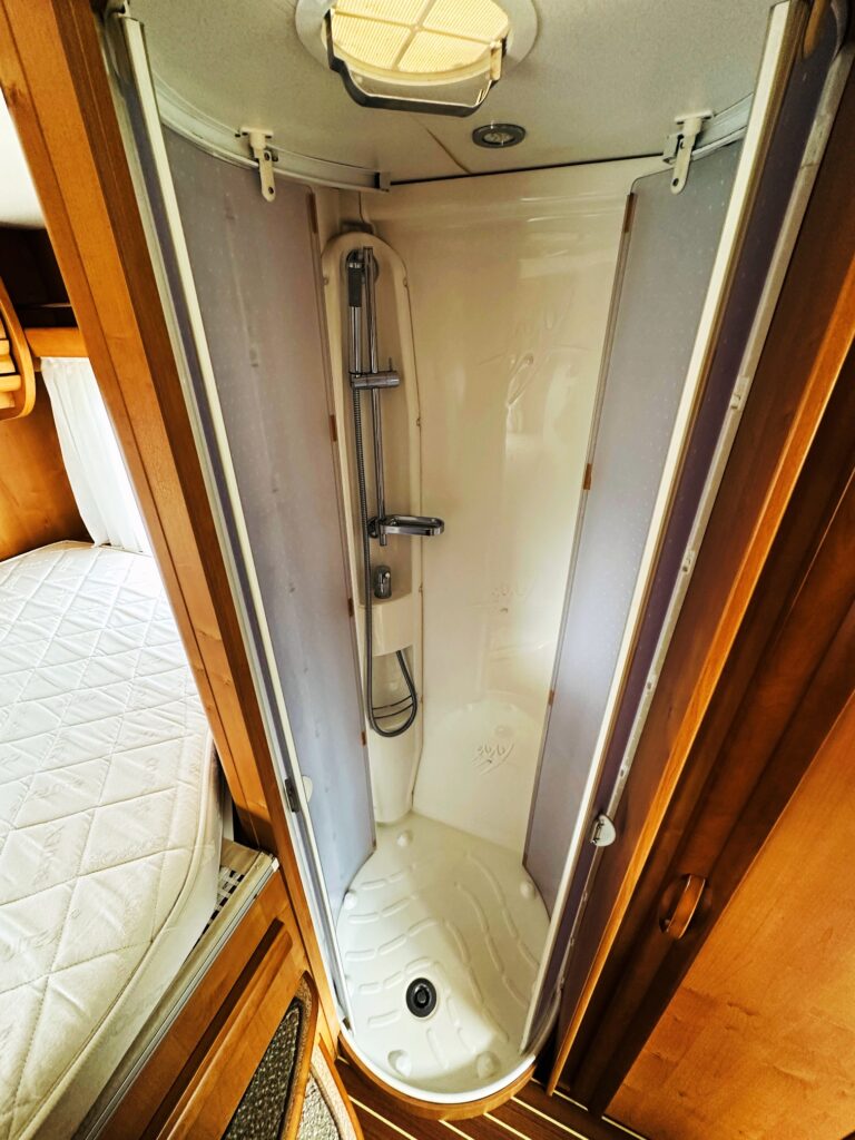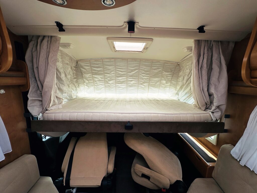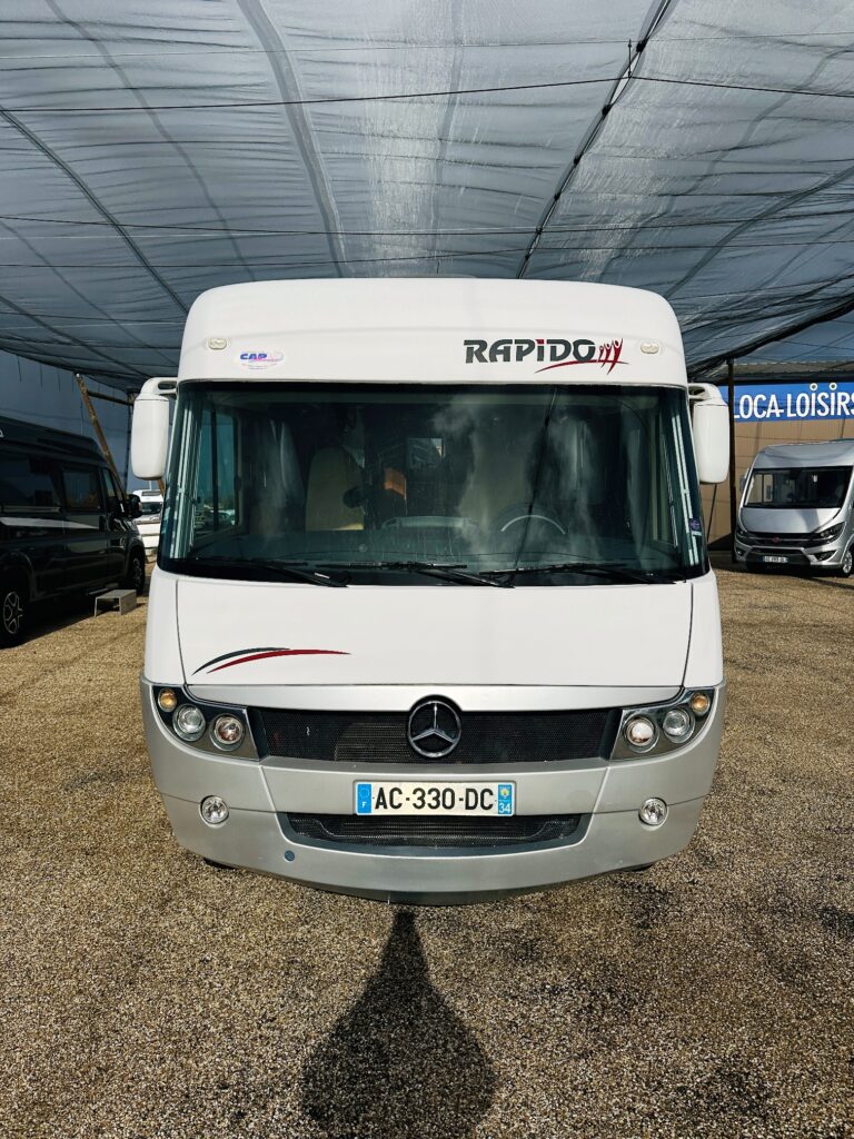 Intégral Rapido poids lourd (3.88 T), lit transversal sur immense soute garage, 4 couchages, salle de bain avec grande douche entièrement séparée, cuisine spacieuse et toute équipée, vaste salon avant avec sièges pivotant et table centrale, lit pavillon en cabine pour deux adultes.