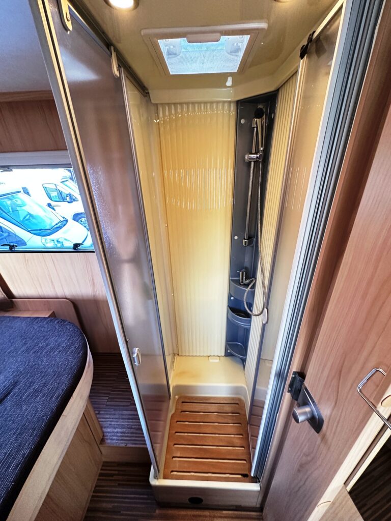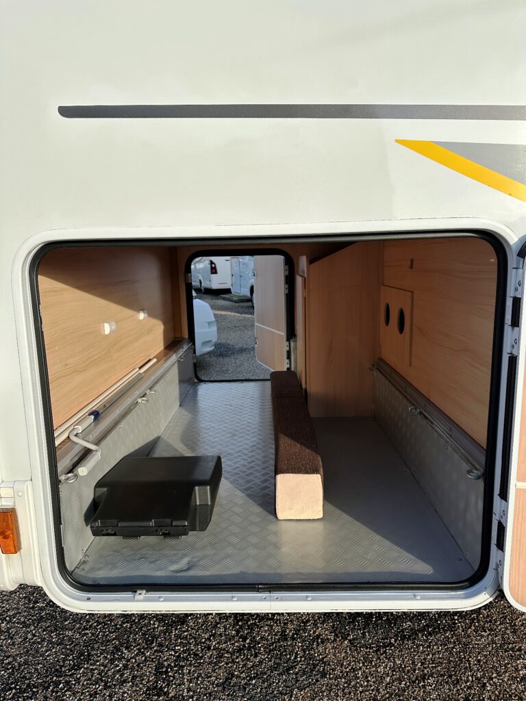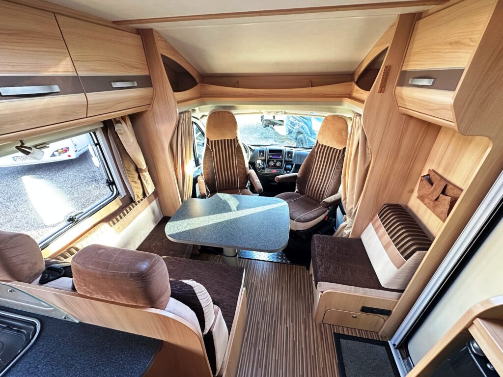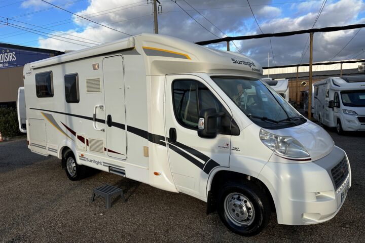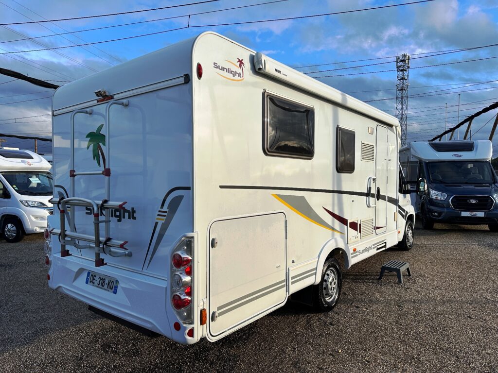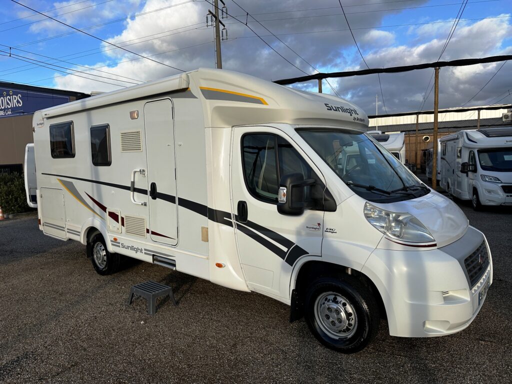 Profilé Sunlight, 3 couchages, lit central sur soute garage (plusieurs vélos), salle de bain avec grande douche entièrement séparée, fermeture chambre arrière, cuisine spacieuse et toute équipée, vaste salon avant avec sièges pivotant et table centrale convertible en un couchage d’appoint.
