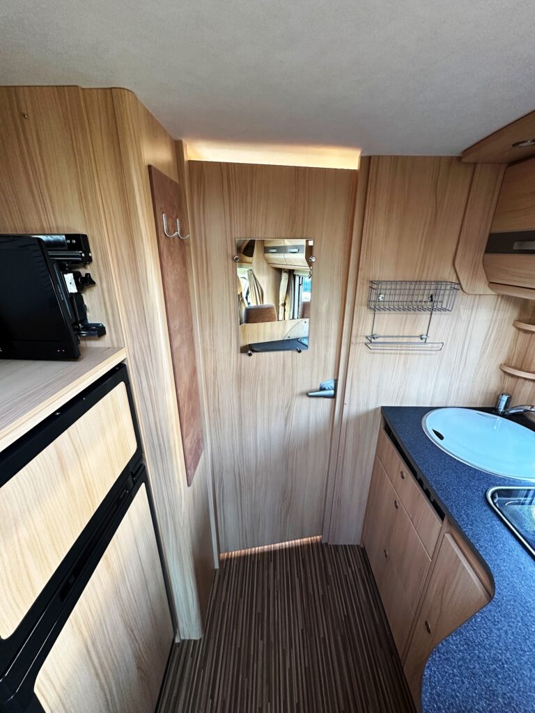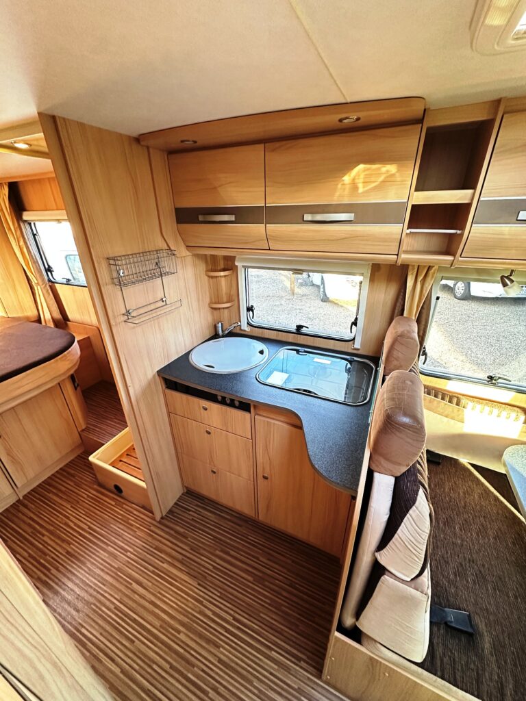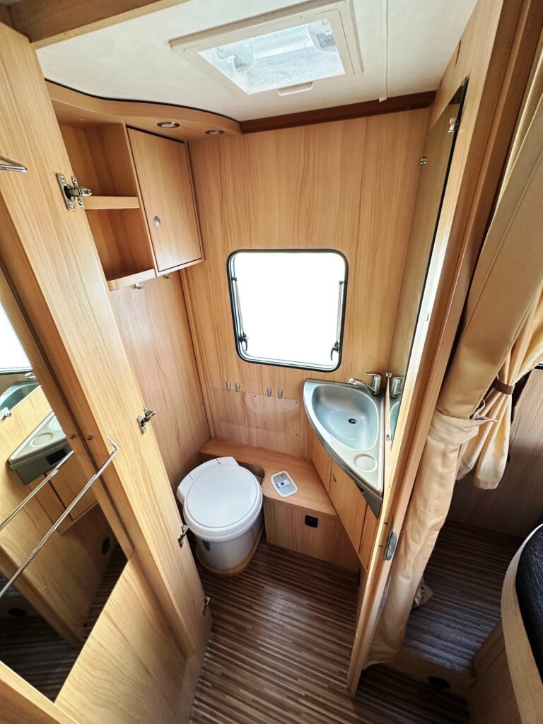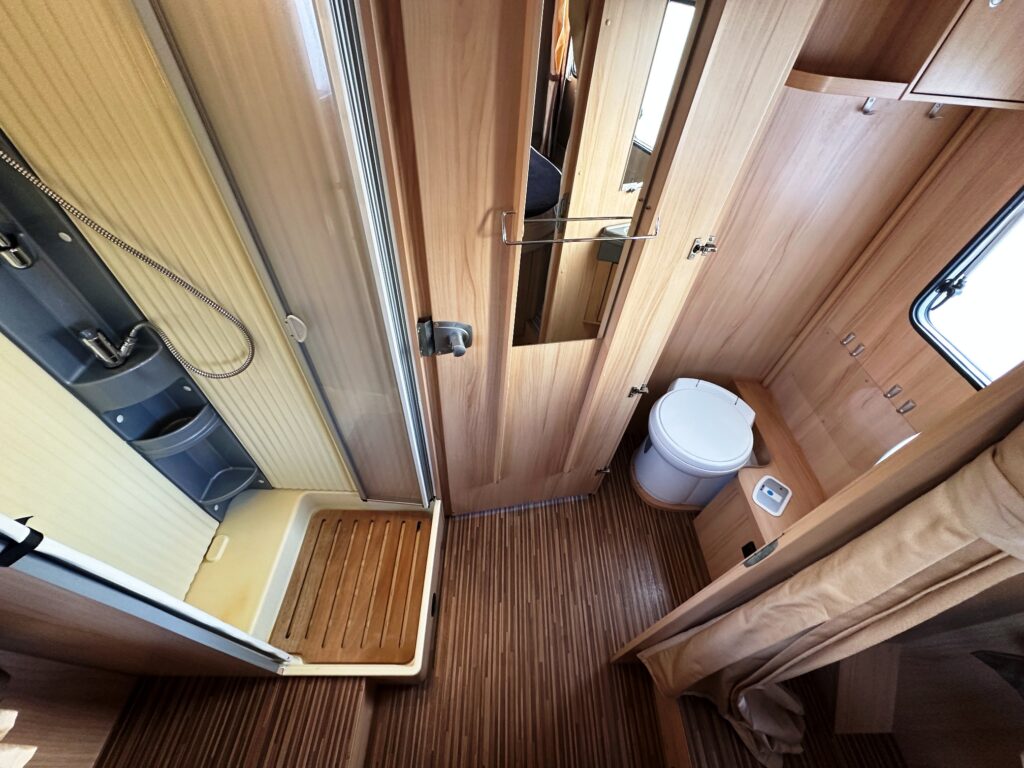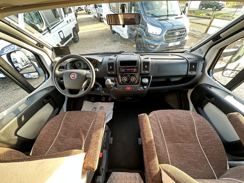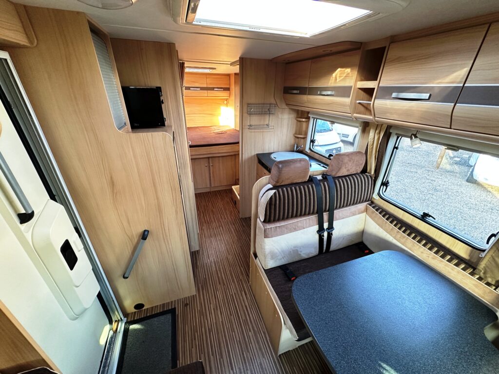 Profilé Sunlight, 3 couchages, lit central sur soute garage (plusieurs vélos), salle de bain avec grande douche entièrement séparée, fermeture chambre arrière, cuisine spacieuse et toute équipée, vaste salon avant avec sièges pivotant et table centrale convertible en un couchage d’appoint.