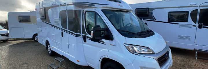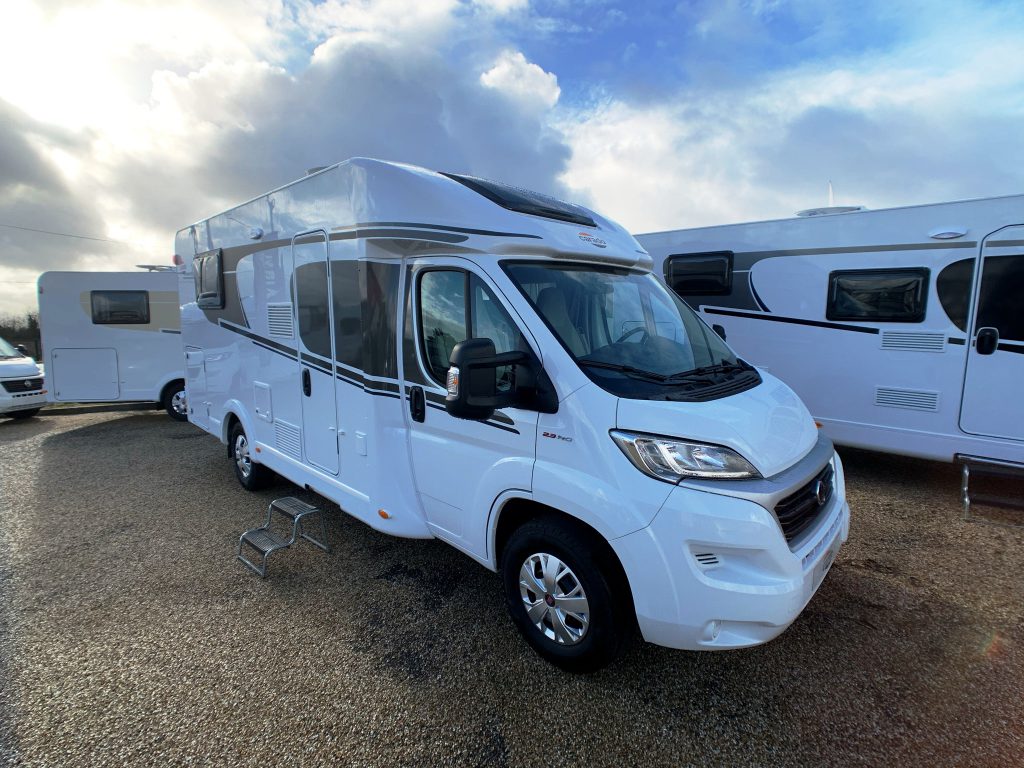 Profilé 4 couchages avec lit central 2 places et lit pavillon 2 couchages, dinette avant avec sièges pivotant, salle de bain avec douche indépendante, penderie, grand coffre de rangement sous le lit arrière, longueur : 7.40 M